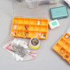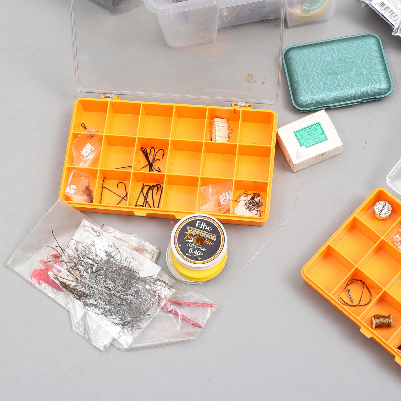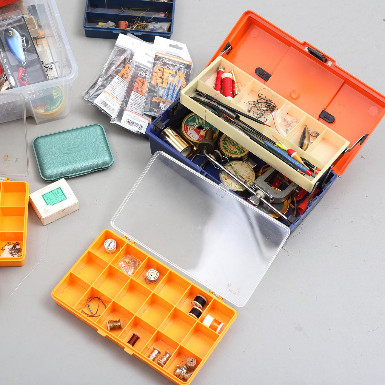 3 boxes with tools and materials for the manufacture of flies.