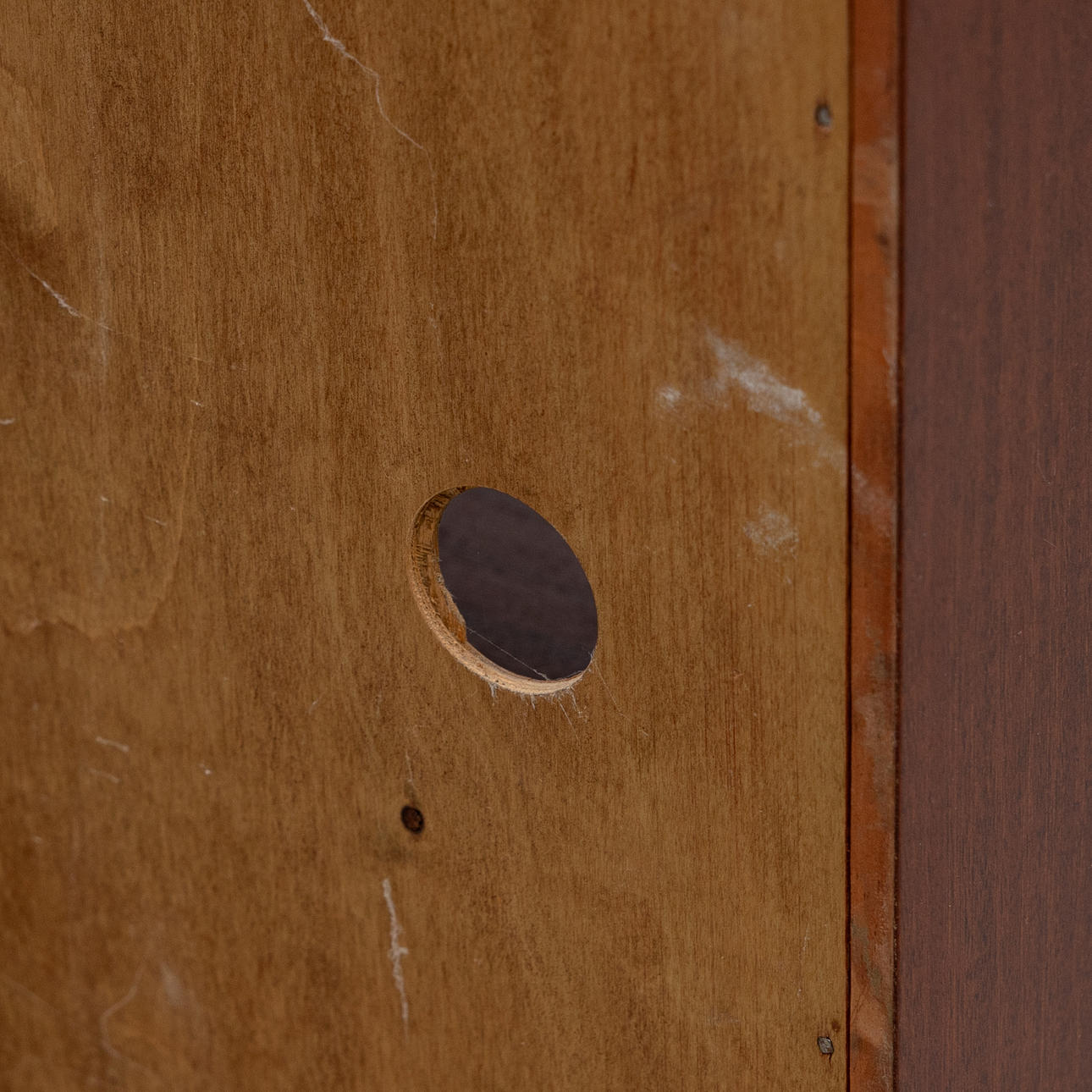 Normal wear and tear, marks, edge wear, veneer loss. Back cover with later cut out hole.