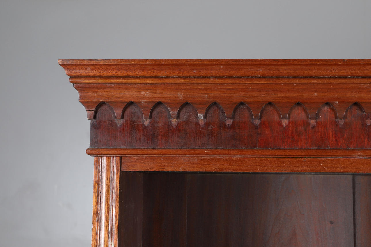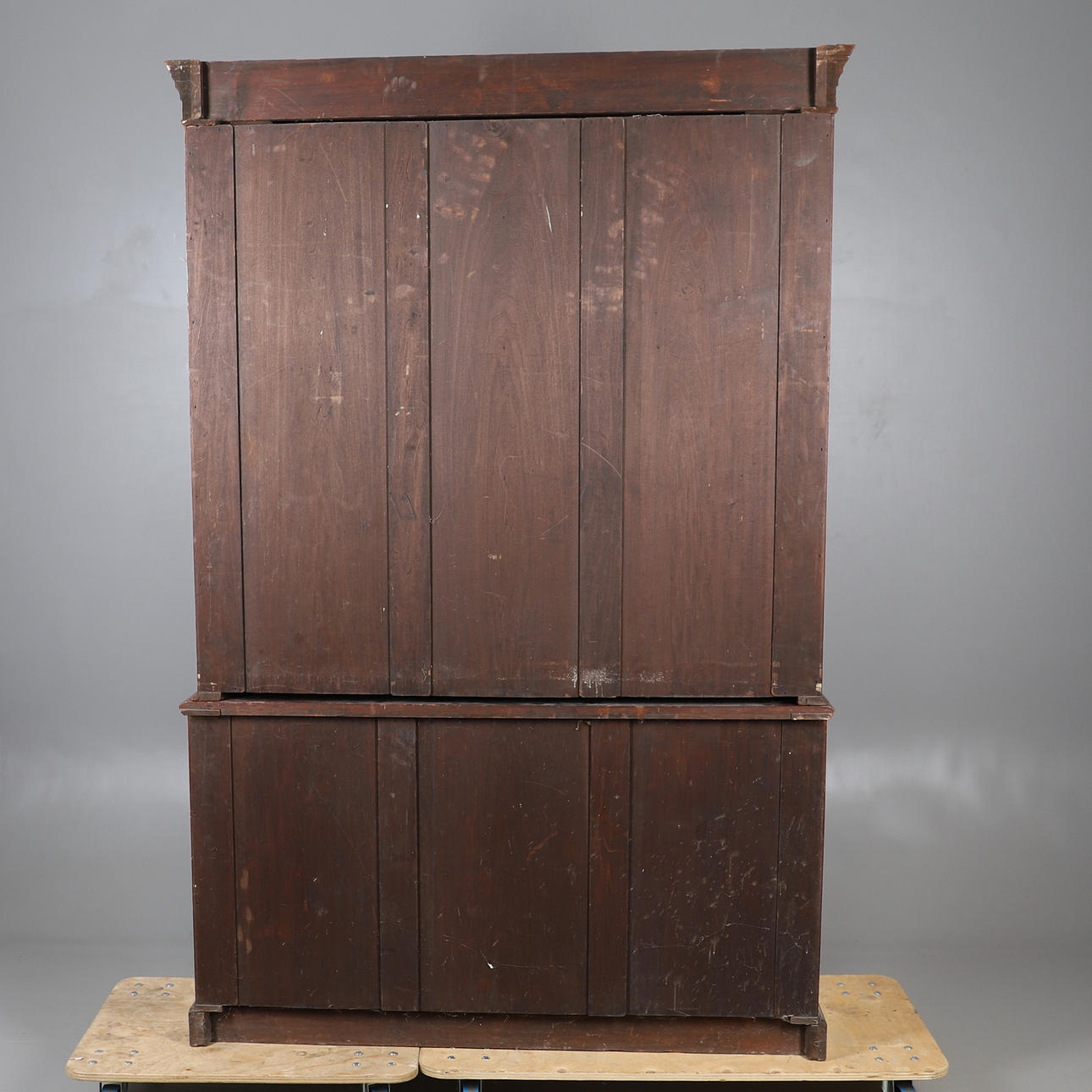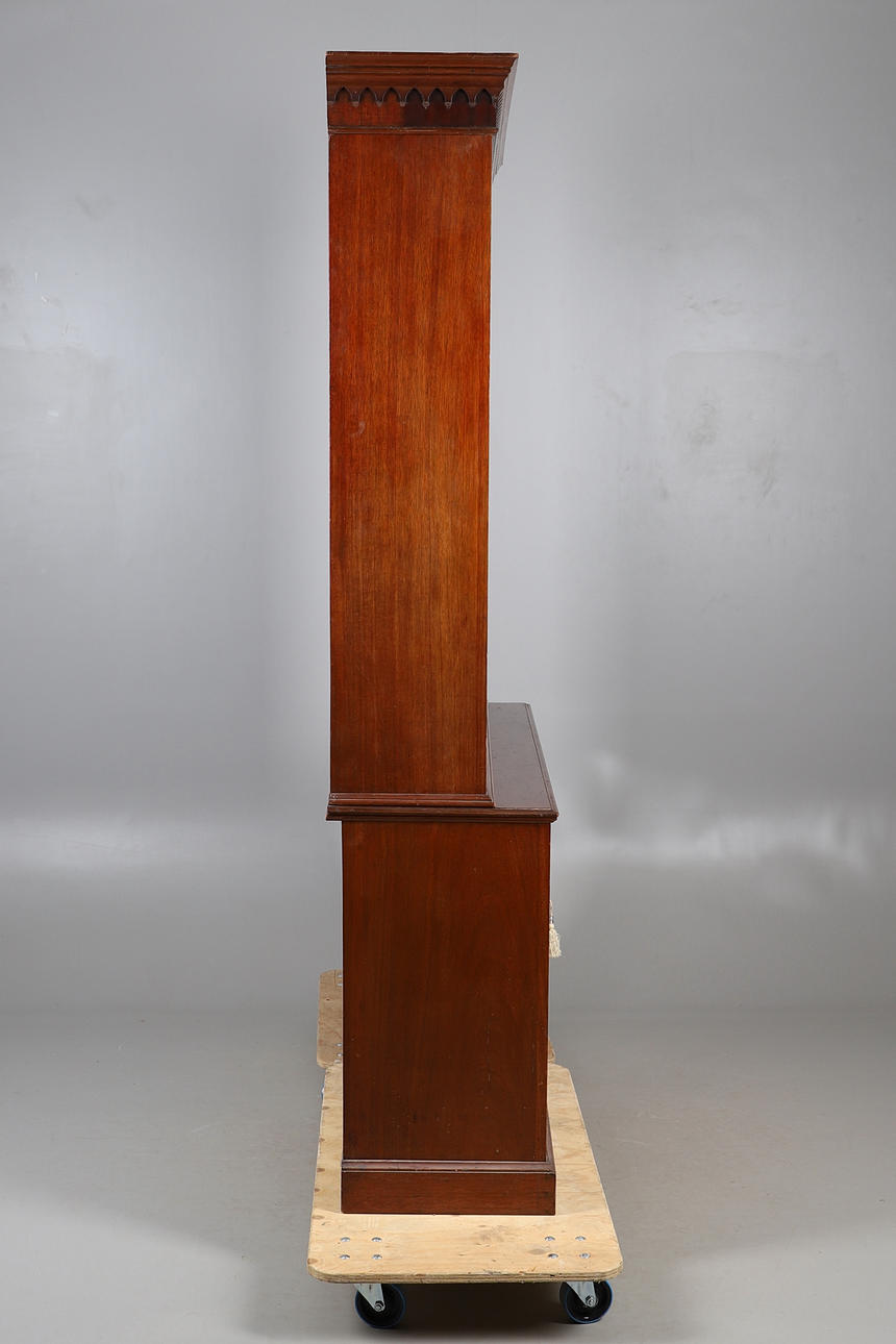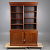 A large mahogany bookcase in two sections, with adjustable shelving to the top sections above two large cupboards. With a seperate cornice with detailing. 223cms high, 144cms across.