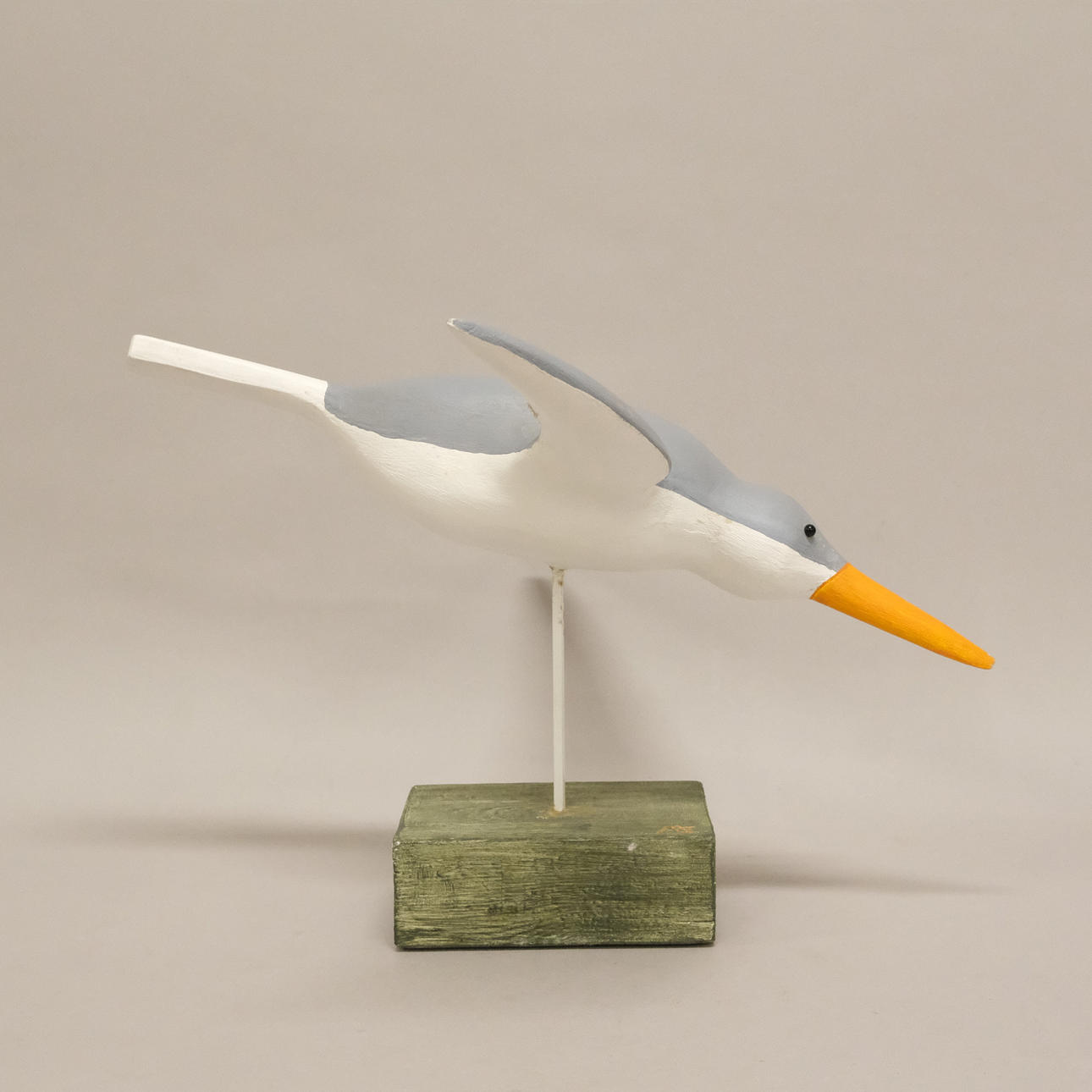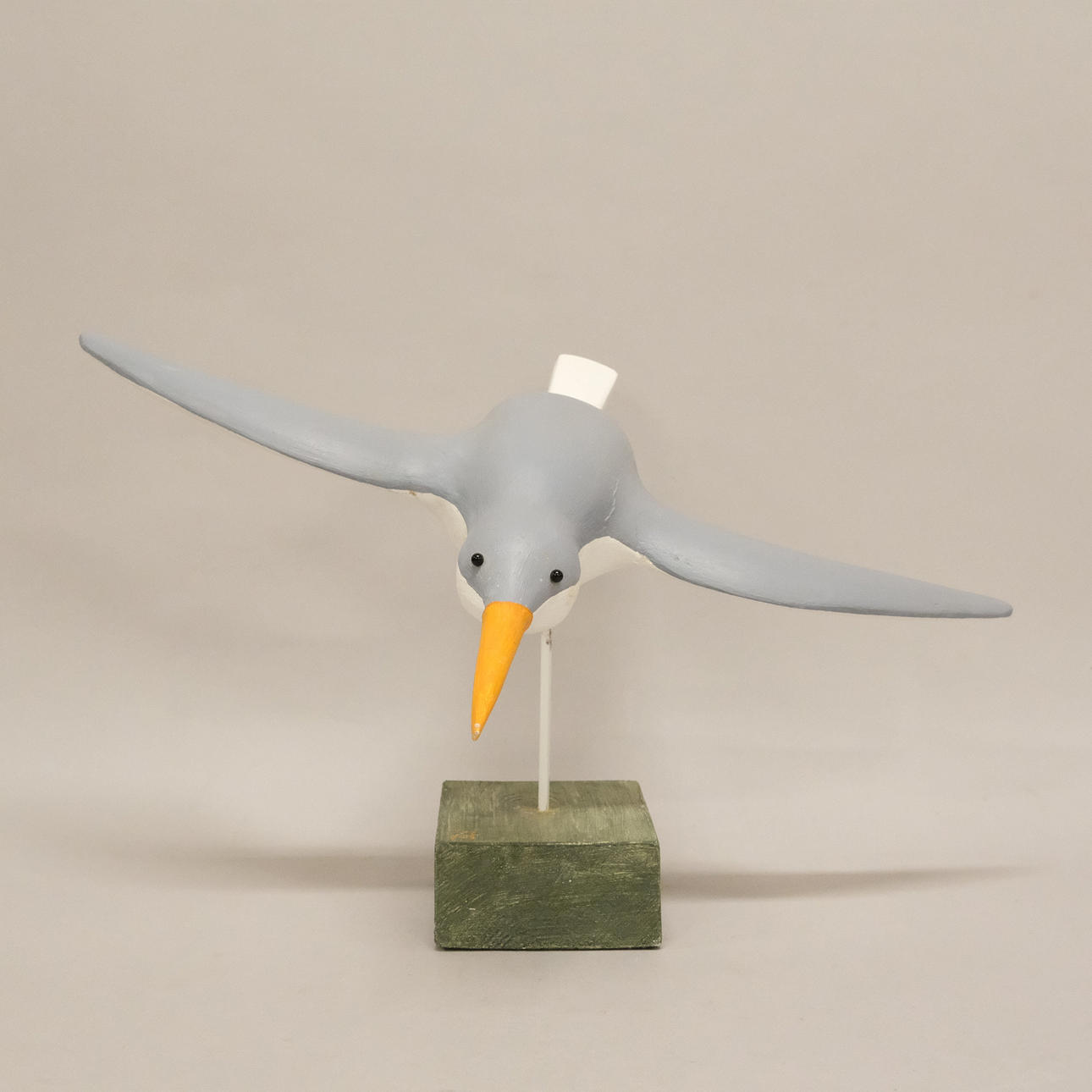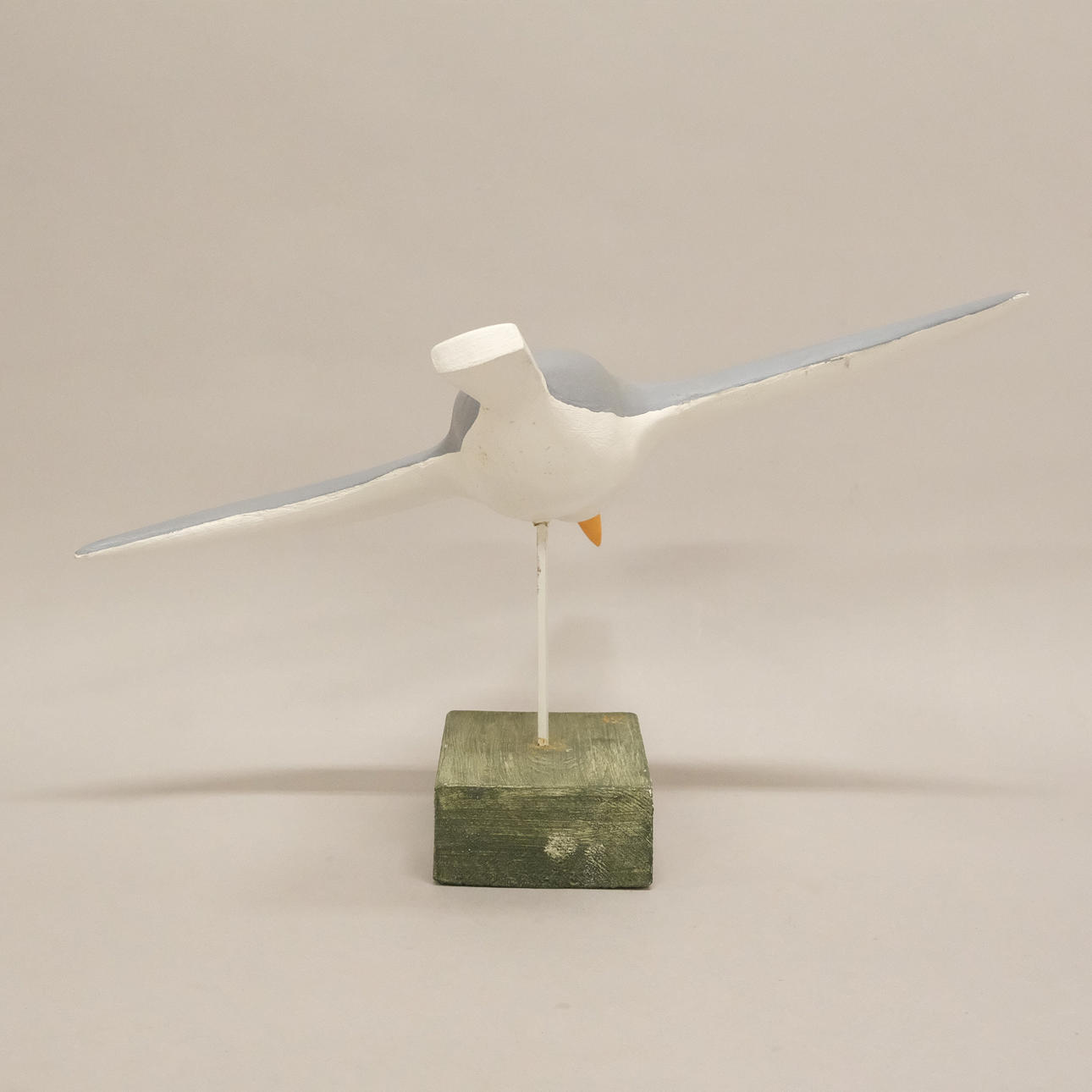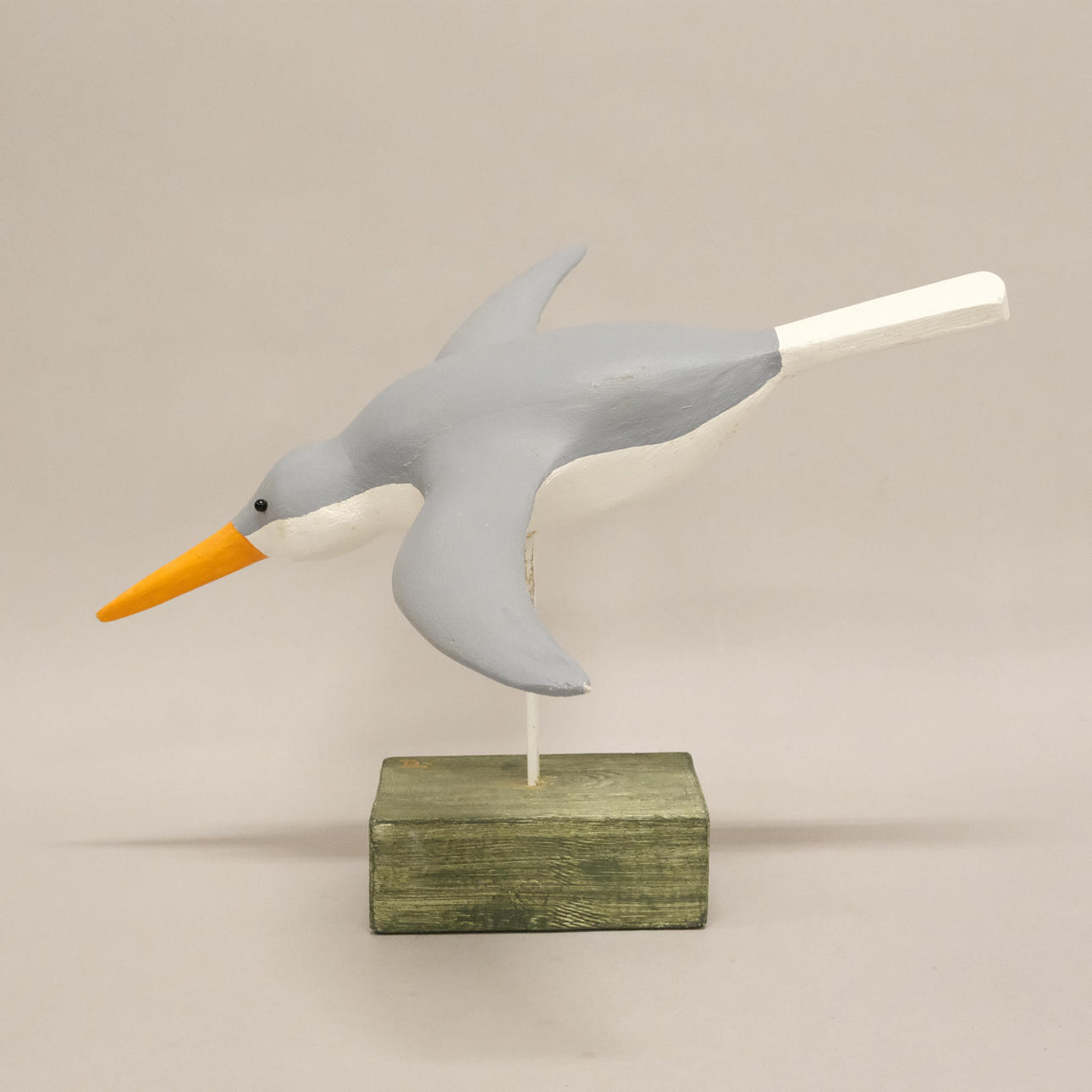 Flying bird in wood on plinth, height 25 cm, length 38 cm, width 42 cm.