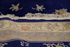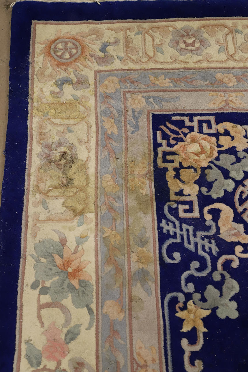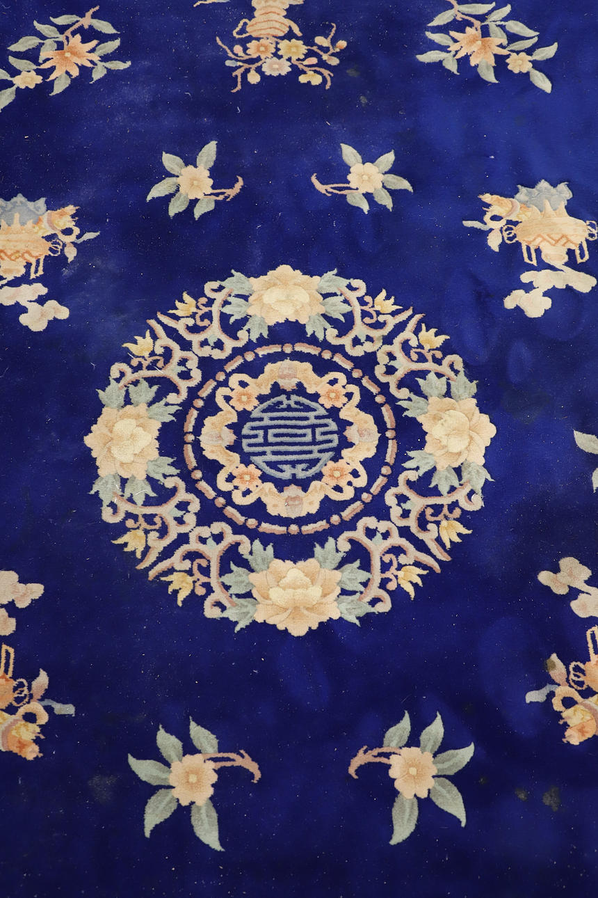 with central geometric medallion on a blue field depicting flowers, bats and shou symbols, within multiple floral borders, 370cm x 278cm.
