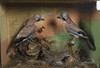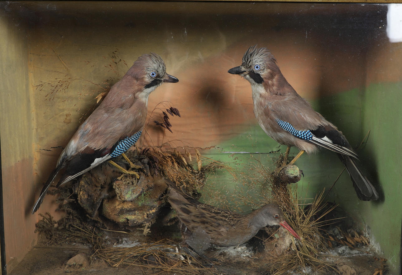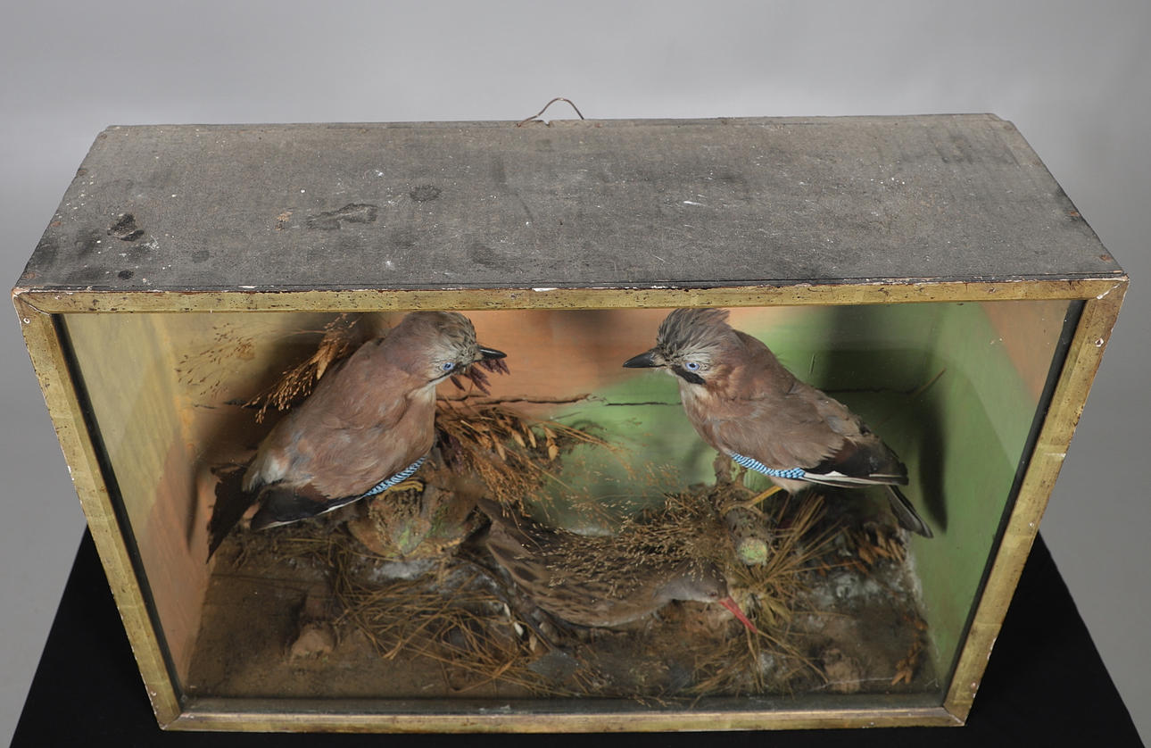 Two Jay's and a Water Rail mounted in a naturalistic setting, in a glazed and wooden case. Case 61cms across, 43cms high.