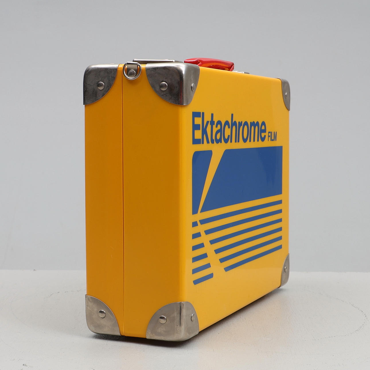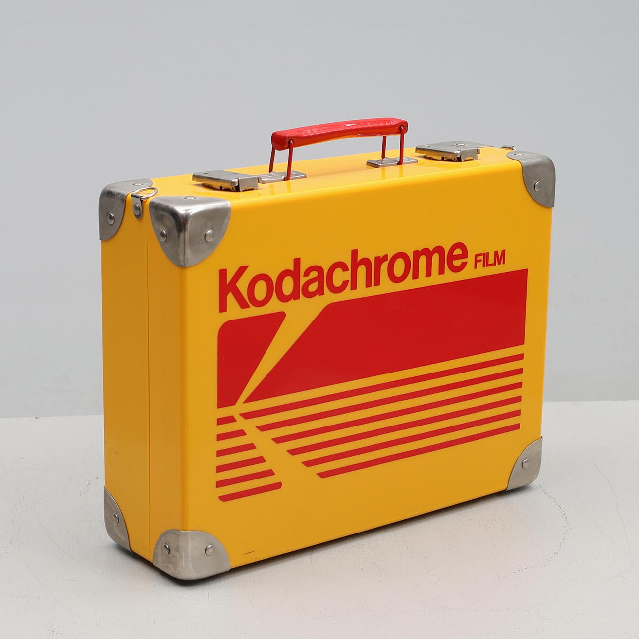 Kodak bag with the text “Ektachrome FILM” and “Kodachrome FILM”. Metal fittings in the corners, as well as metal buckles for closing.