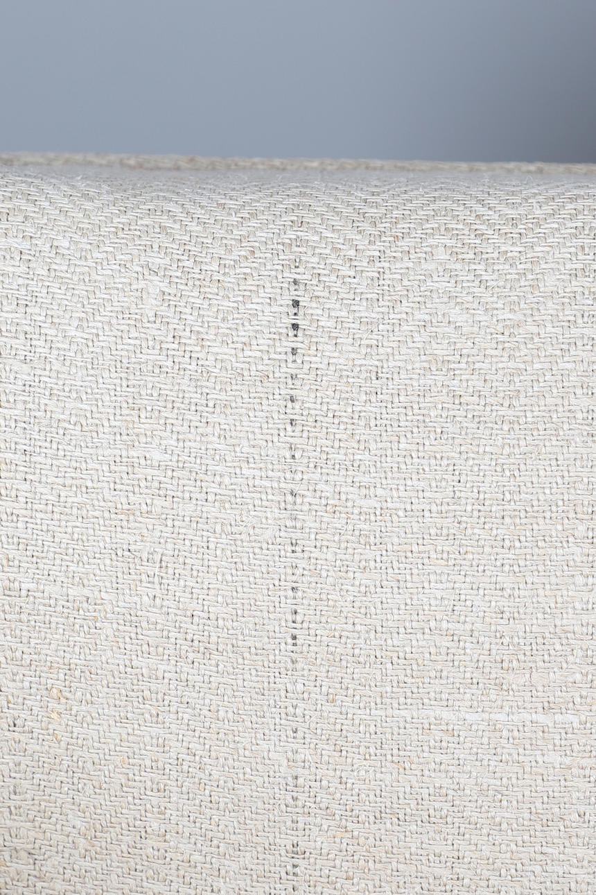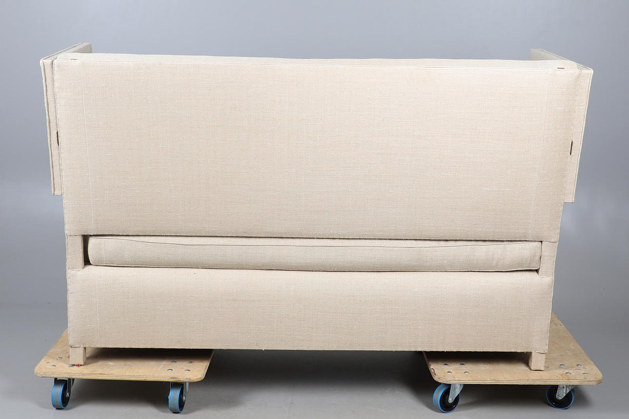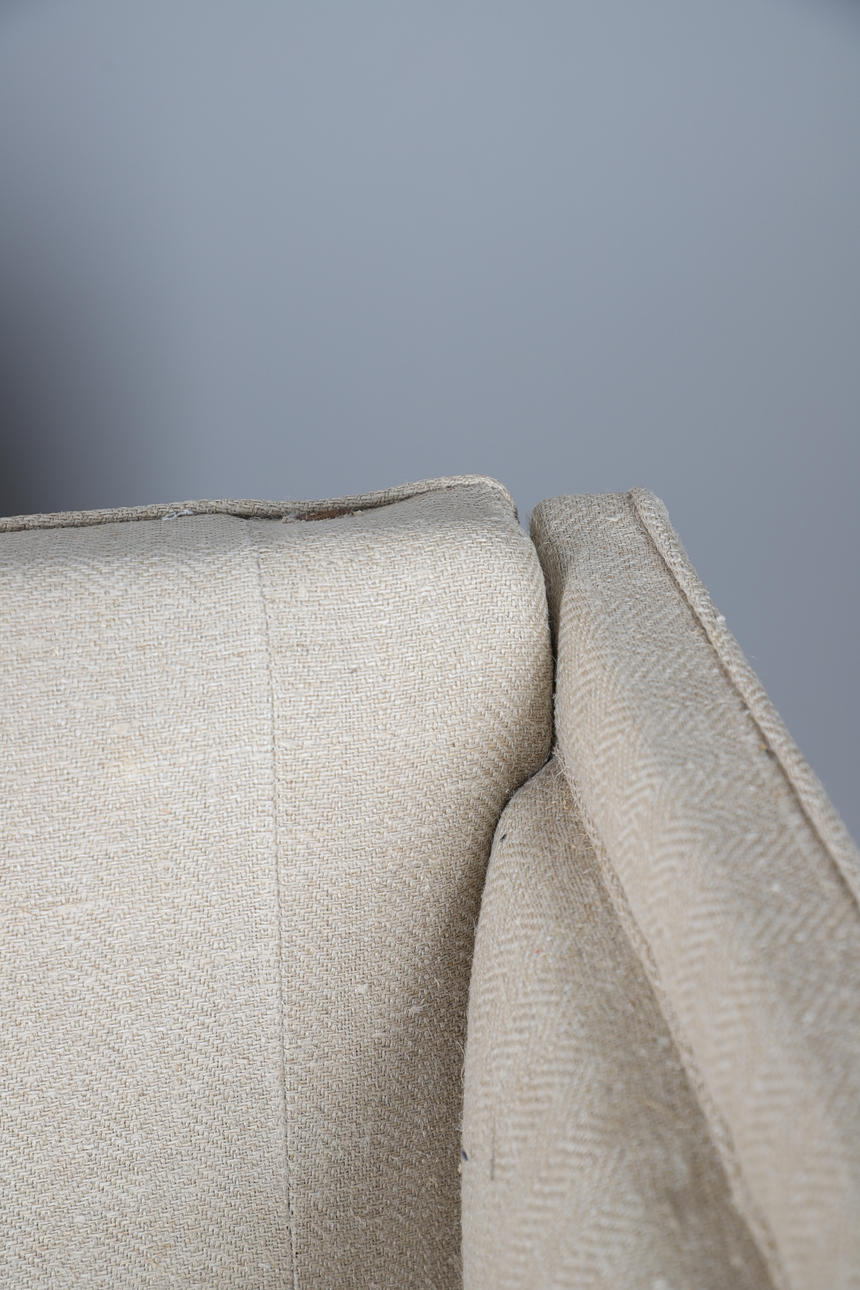 with straight back and drop-down ends (ratchet mechanism covered), upholstered in contemporary Russian Hemp Linen, 111cm high x 177cm long x 76cm deep.