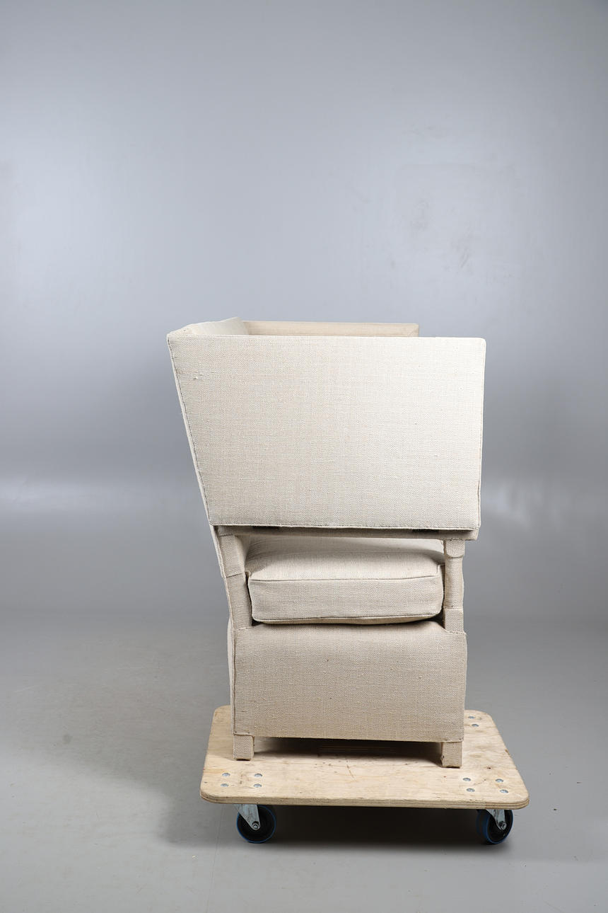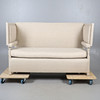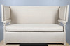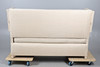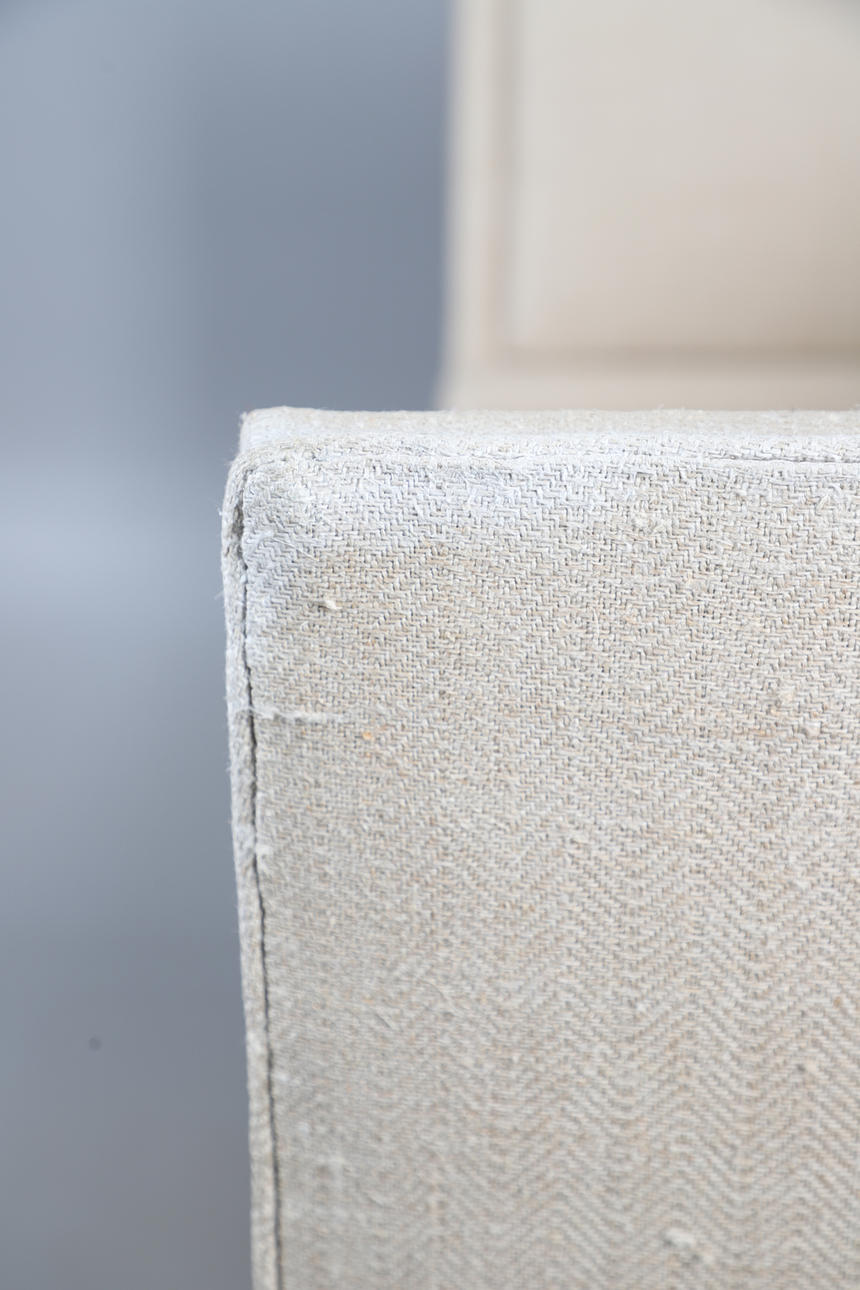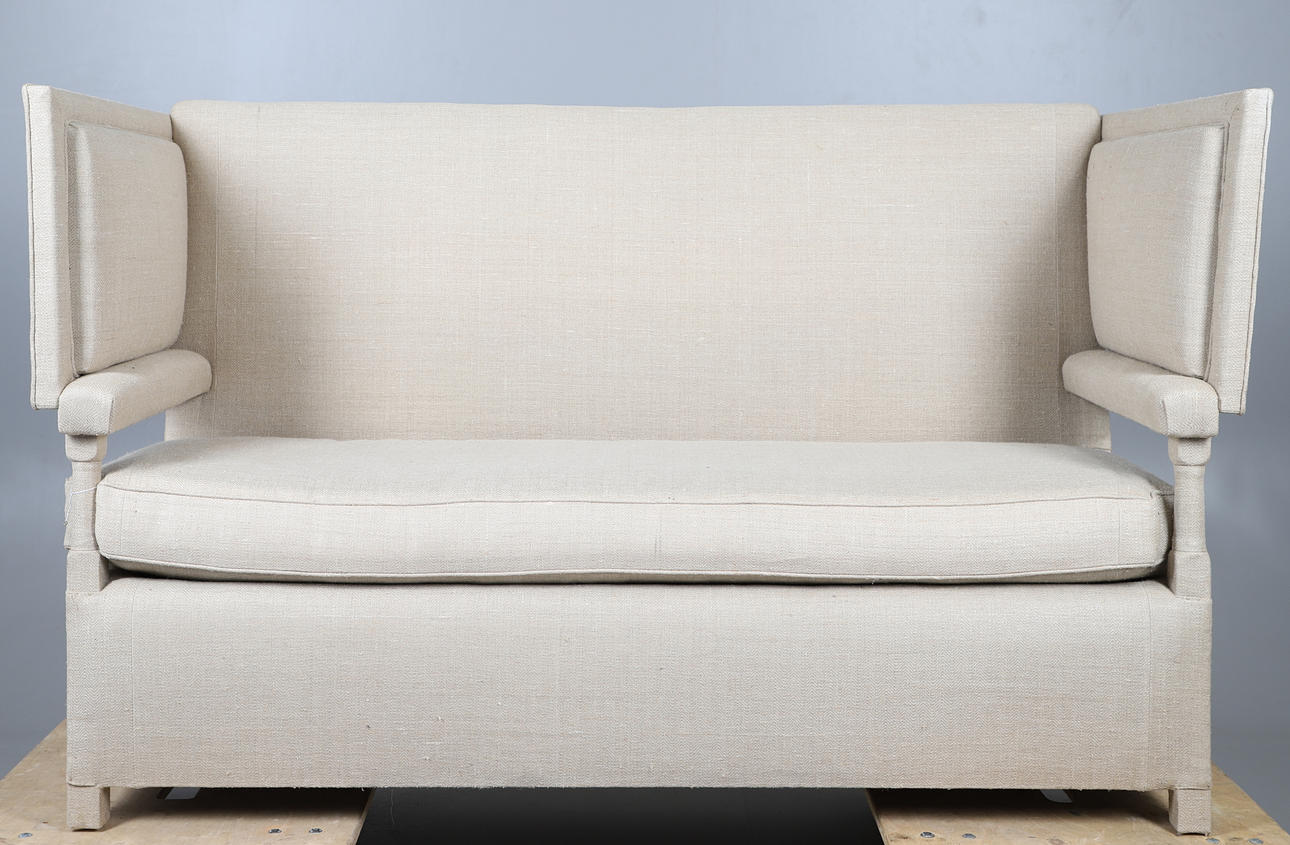 with straight back and drop-down ends (ratchet mechanism covered), upholstered in contemporary Russian Hemp Linen, 111cm high x 177cm long x 76cm deep.