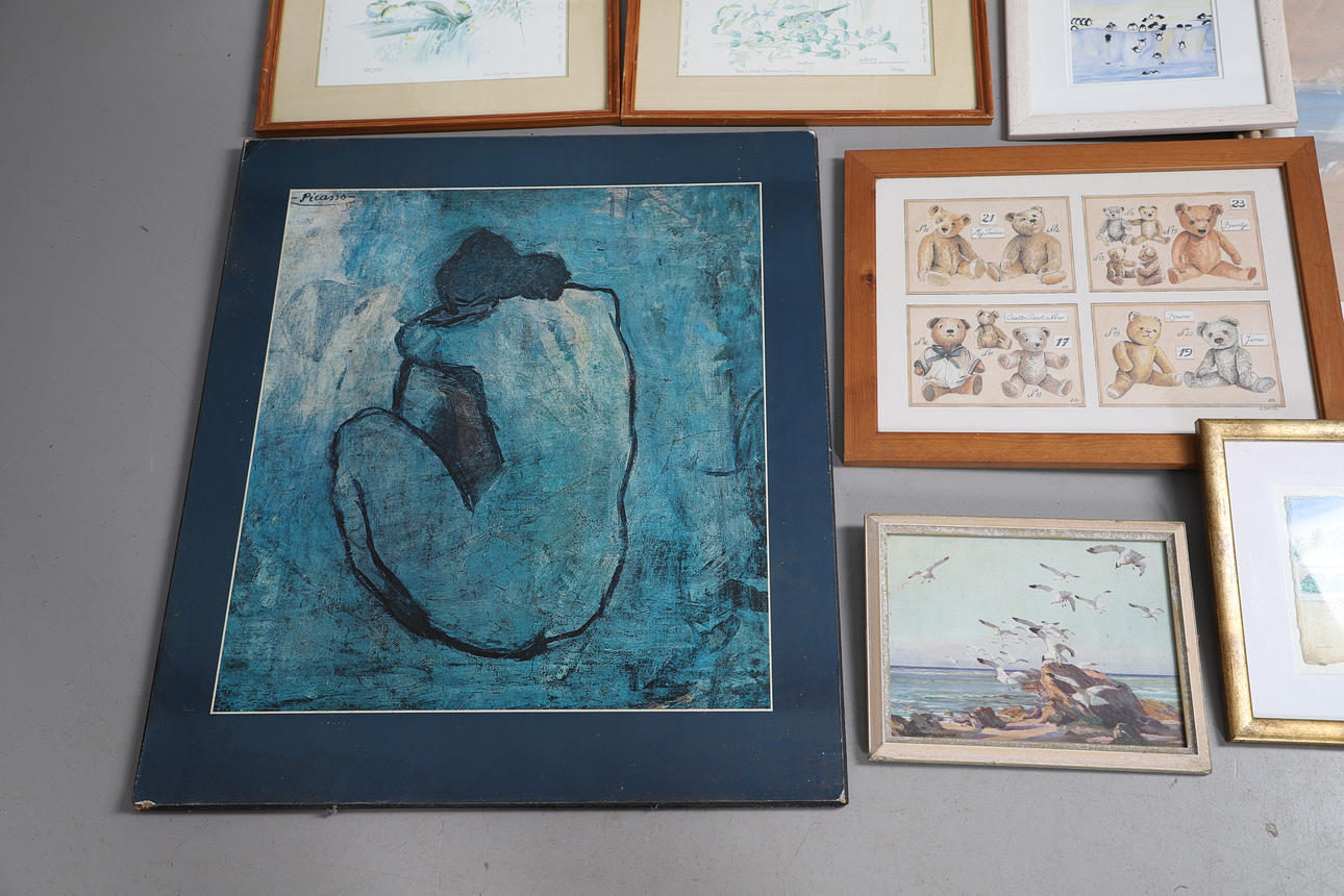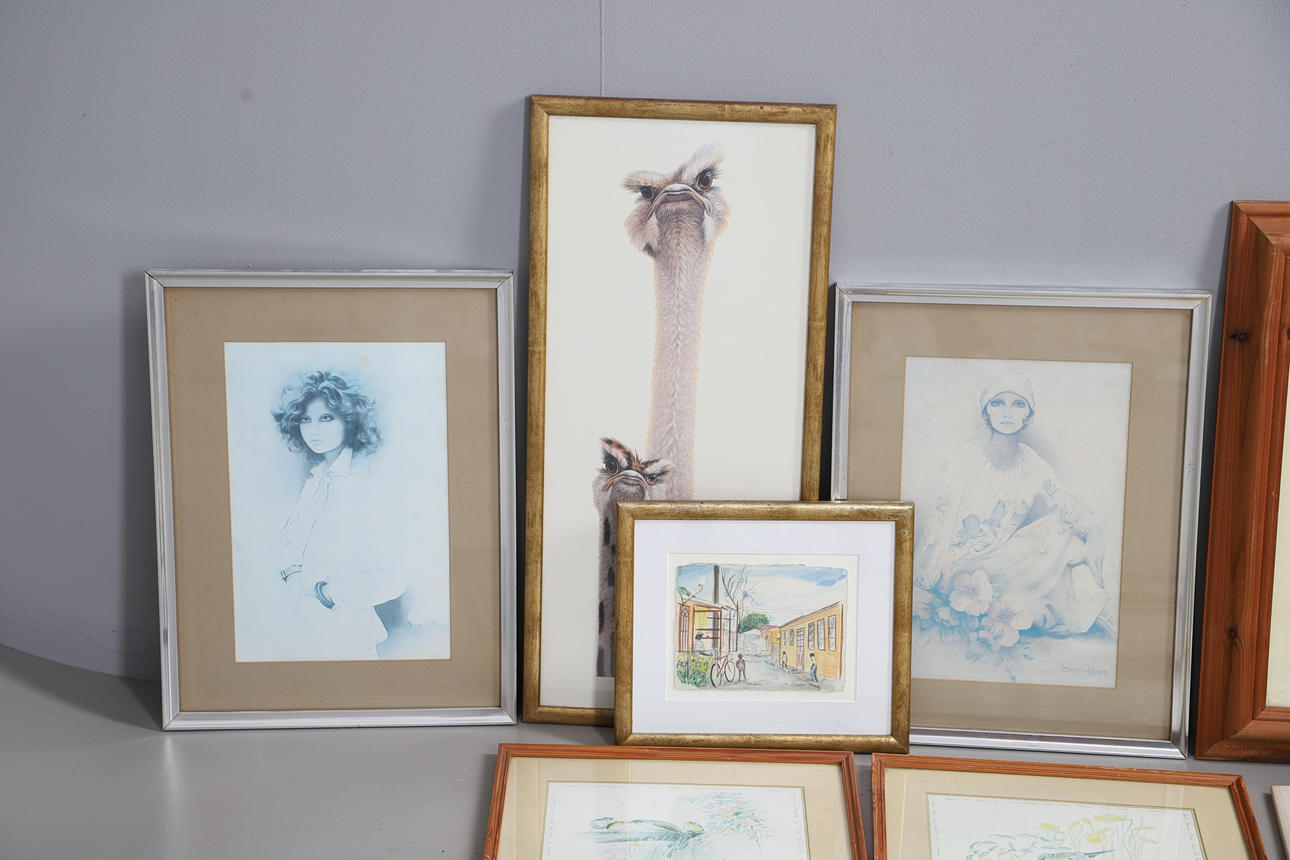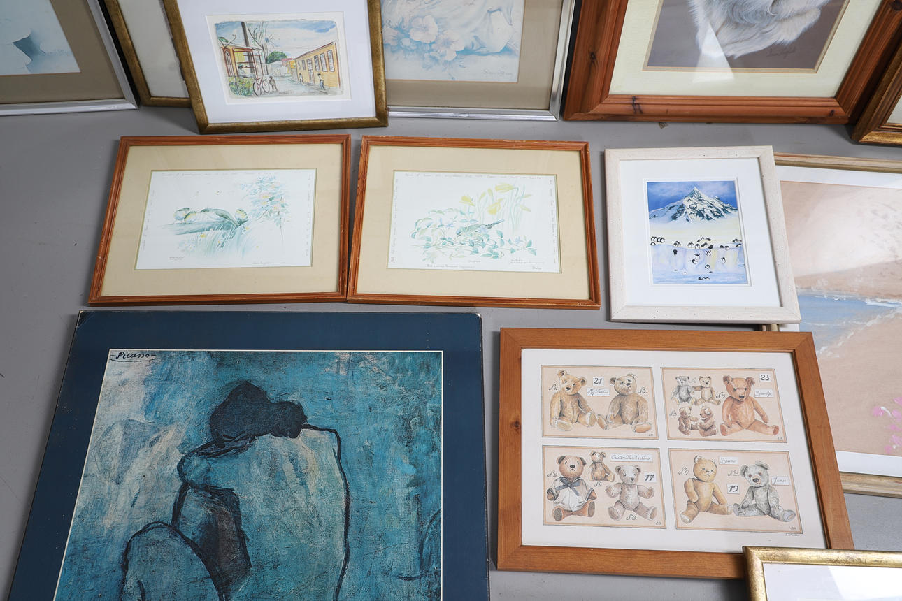 To include prints after Sylvane Alleyne, Pablo Picasso, a signed print of an Ostrich by Warwick Higgs, two watercolours of Barbados by Livingstone King etc..