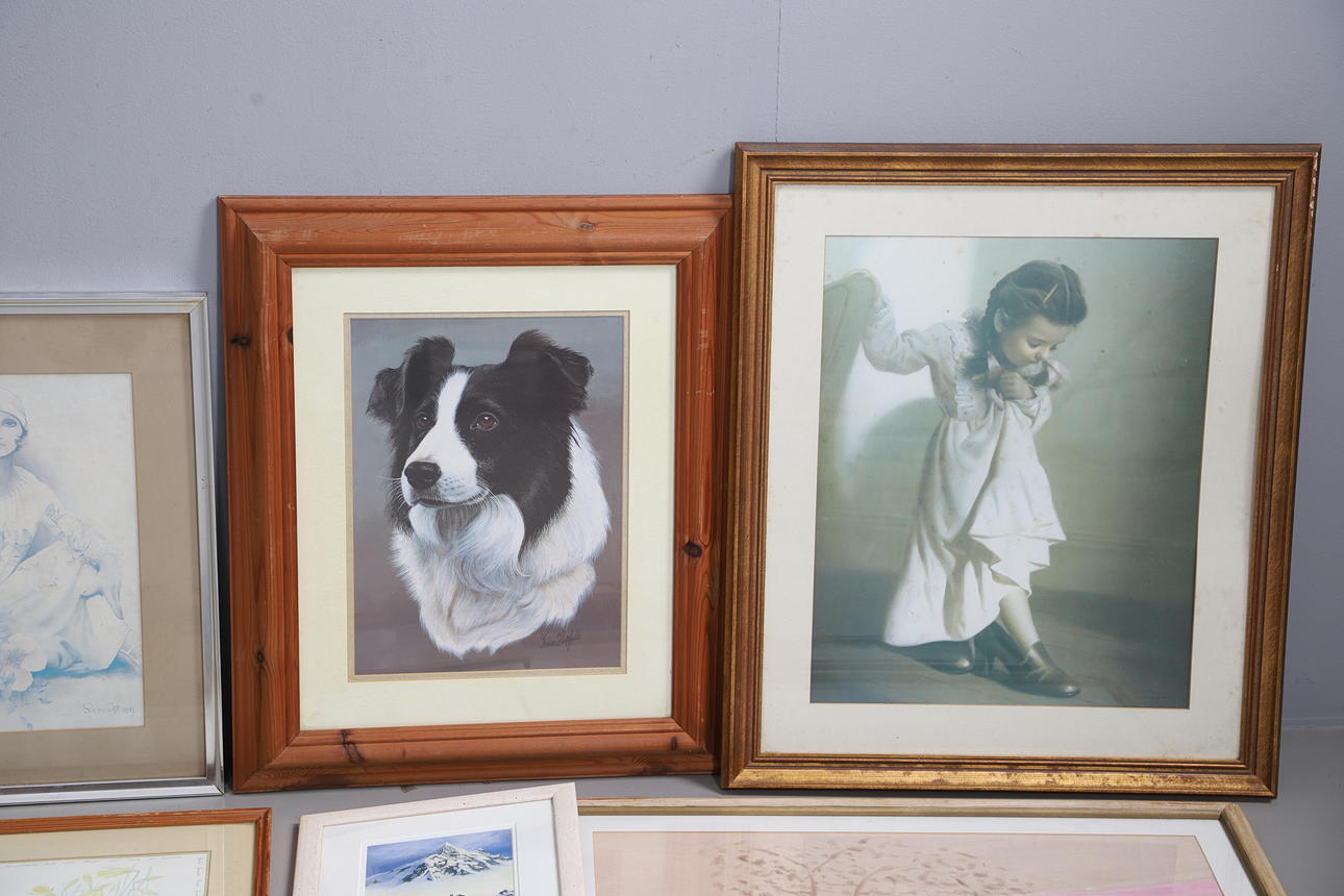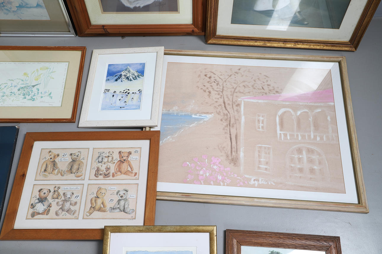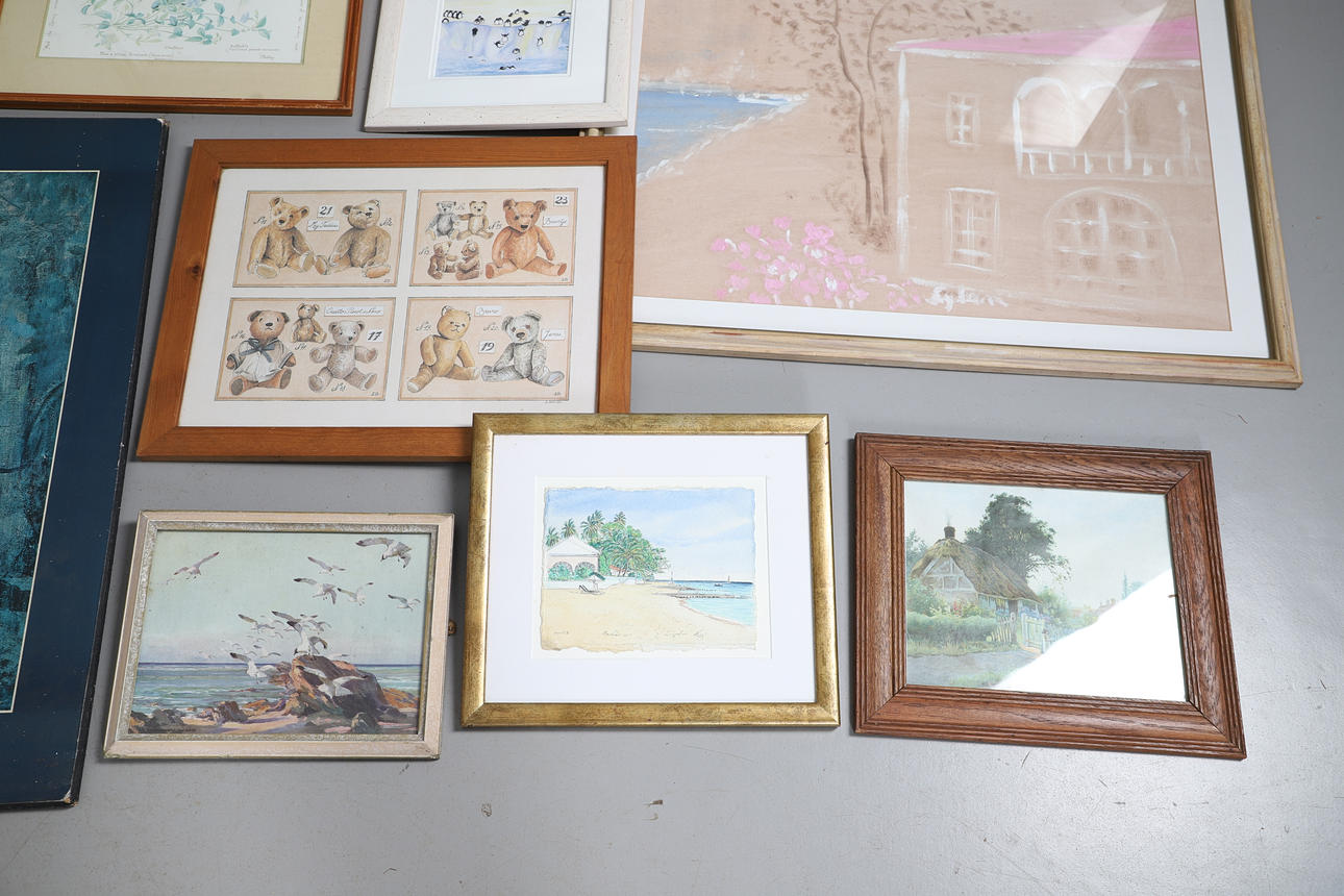 To include prints after Sylvane Alleyne, Pablo Picasso, a signed print of an Ostrich by Warwick Higgs, two watercolours of Barbados by Livingstone King etc..