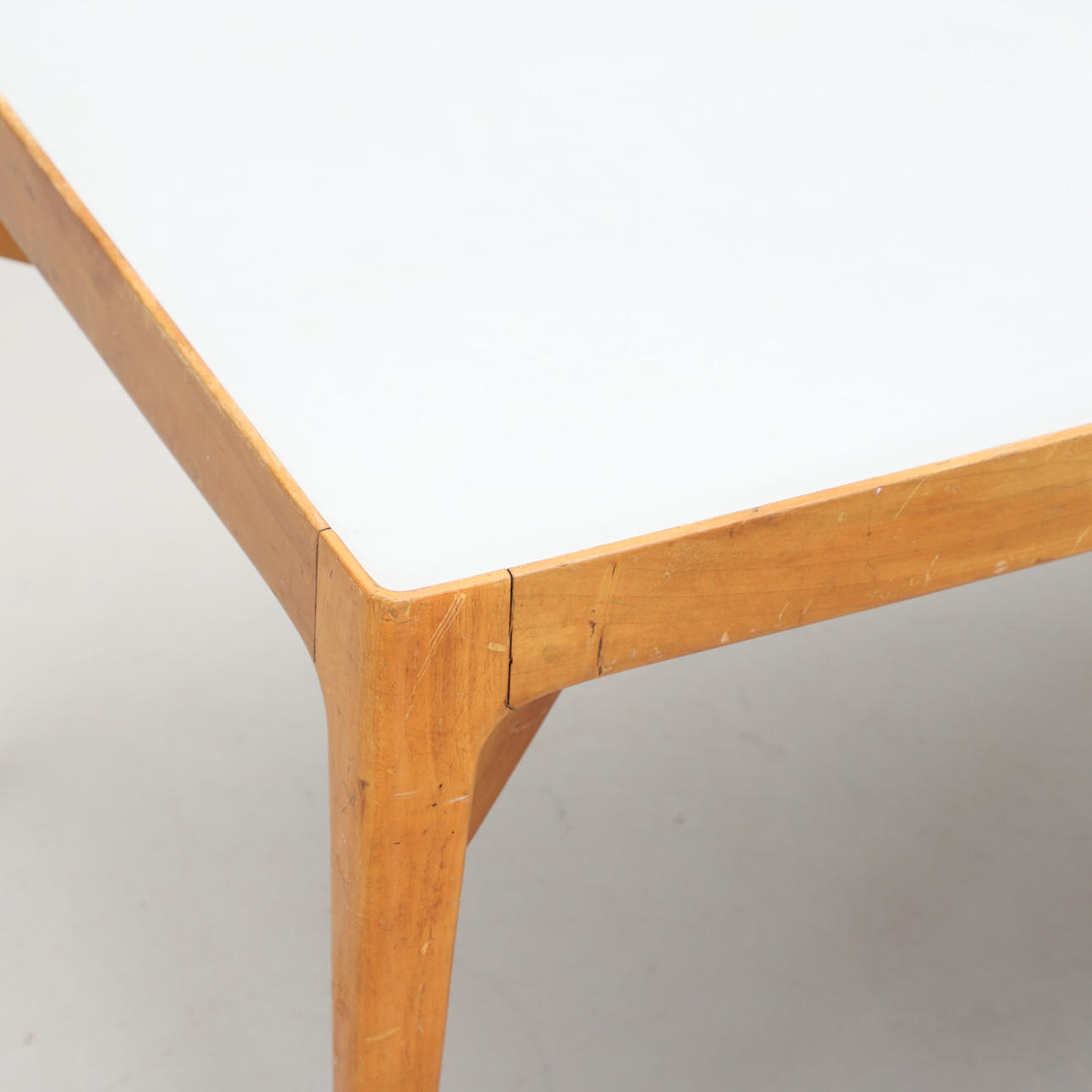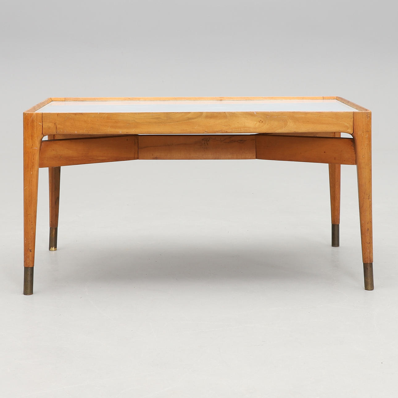 Hardwood frame with laminate table top. Brass leg ends.