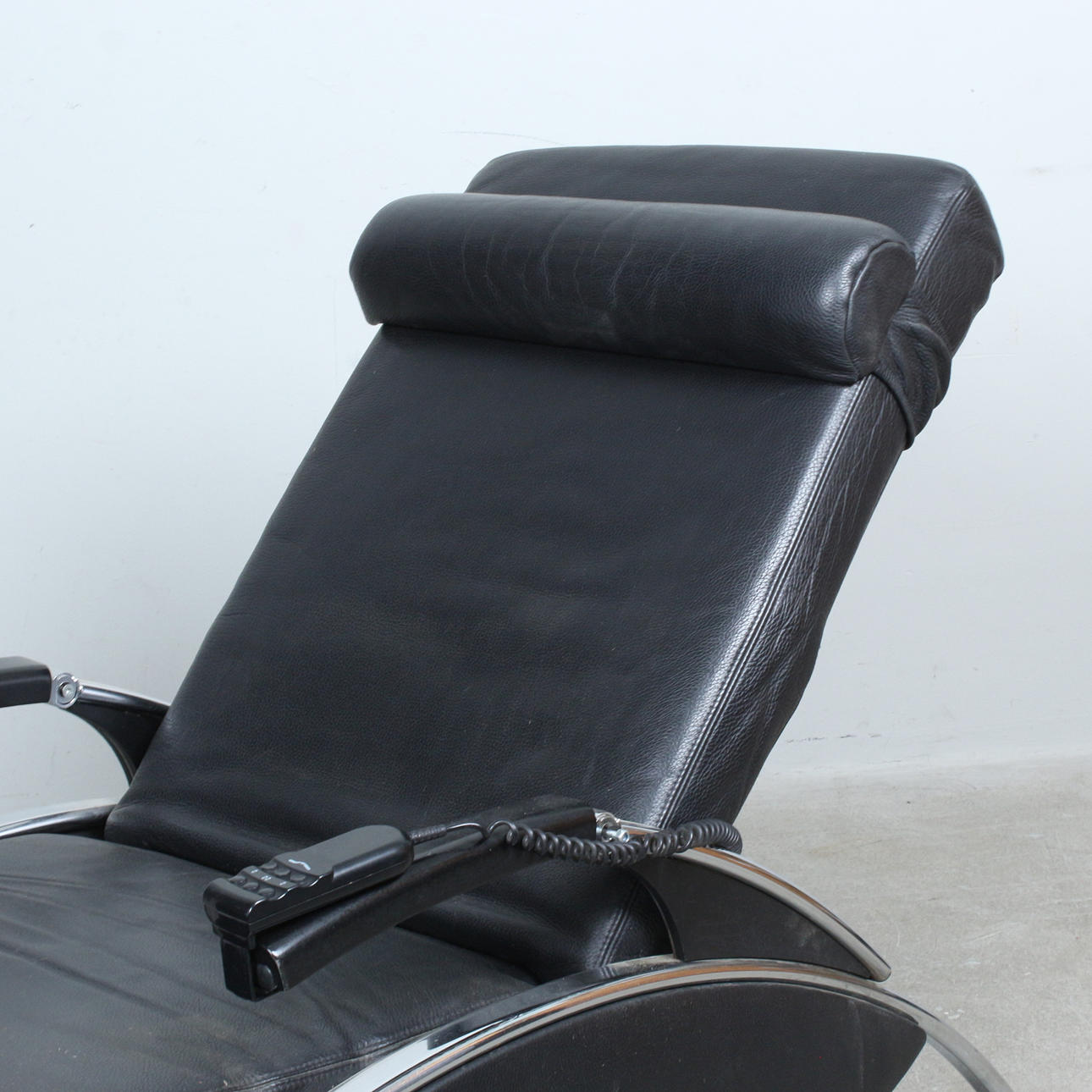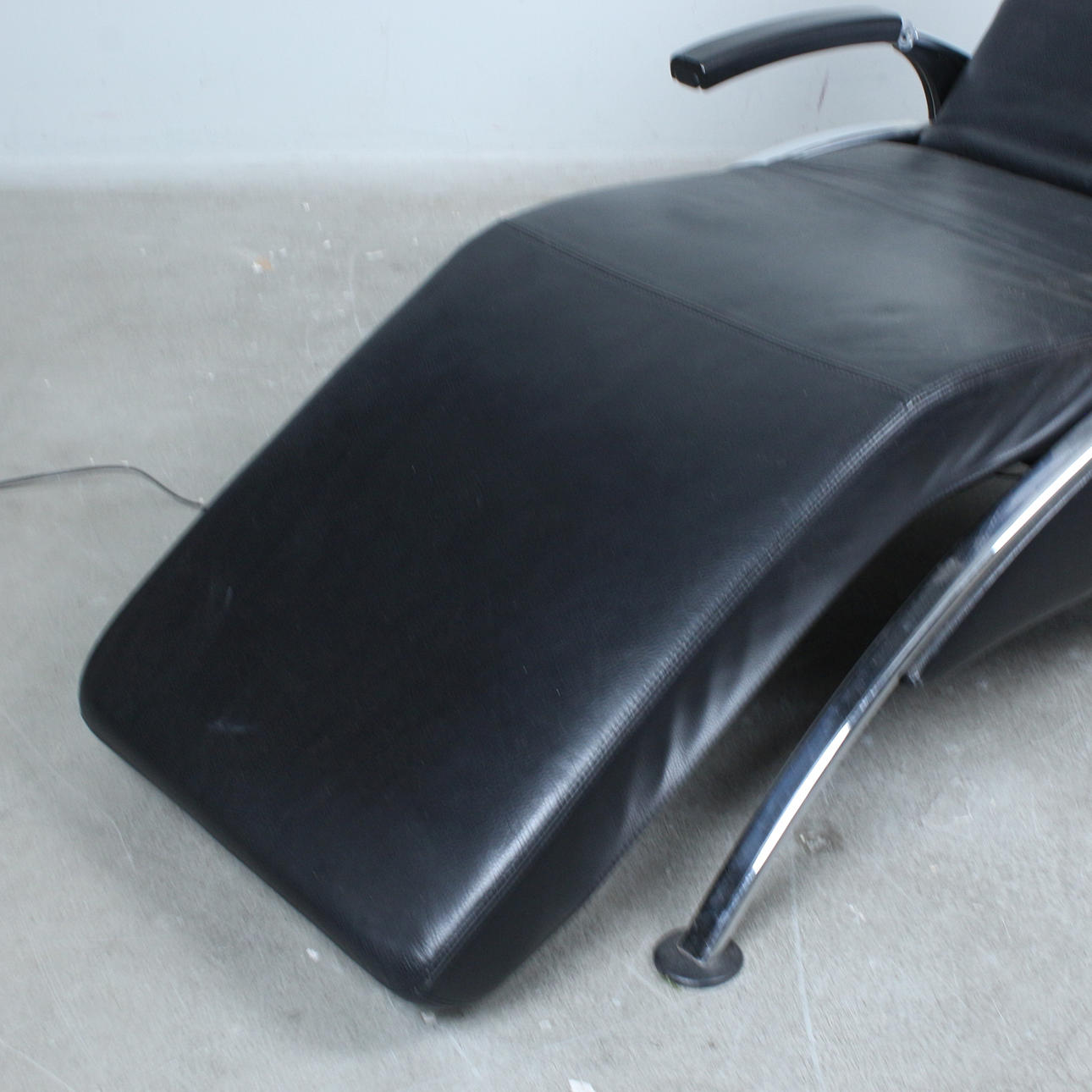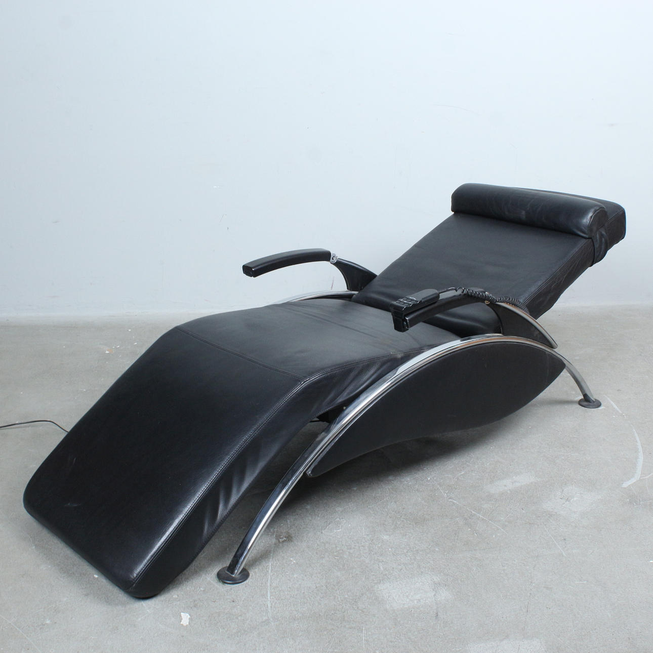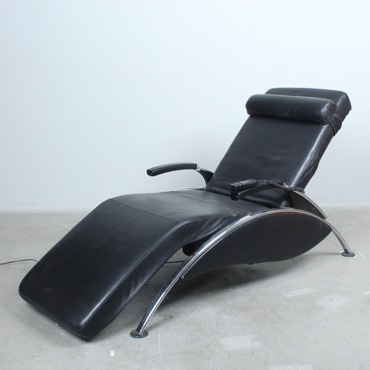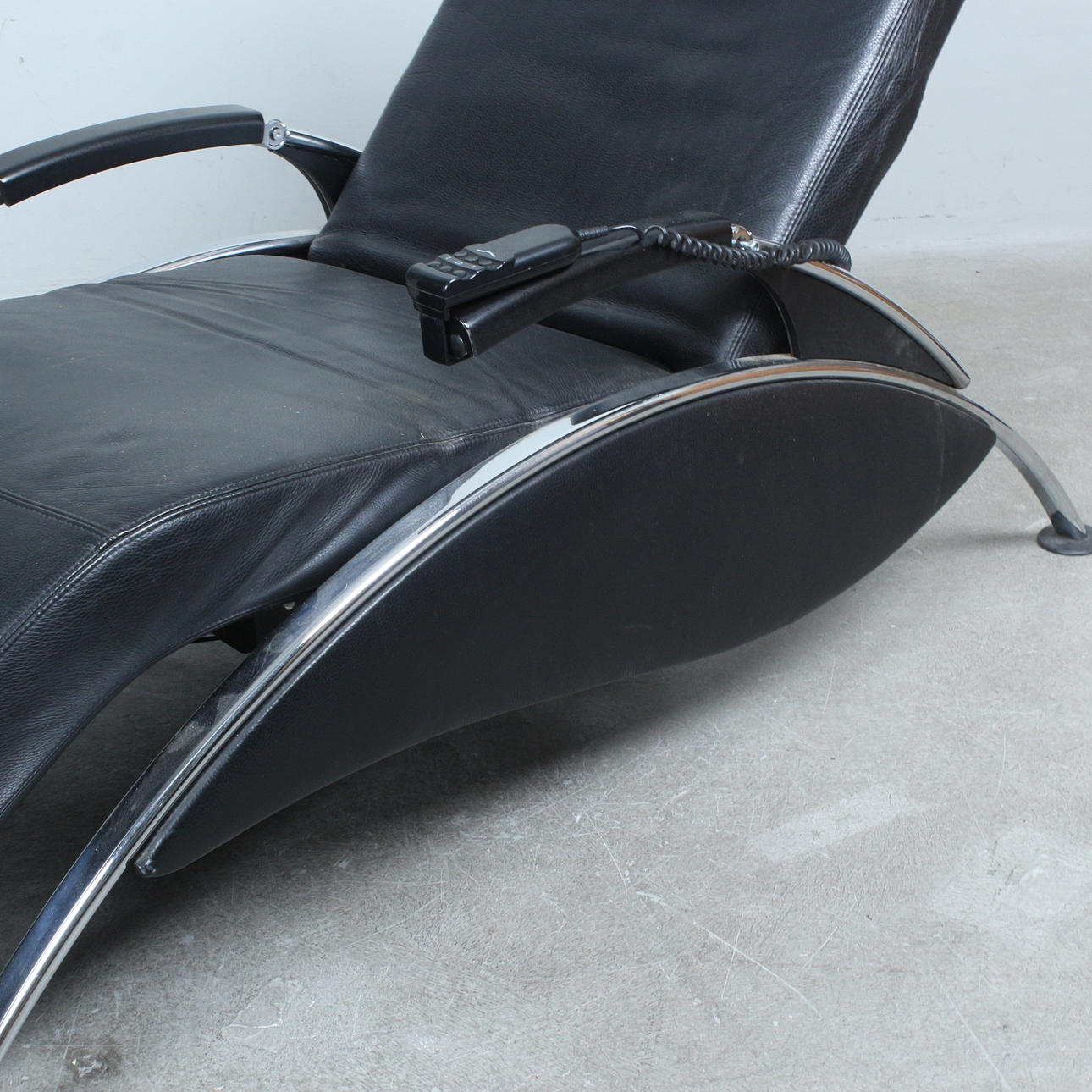 Dewert, electronic lounge chair, chrome, leather. Adjustable via remote control. Dimensions: H: 90 cm. W: 64 cm. D: 179 cm.