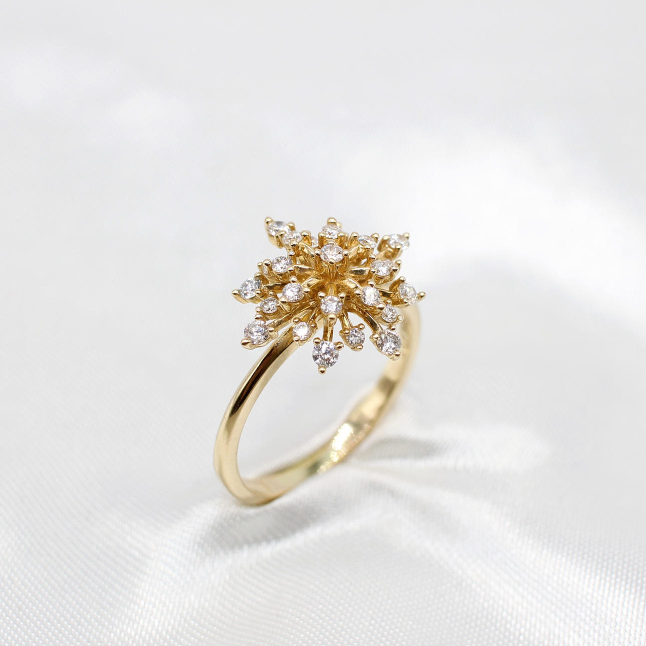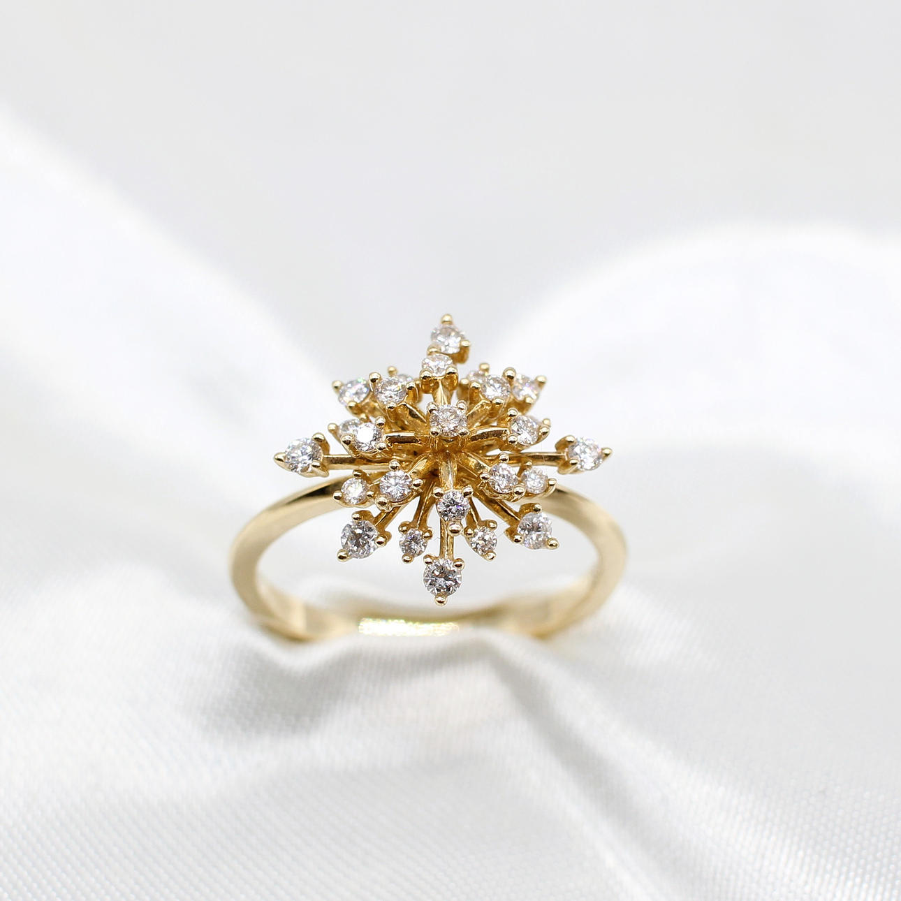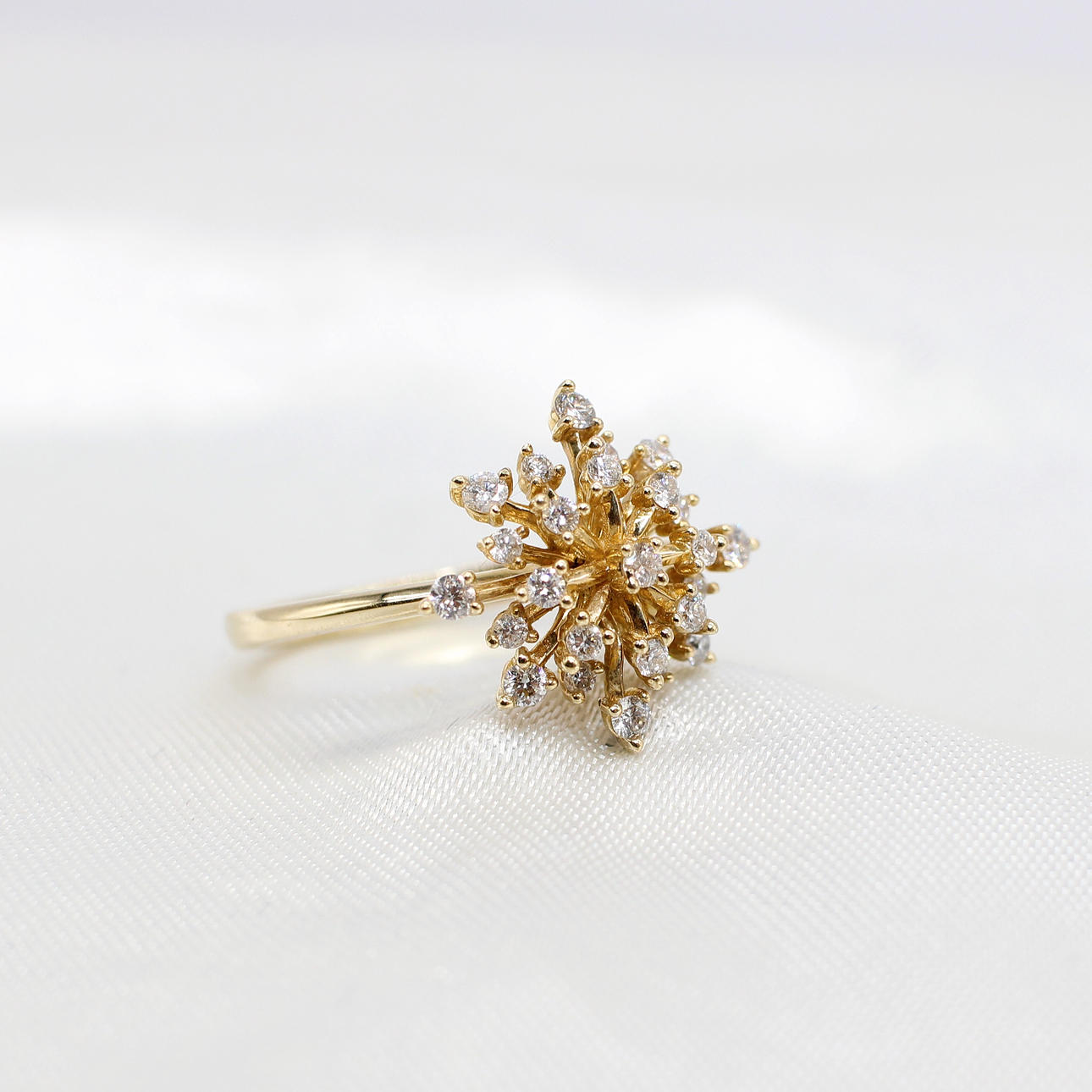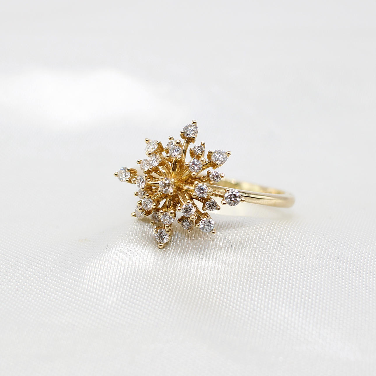 A 10K Yellow Gold (Stamped 10K) Round Brilliant Cut Diamond Set "Star Burst" Style Ring.