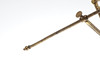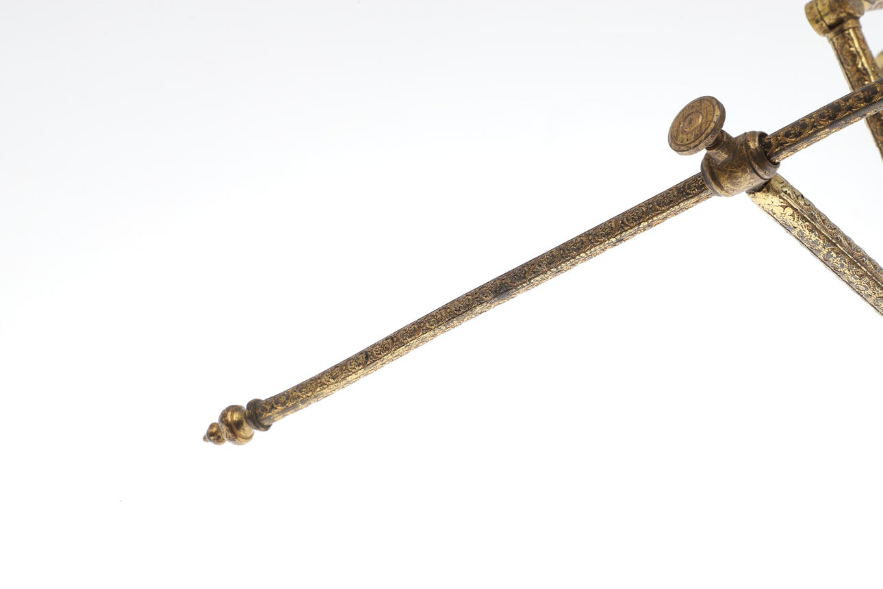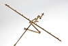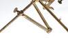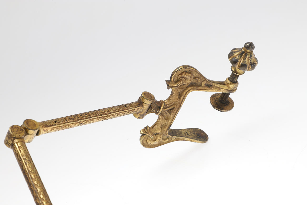 The gilt metal fire screen holder, with a double hinged mechanism and clamp. 30cms high, 53cms across when folded up, 74cms across when extended.