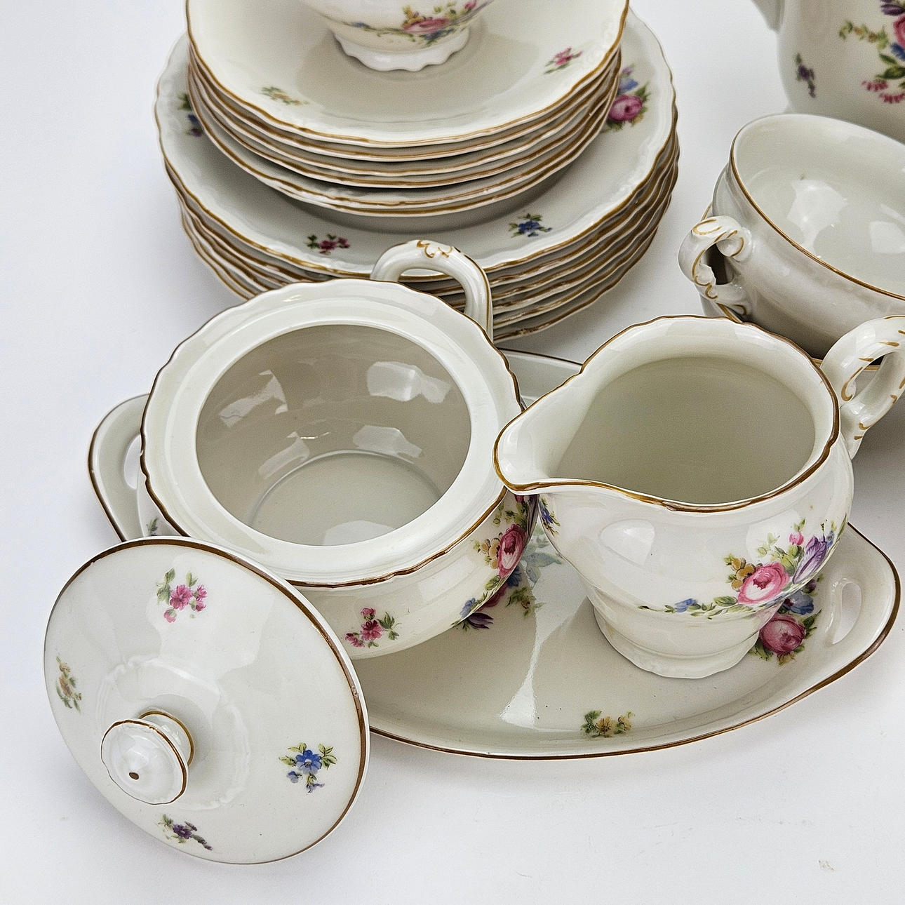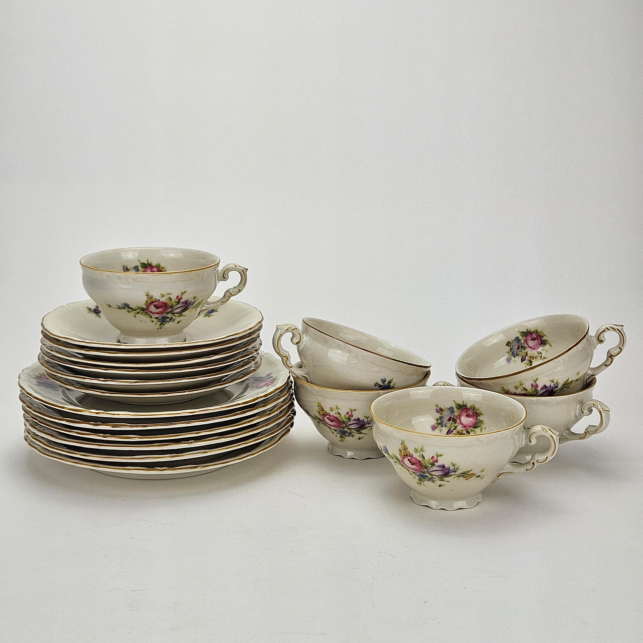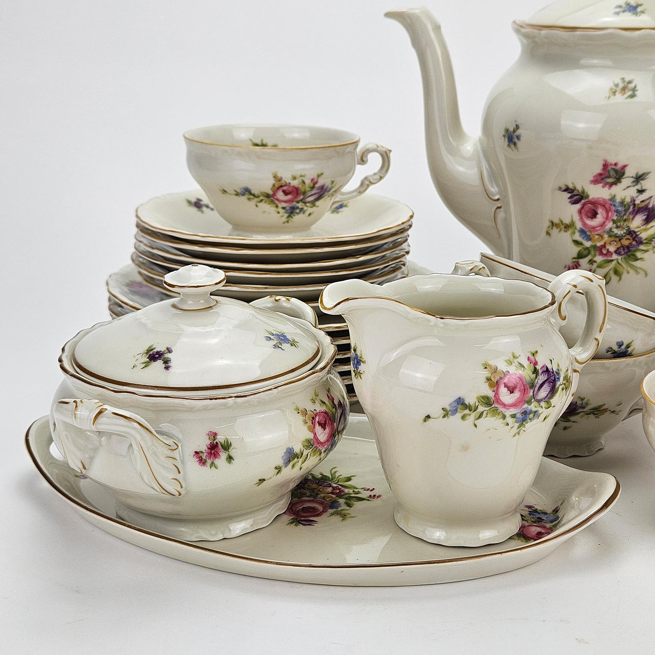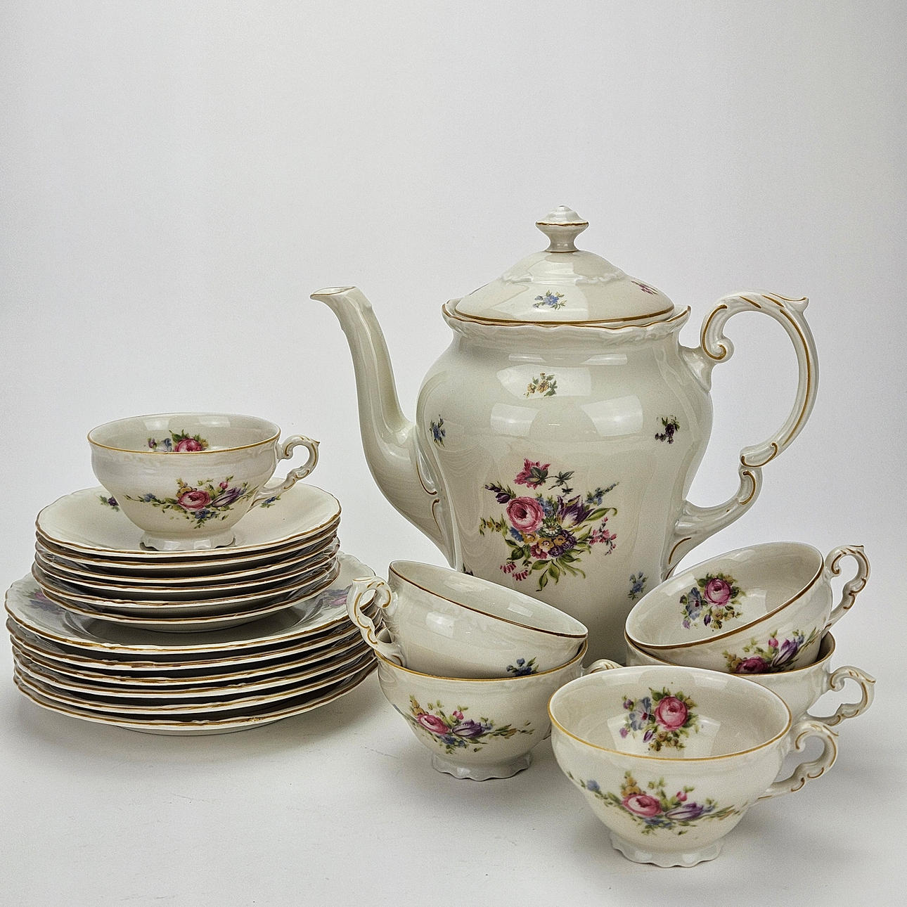 6 coffee cups with saucer, 6 side dishes, coffee pot, sugar bowl and cream jug on tray.