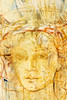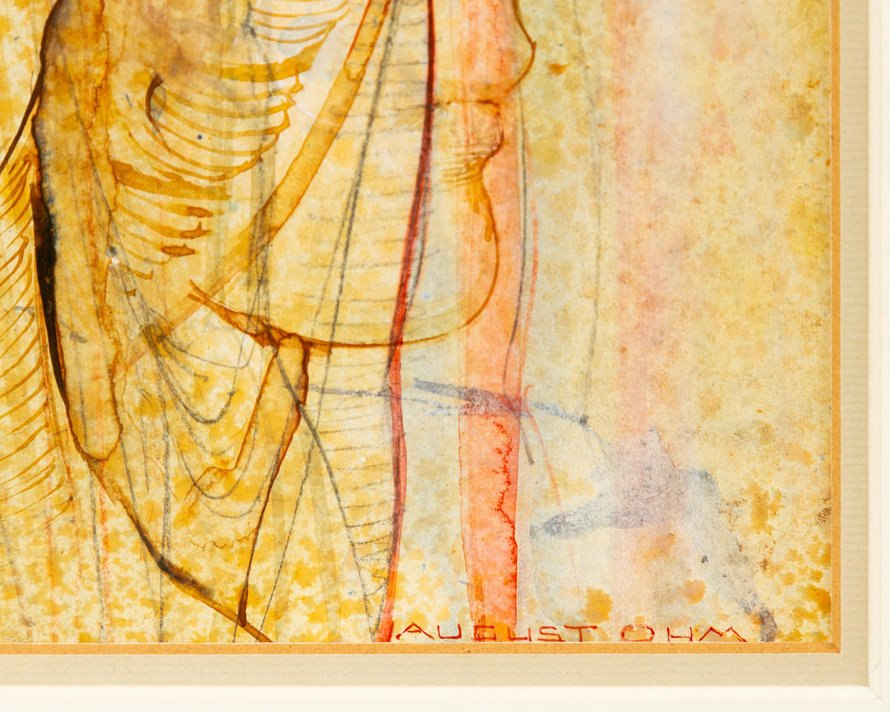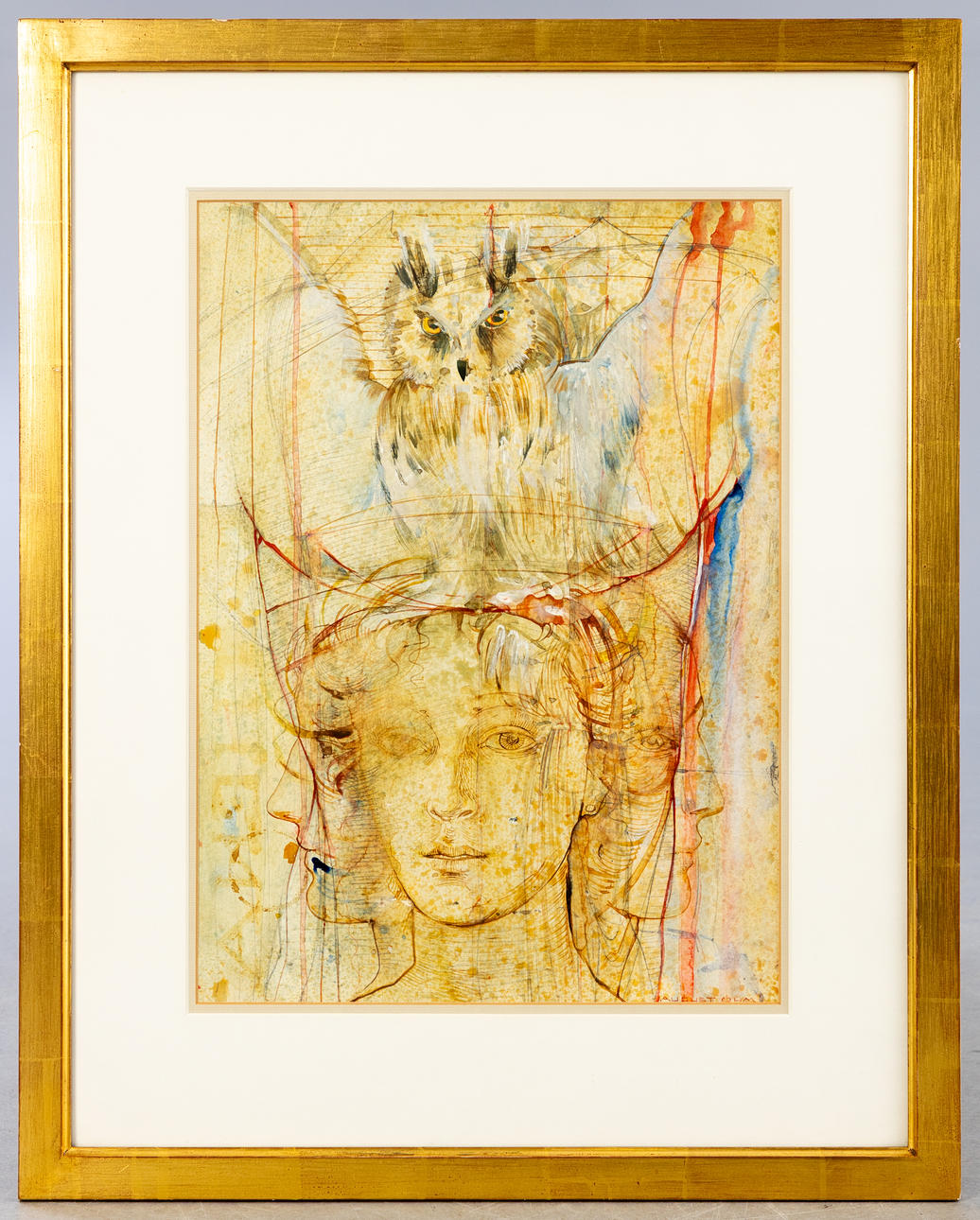 August Ohm (b. 1943), composition with head and owl, watercolor with ink and gouache over pencil, signed, c. 44 x 32 cm, framed behind passe-partout and glass, with frame ca. 64 x 51 cm