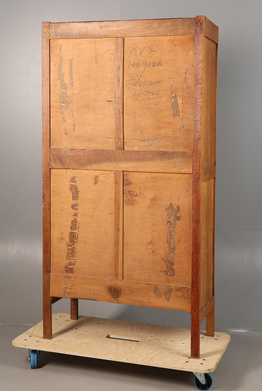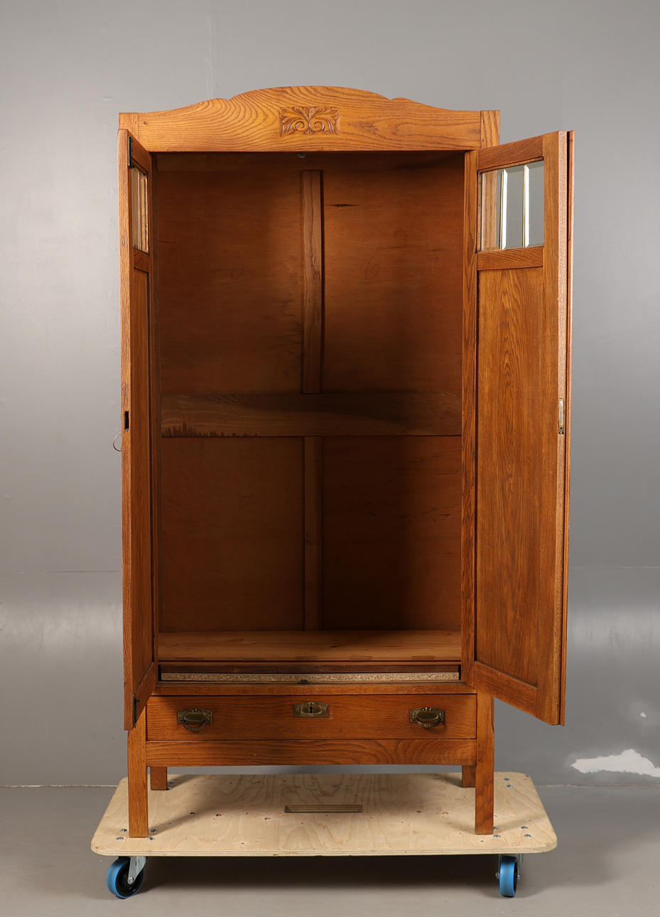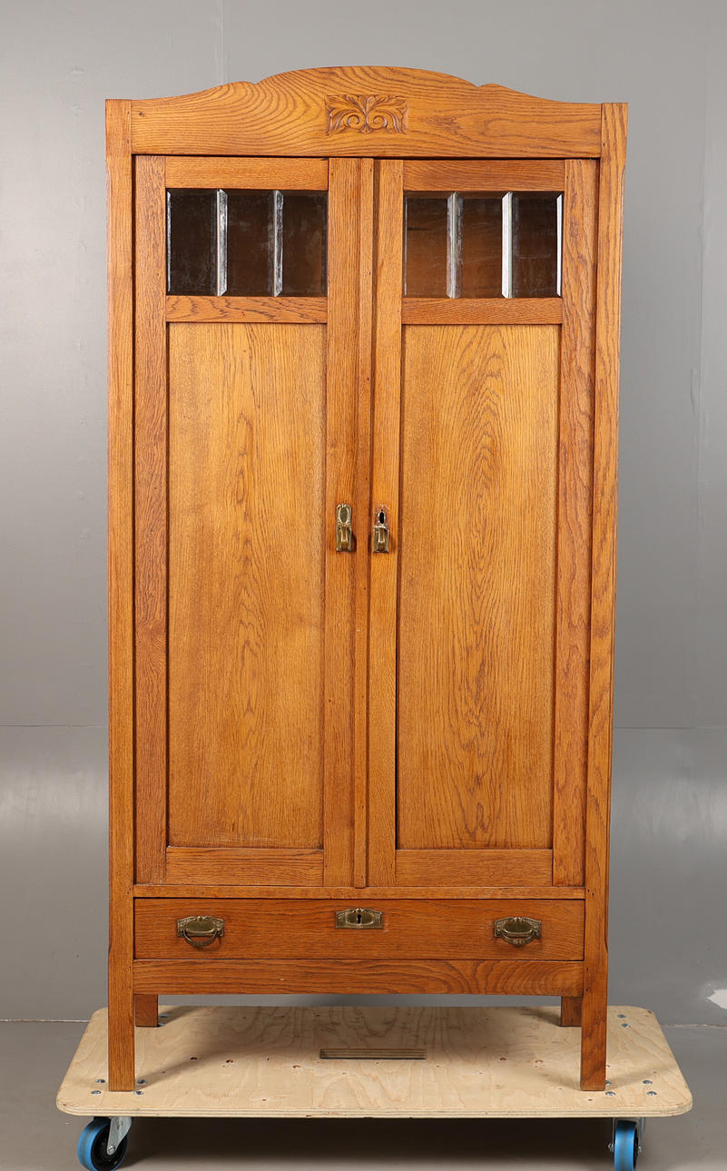 Having a leafy scroll carved frieze above a pair of cupboard doors with bevelled glass plates above a single long drawer to the base, 191 cm high 94 cm wide, 40 cm deep.