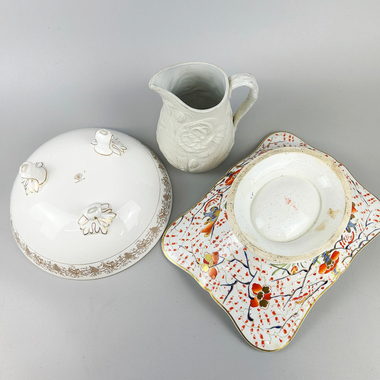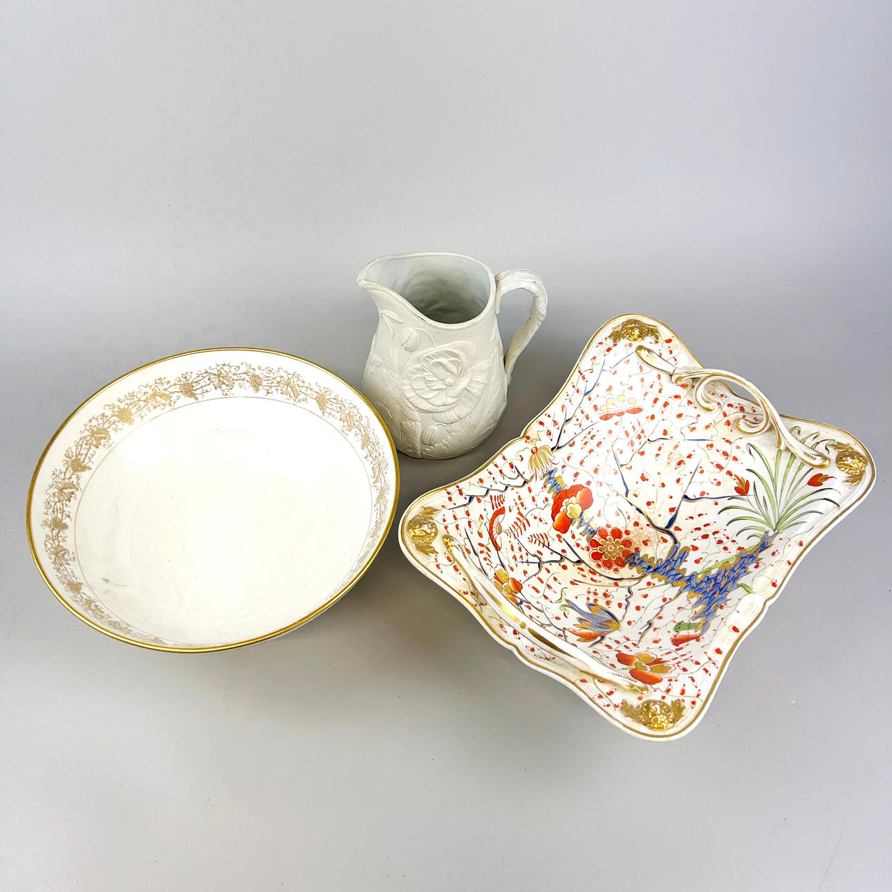 An early Derby porcelain fruit bowl 30 x 24 x 12 cms. together with a Coalport bowl and a relief stoneware jug.