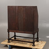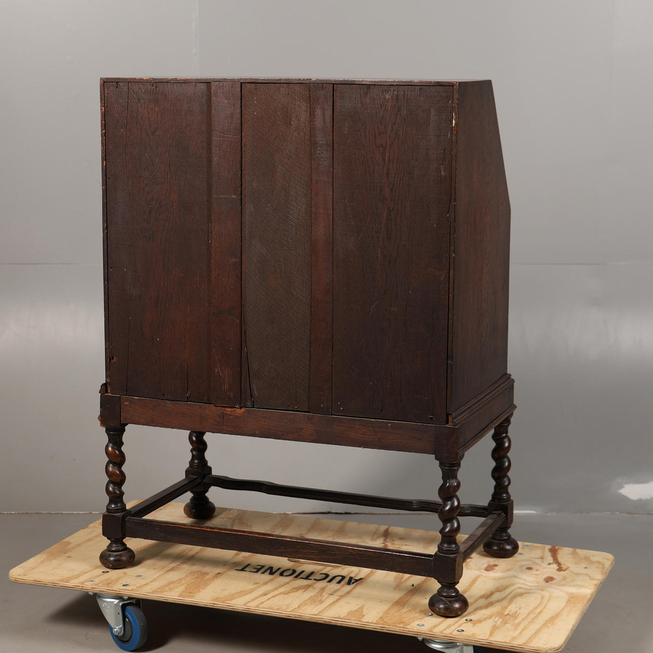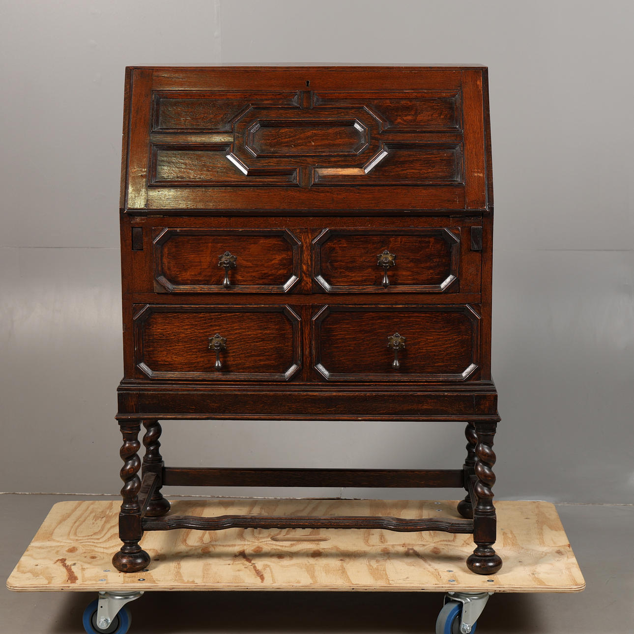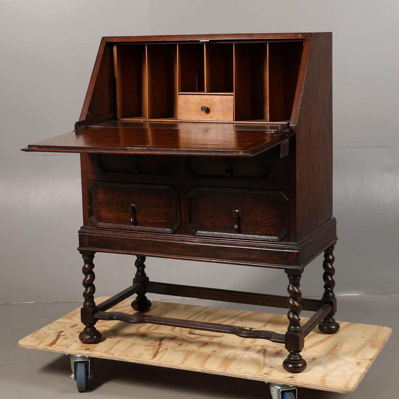 Having a geometric moulded sloping fall above two long draws with barley twist legs united by moulded stretchers, raised on bun feet, 105cm high 76.5cm wide