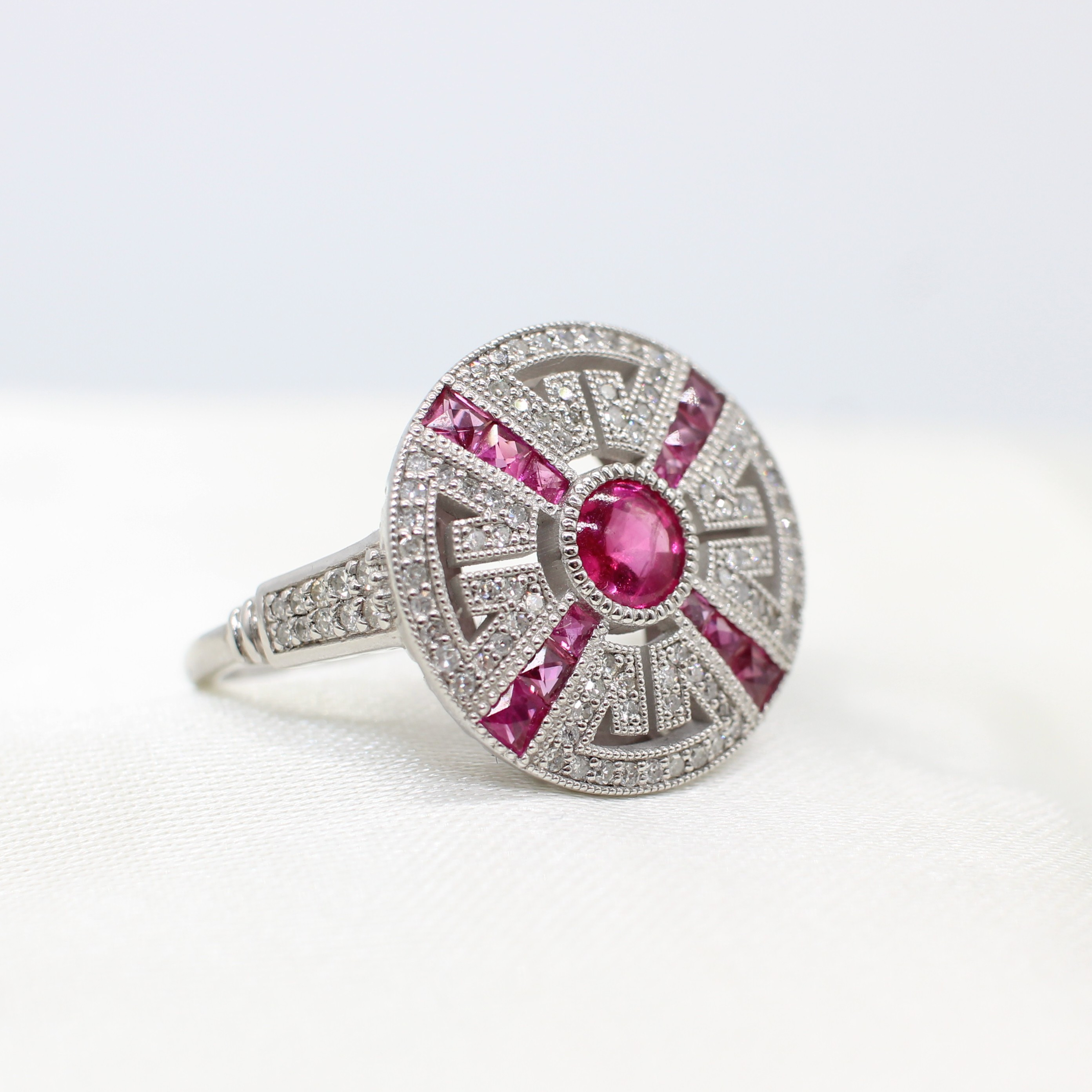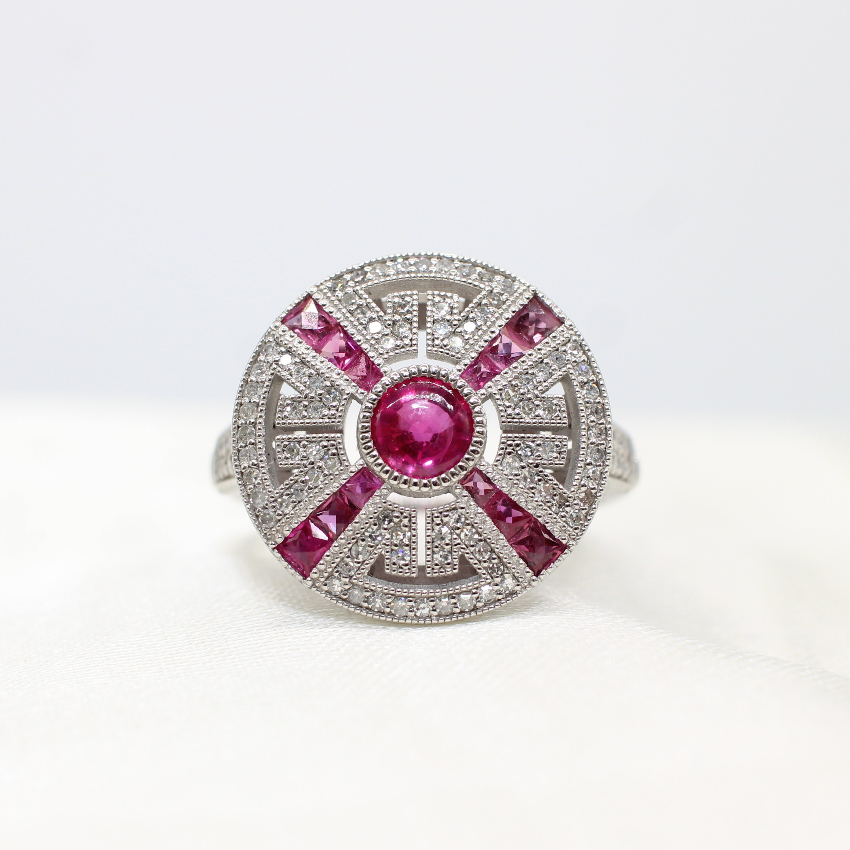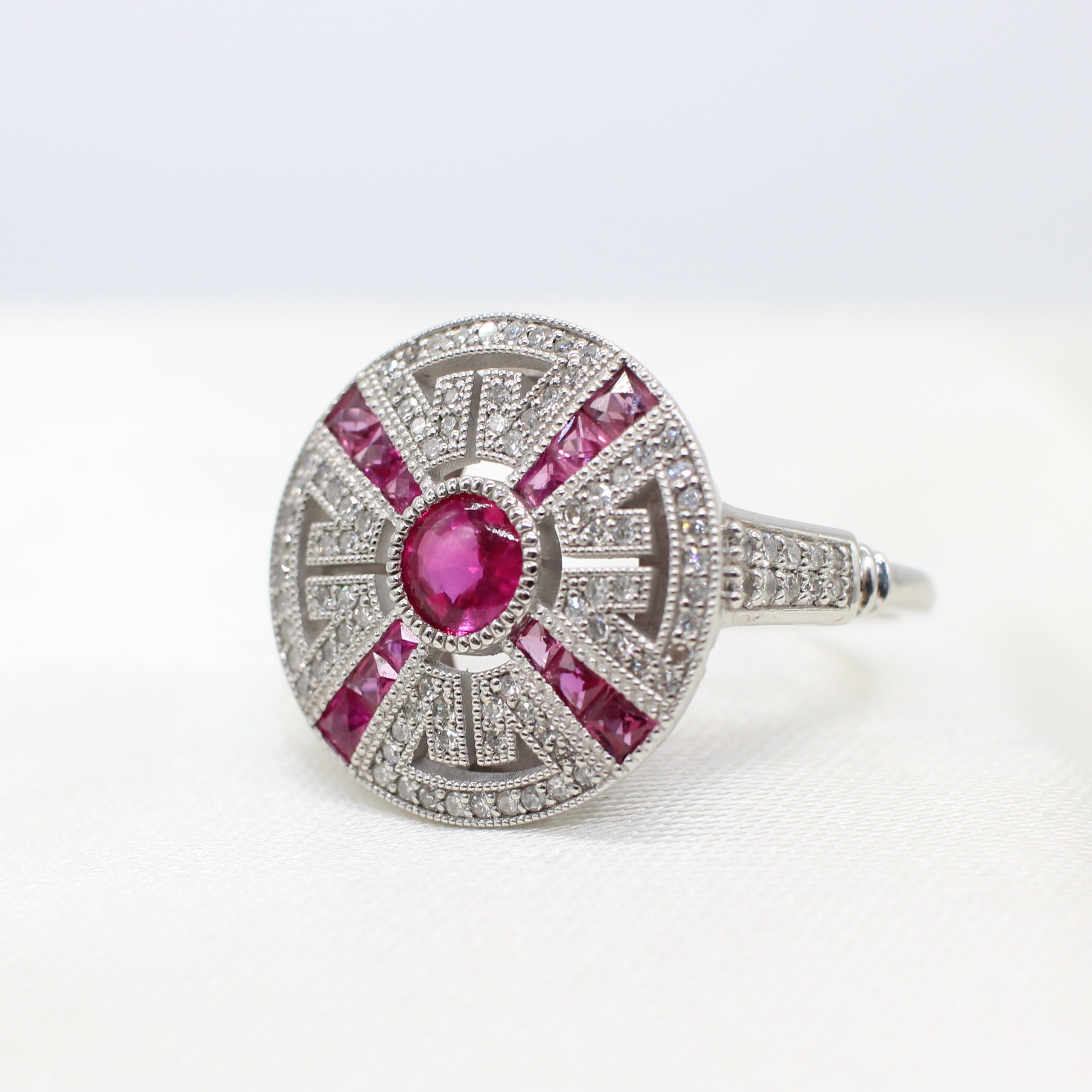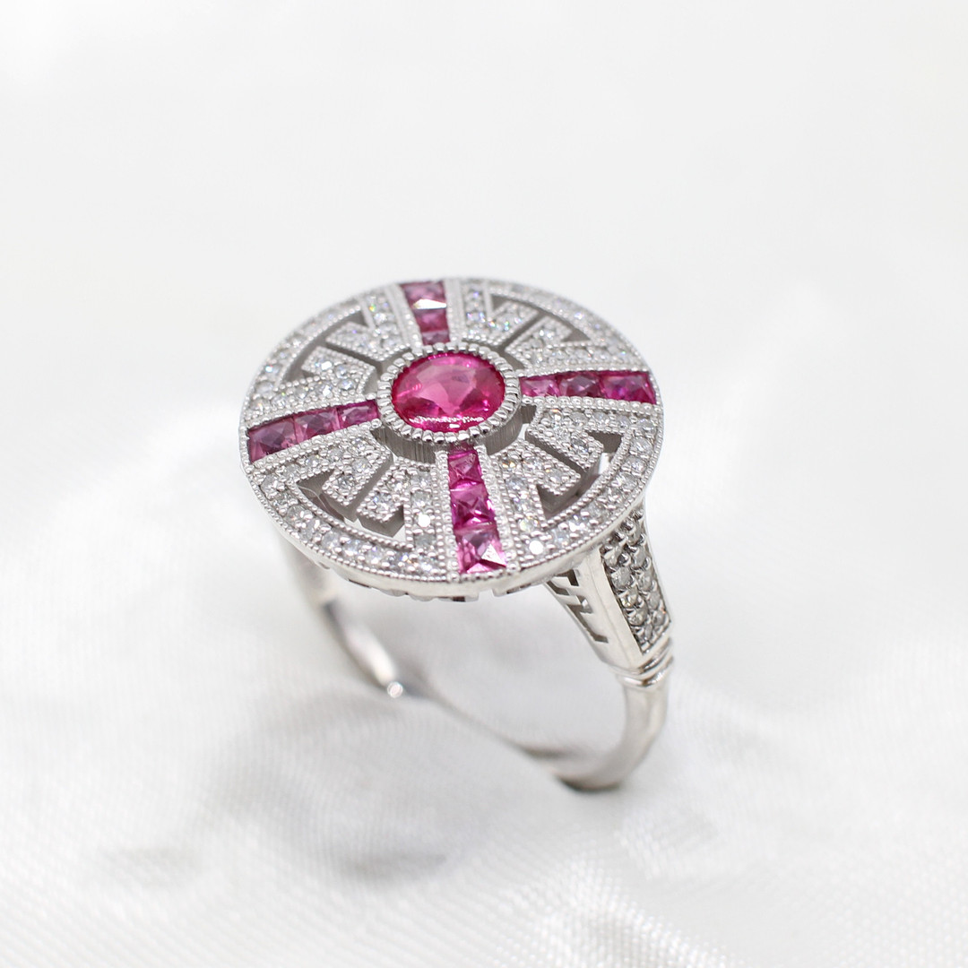 5004465. RUBY & DIAMOND TARGET RING IN PLATINUM.