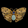 A hallmarked 14ct gold butterfly brooch set with an opal, sapphires and rubies. W. 4.5 cms.