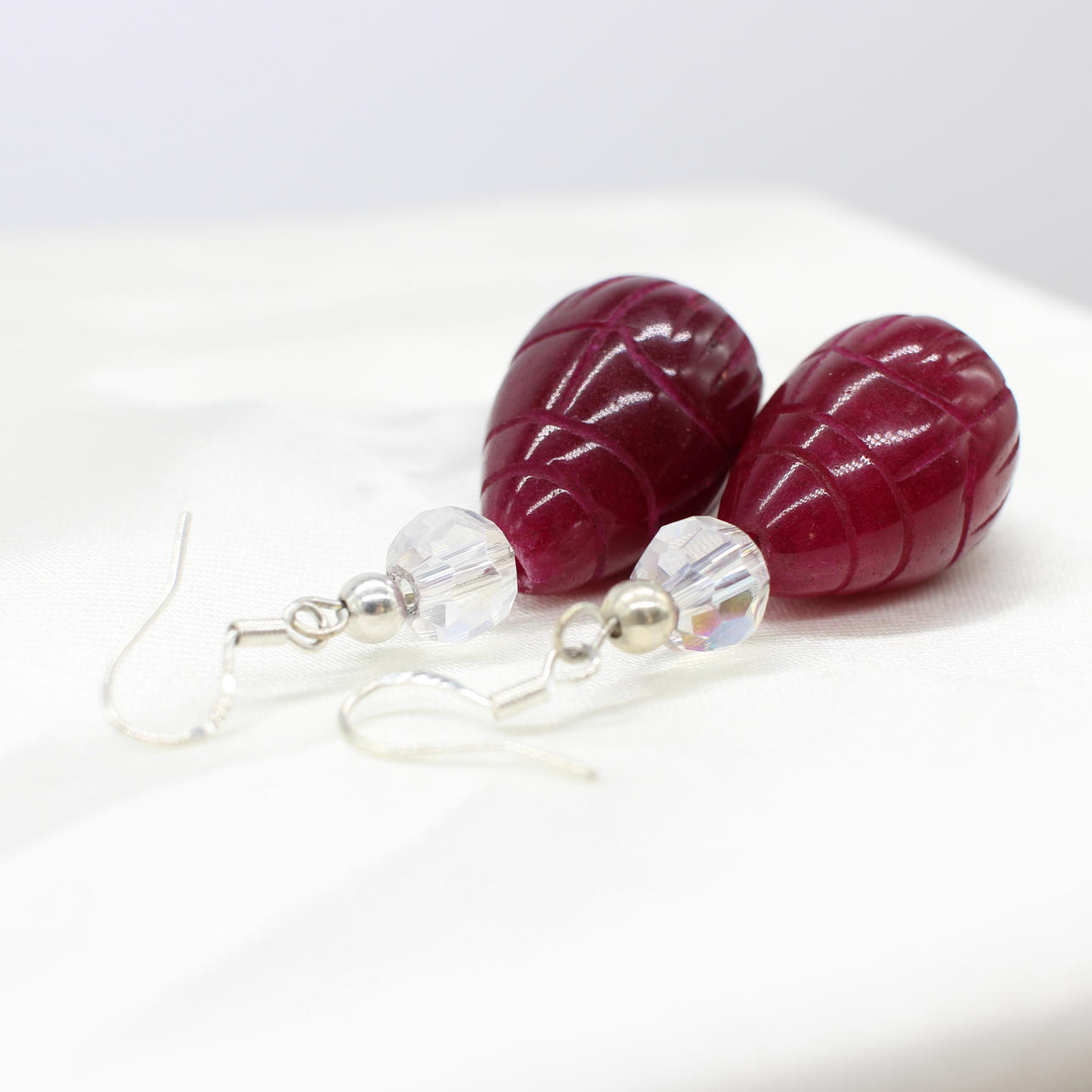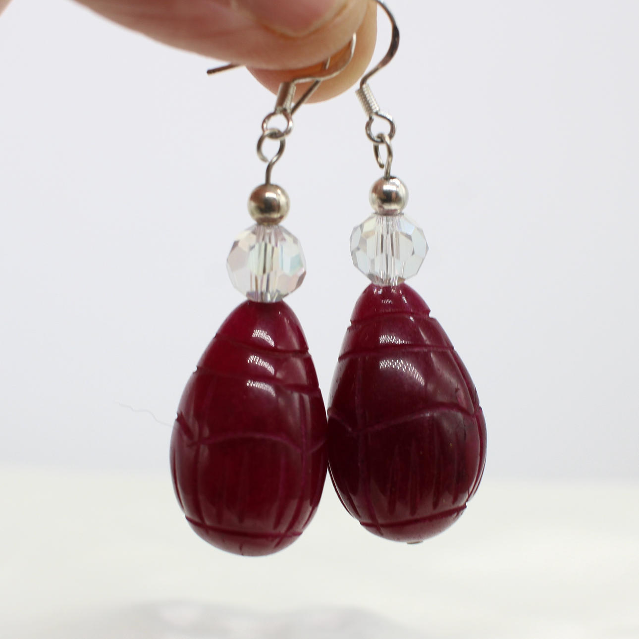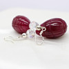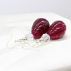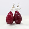 A pair of hand carved, pear shaped, drop earrings made from reconstituted ruby