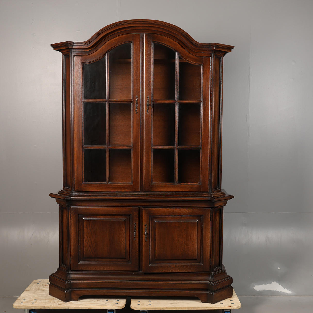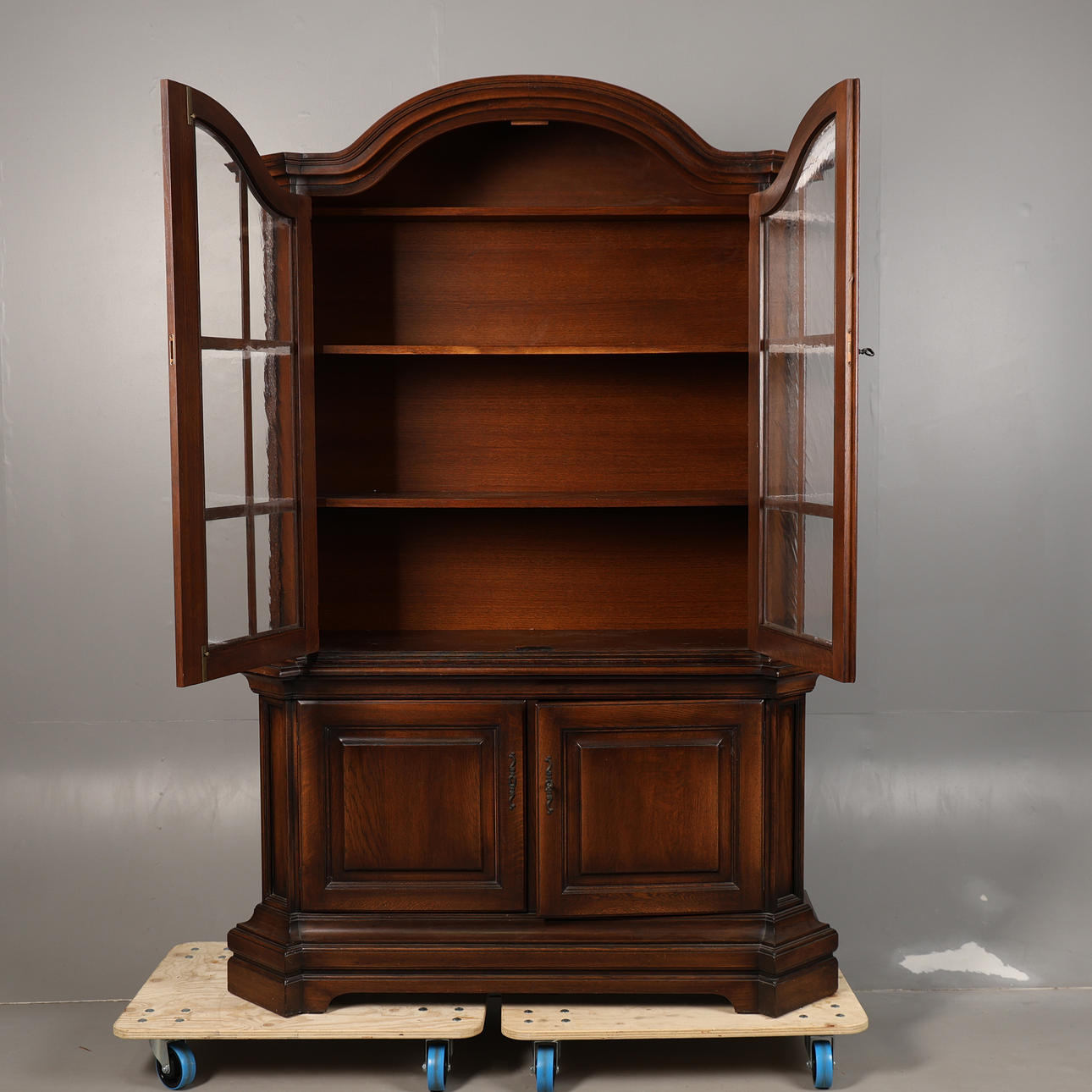 The domed top above a pair of glazed doors. Above the base section, fitted with a pair of cupboard doors, 203cm high 136cm wide 45cm deep.