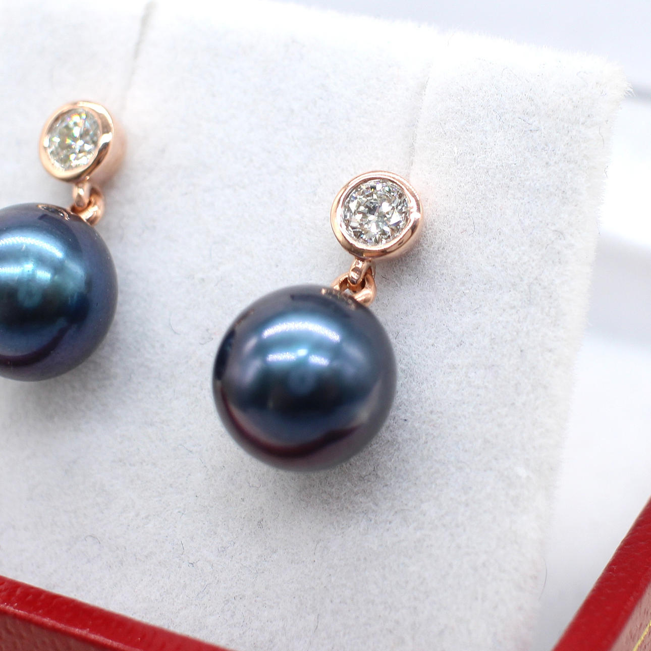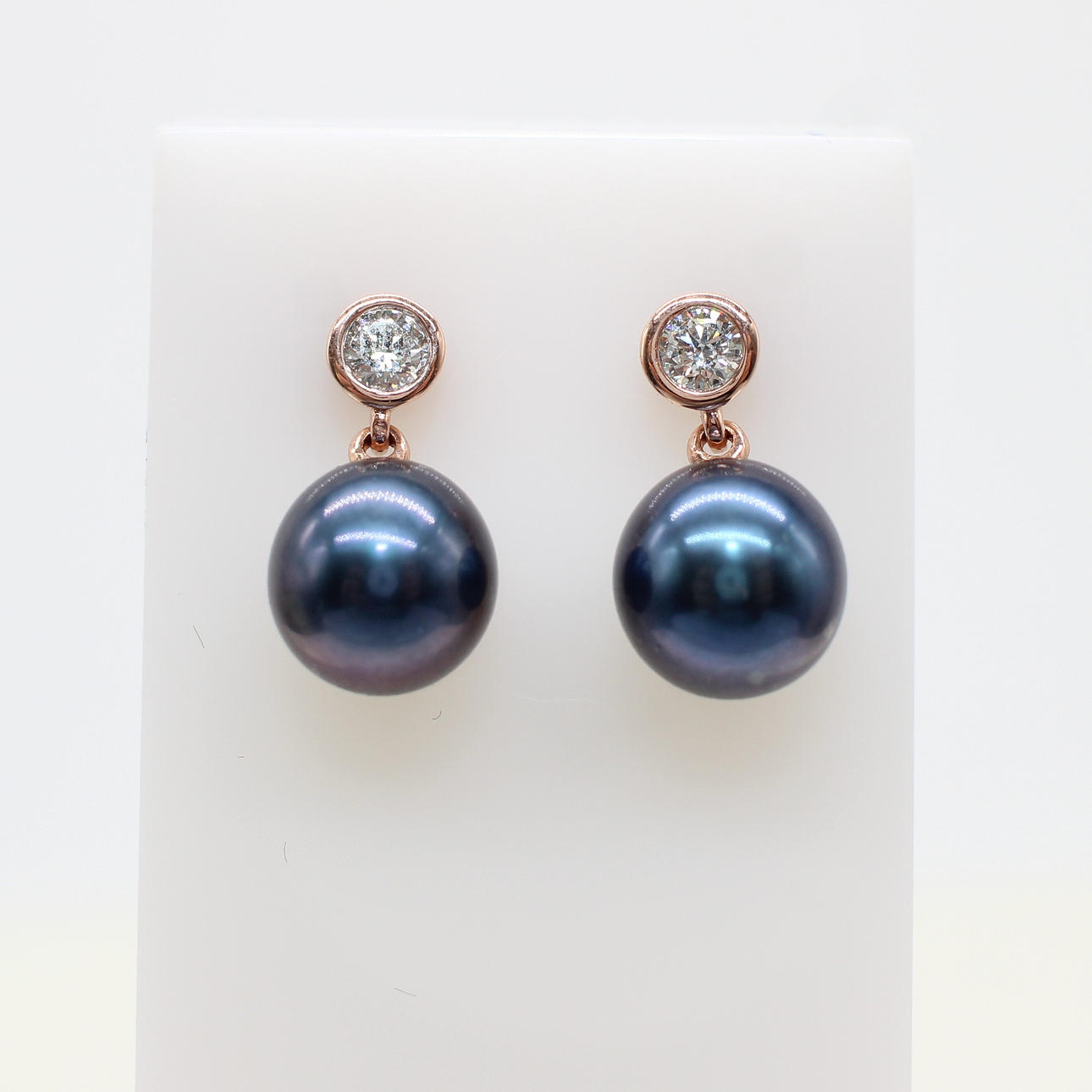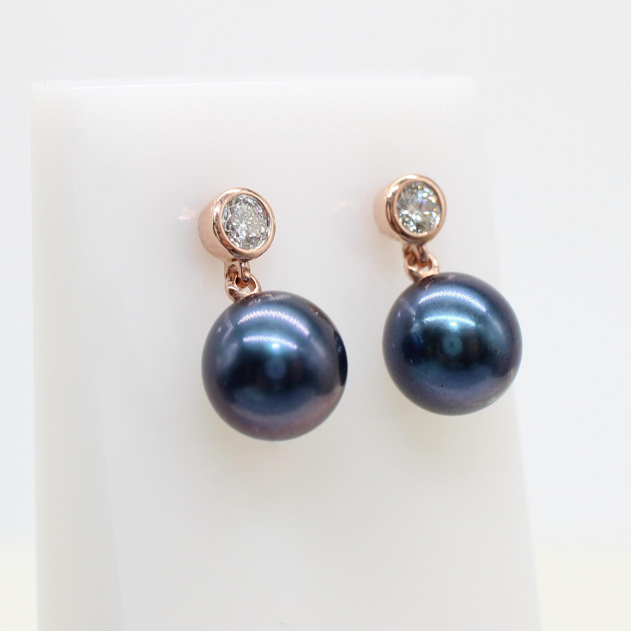 A pair of 9k rose gold (stamped 9k) earrings set with round brilliant cut diamond bales and suspended iridescent cultured pearls.