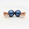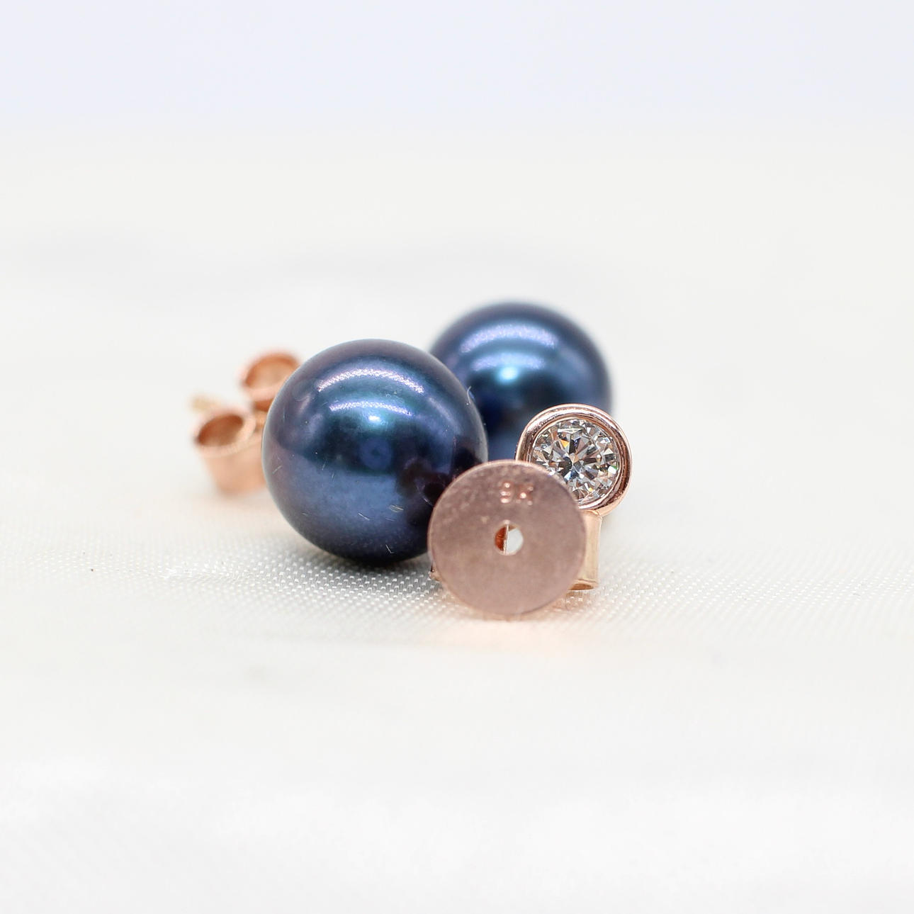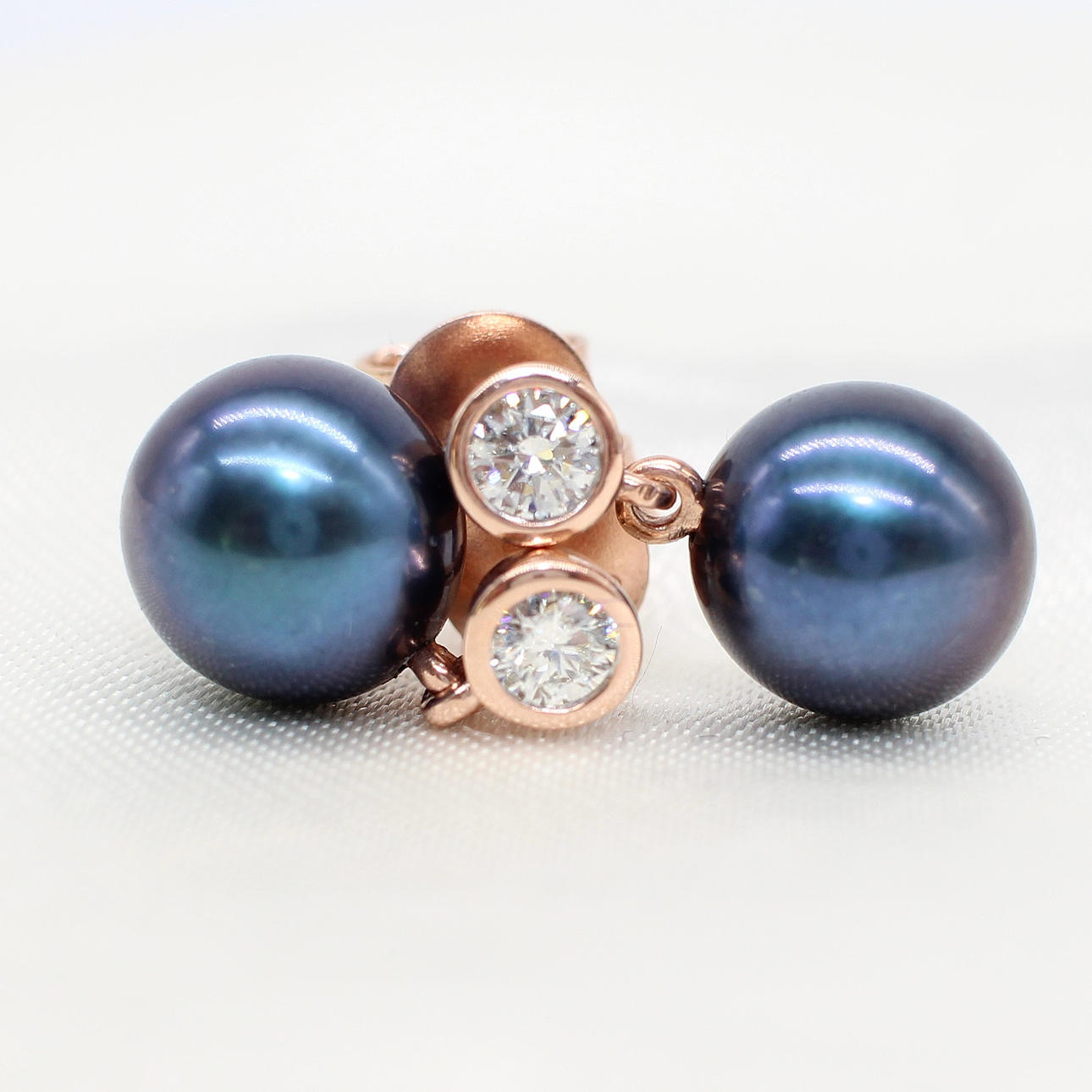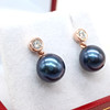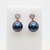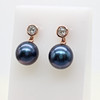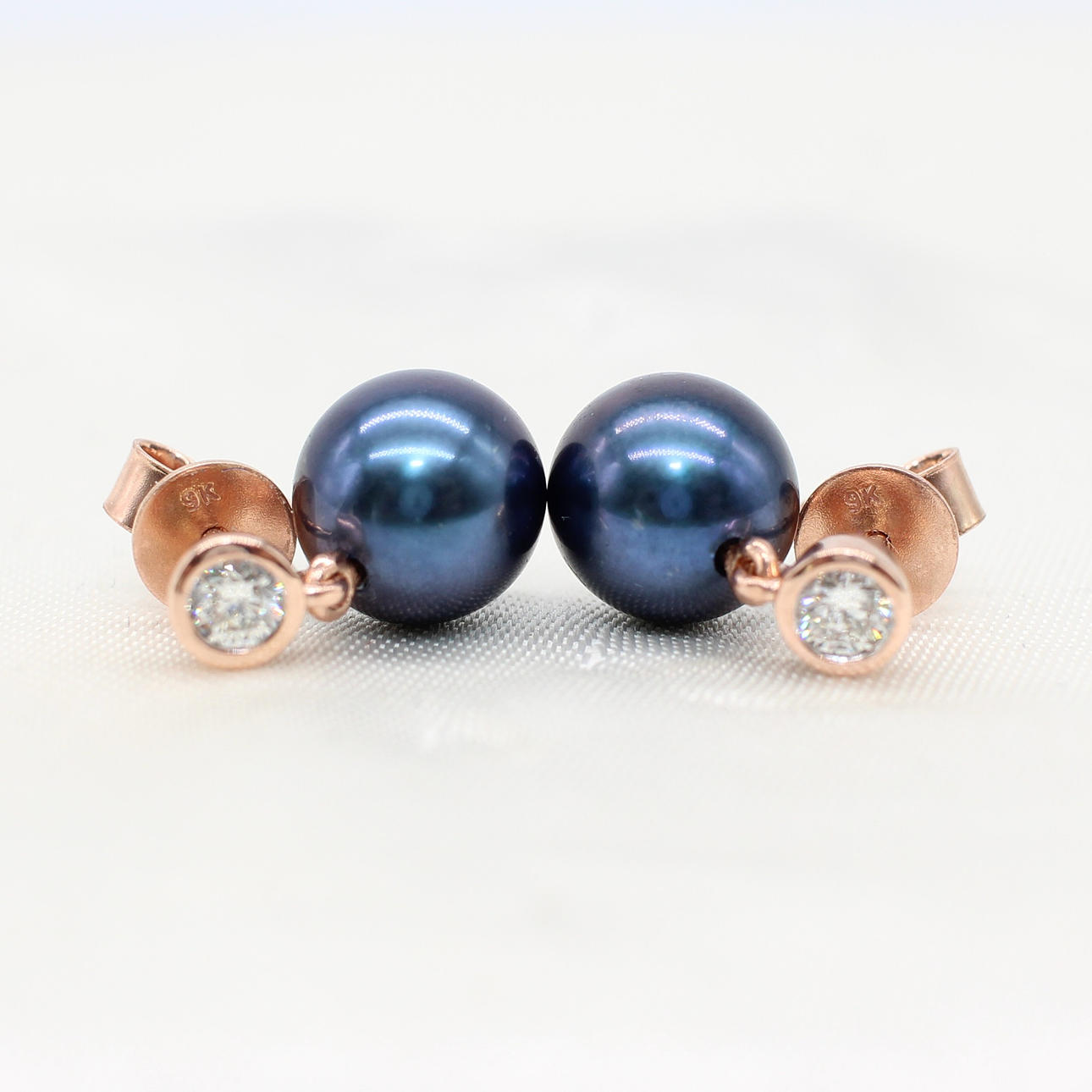A pair of 9k rose gold (stamped 9k) earrings set with round brilliant cut diamond bales and suspended iridescent cultured pearls.