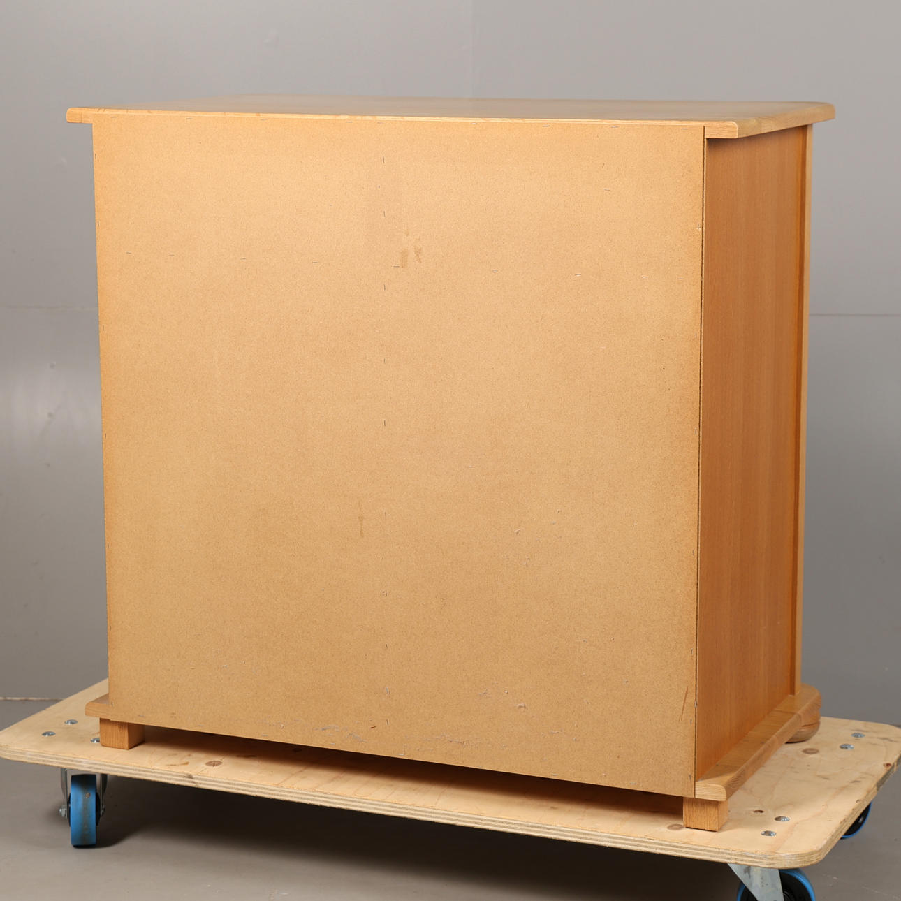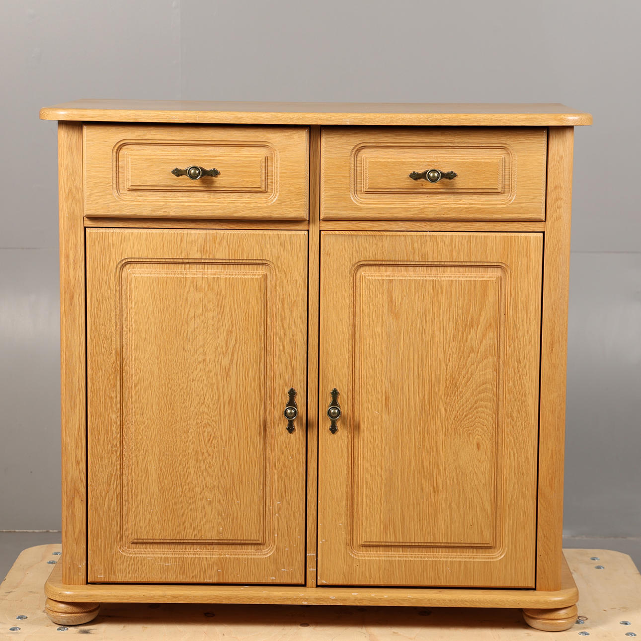 Having two short draws over a pair of cupboard doors raised on bun feet, 93cm wide 89cm high 51cm deep.