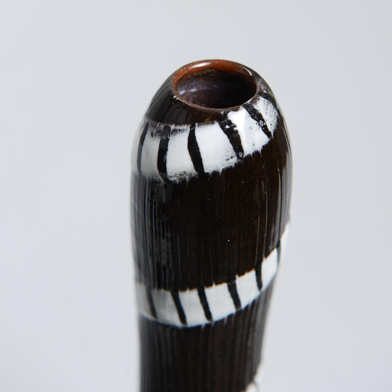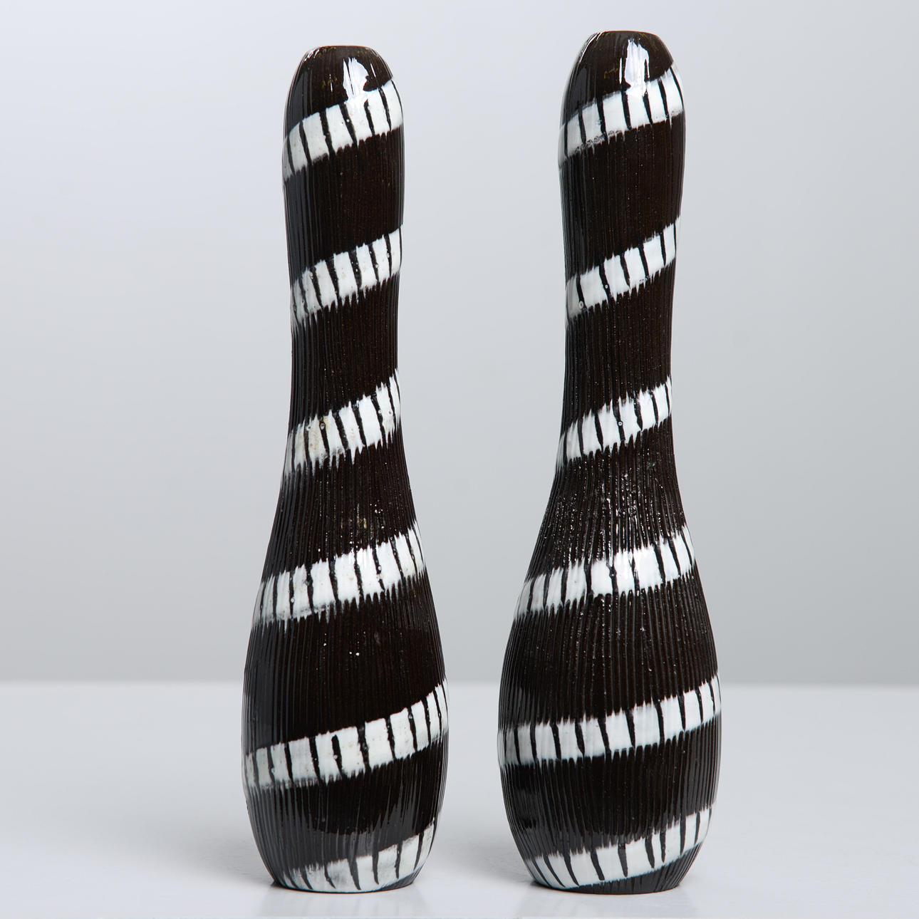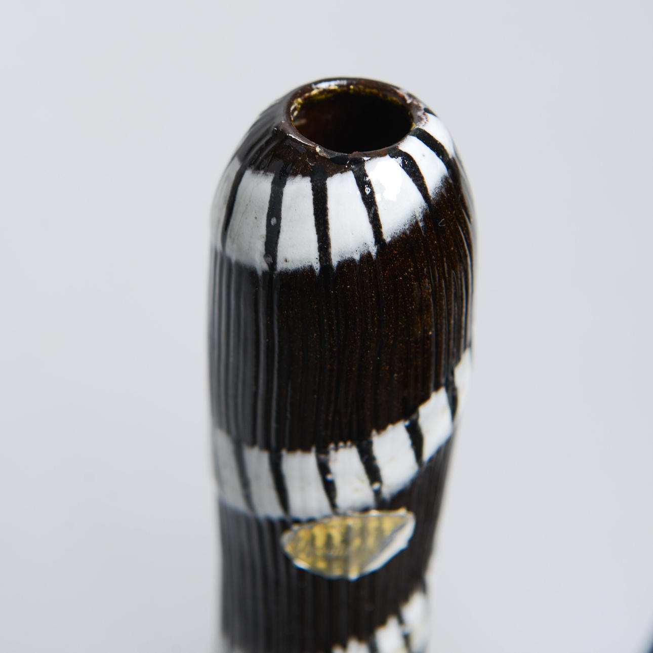 Background: One of the designers at Upsala-Ekeby who was closest to clay, the material, was Ingrid Atterberg (1920-2008). She experimented from the very beginning, like the schooled ceramist she was, with clays, glazes and techniques. For example, she revived black clay, a mixture of red clay and manganese oxide, and made it an impactful feature in many art series, not only her own; she also produced a series, Sintergods, which succeeded in producing stoneware effects from the Uppland clay; she also found a way to use the effects of chamotte clay without having to twist it.