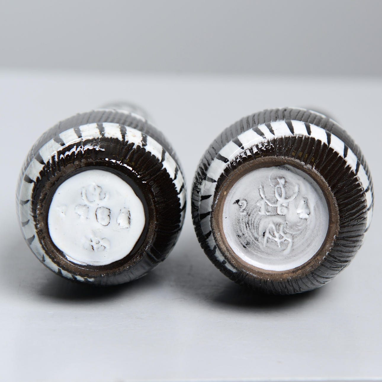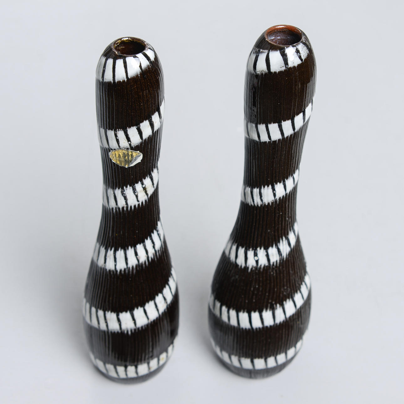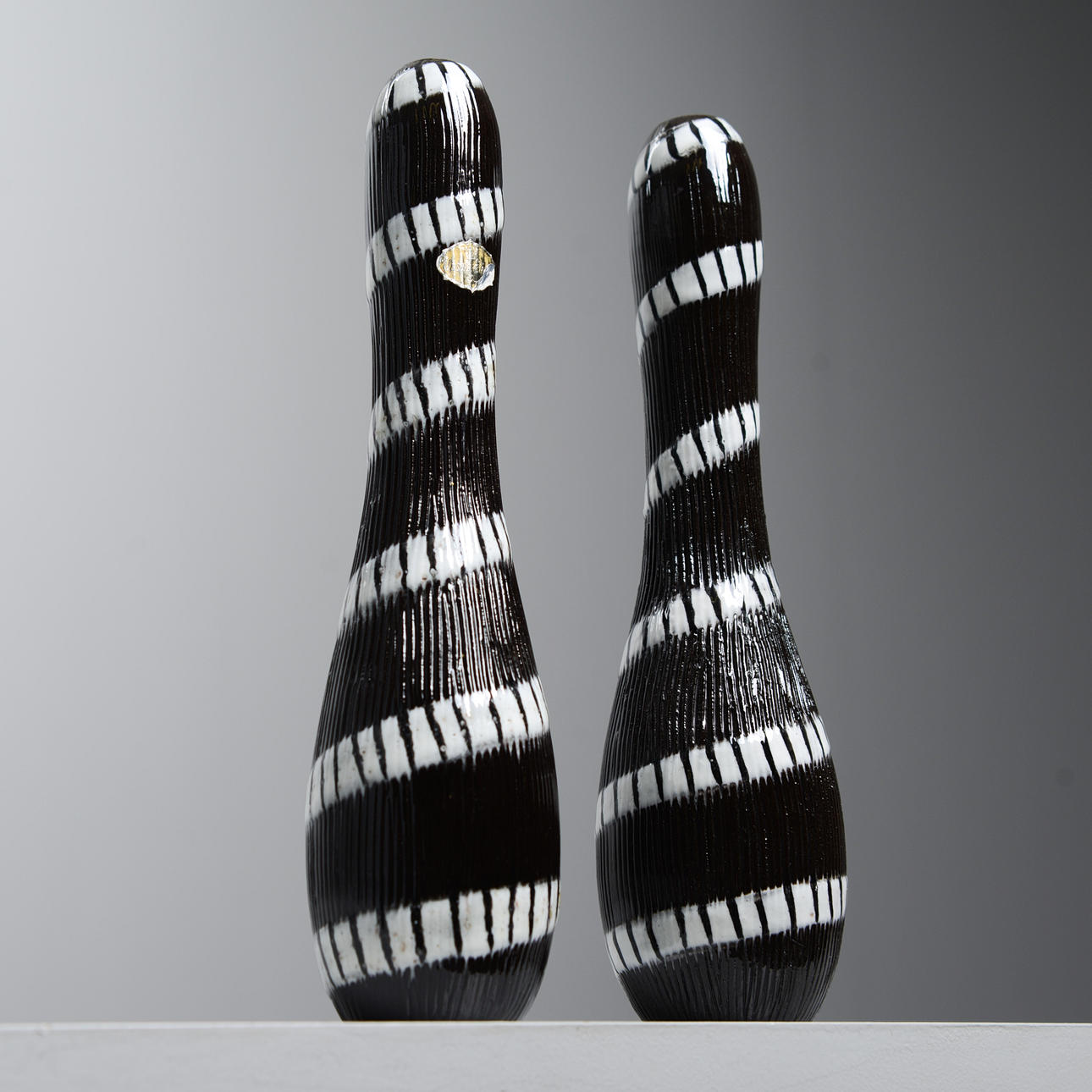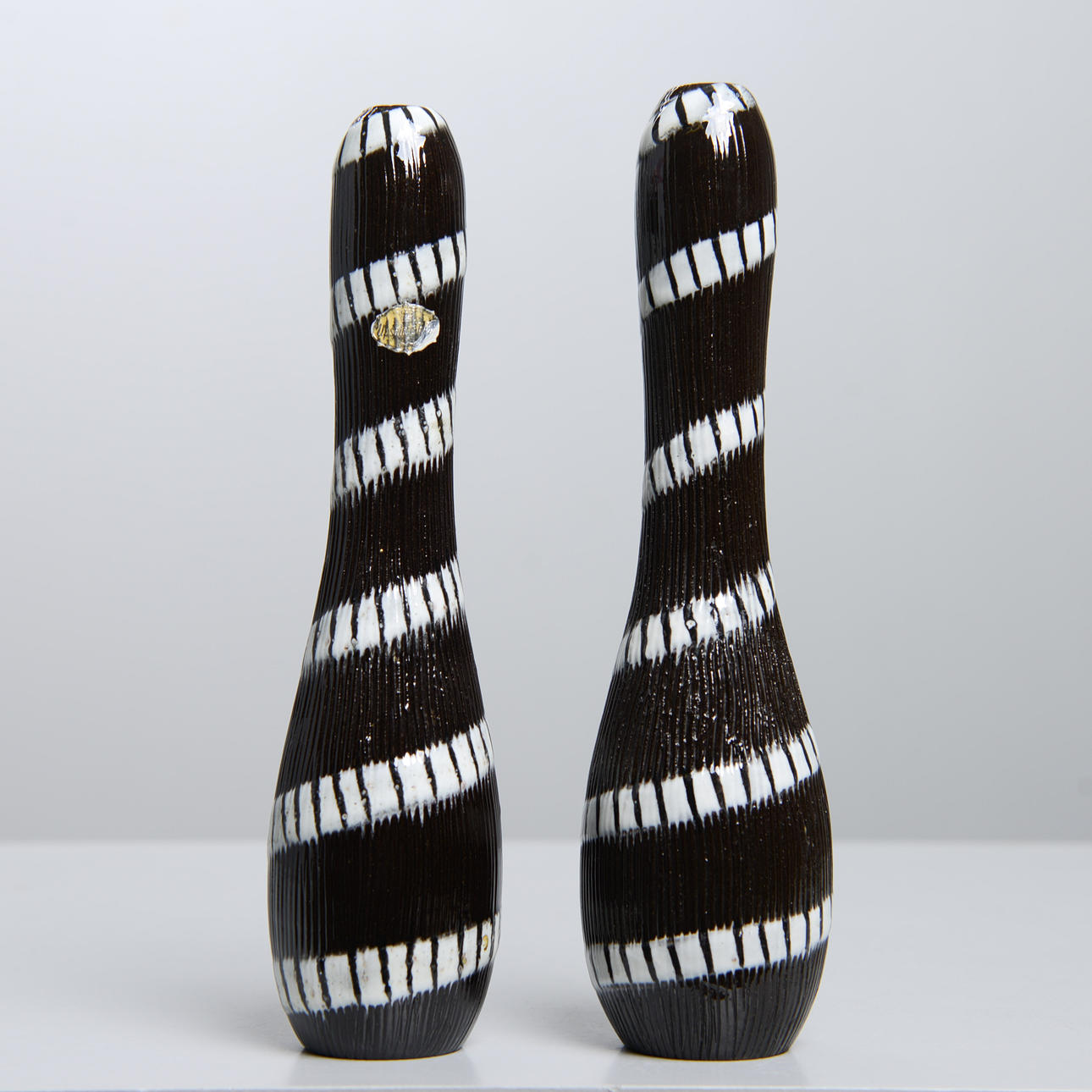 Background: One of the designers at Upsala-Ekeby who was closest to clay, the material, was Ingrid Atterberg (1920-2008). She experimented from the very beginning, like the schooled ceramist she was, with clays, glazes and techniques. For example, she revived black clay, a mixture of red clay and manganese oxide, and made it an impactful feature in many art series, not only her own; she also produced a series, Sintergods, which succeeded in producing stoneware effects from the Uppland clay; she also found a way to use the effects of chamotte clay without having to twist it.