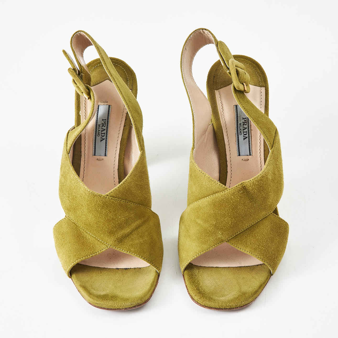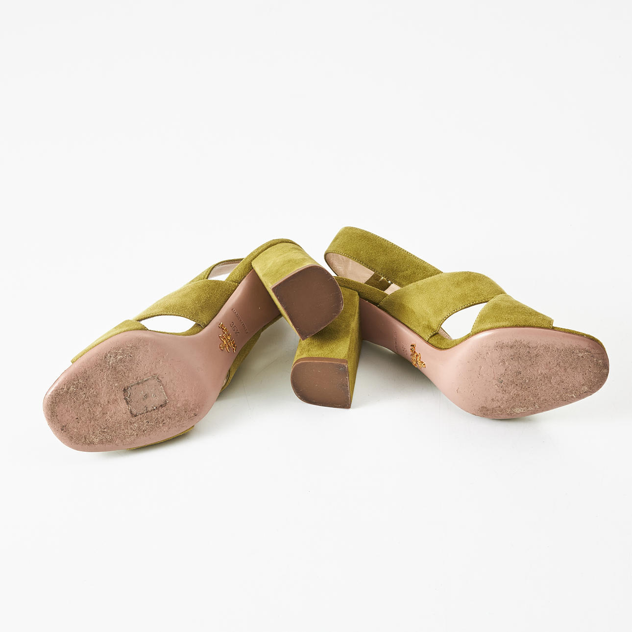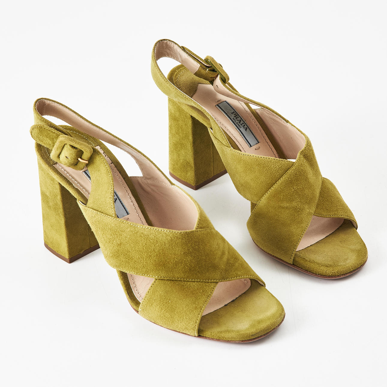 Green suede, buckle detail, marked "Prada made in Italy", size 37, heel height 7-8.5 cm