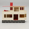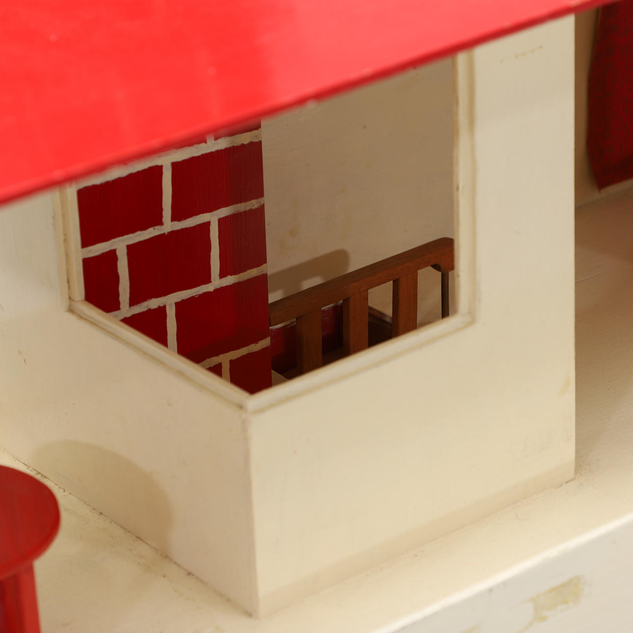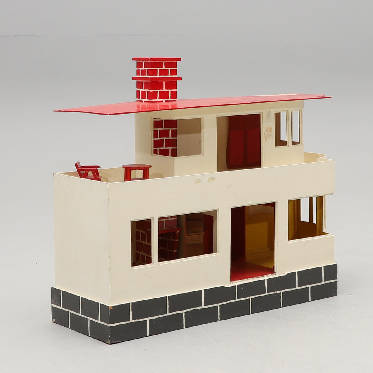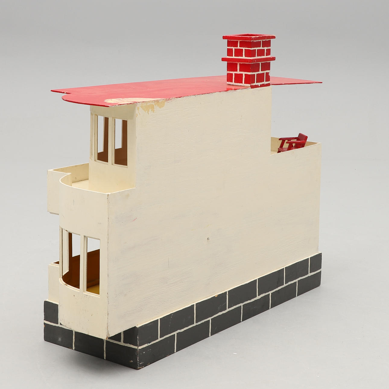 Painted wood dollhouse. Table and chair are loose. Dimensions: width 100, depth 32, height 80 cm.