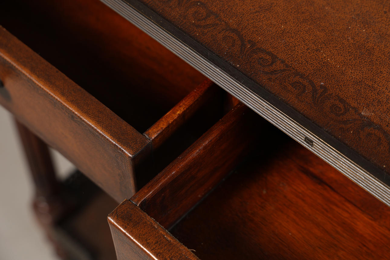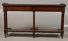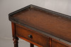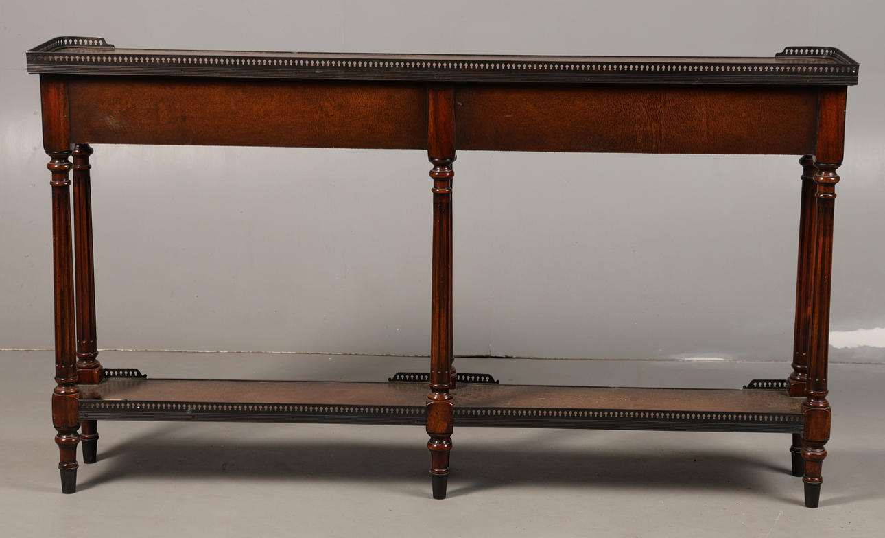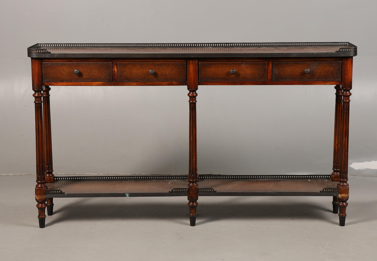 Having a pierced metal gallery above four drawers with reeded turn supports. Nice and bright undertier, 148cm wide 84cm high 24cm deep.