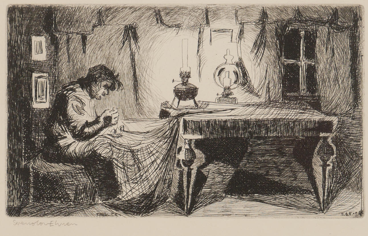 Etching. Picture dimensions 12,5x21 cm, frame dimensions 22x31 cm. Glazed wooden frame.