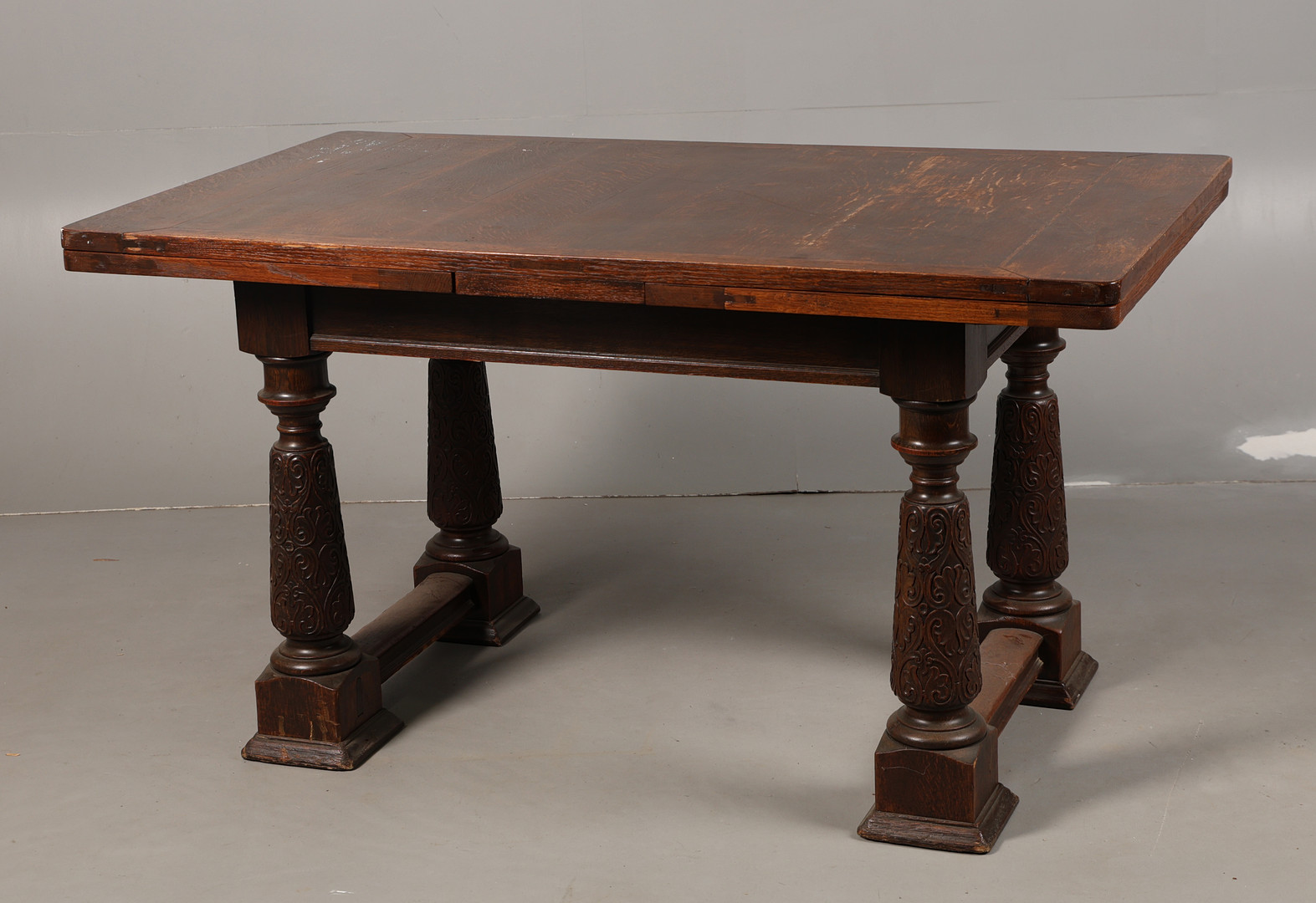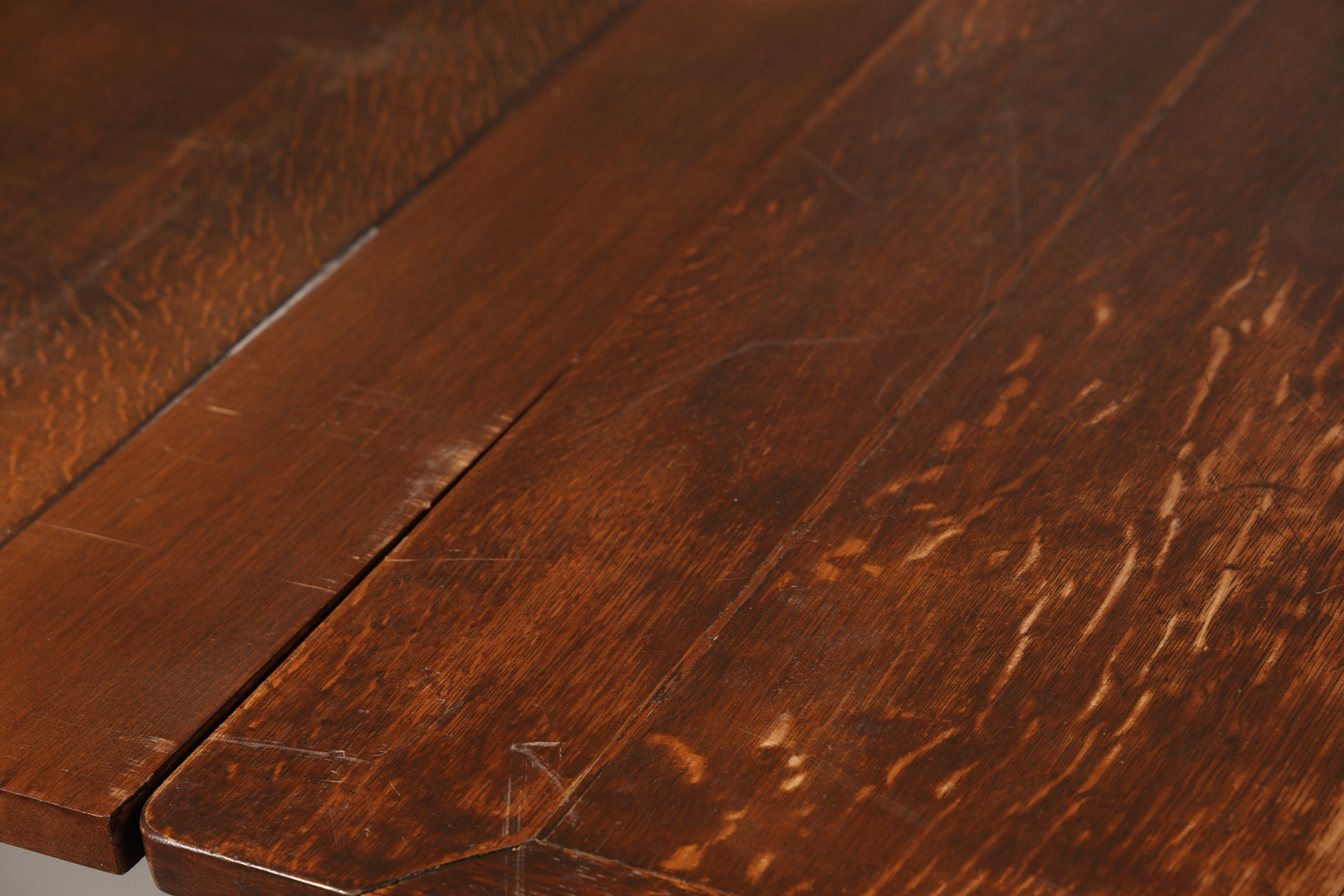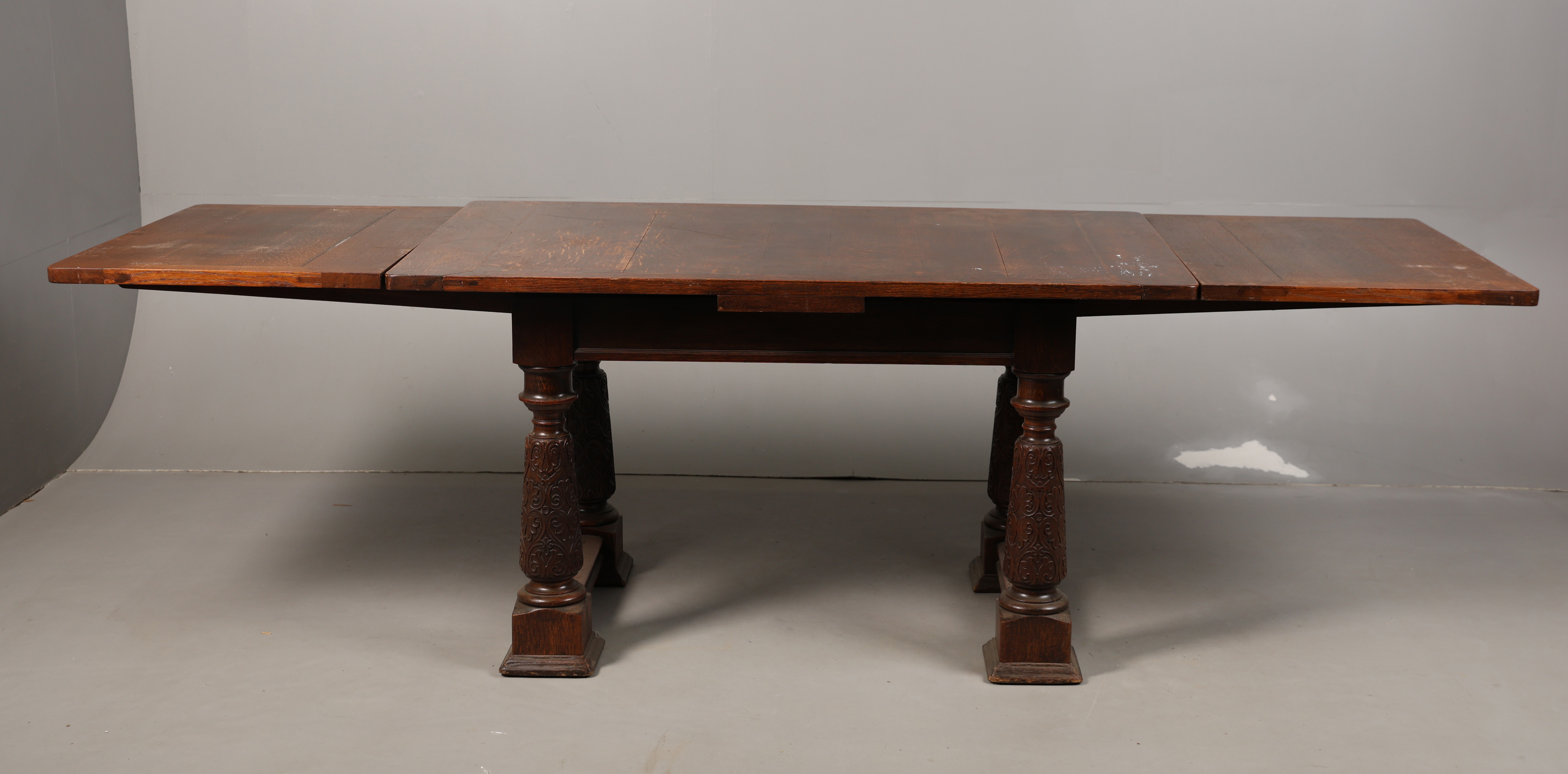 5005568. A 20TH CENTURY OAK DRAWER LEAF DINING TABLE.