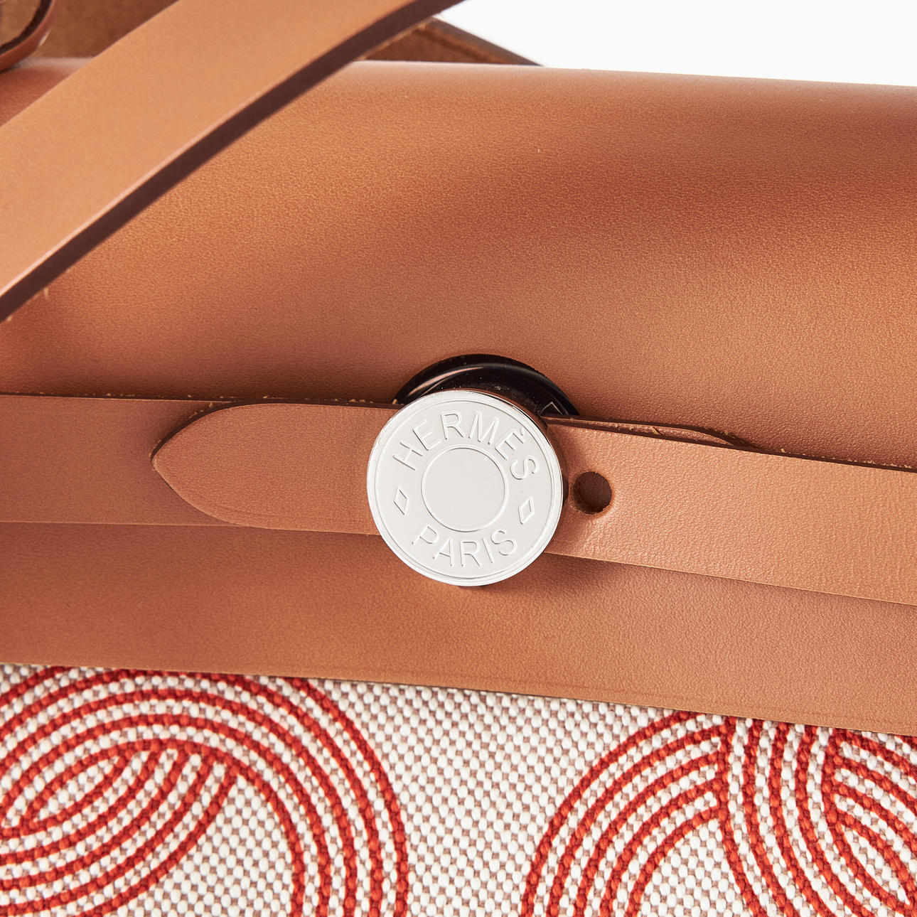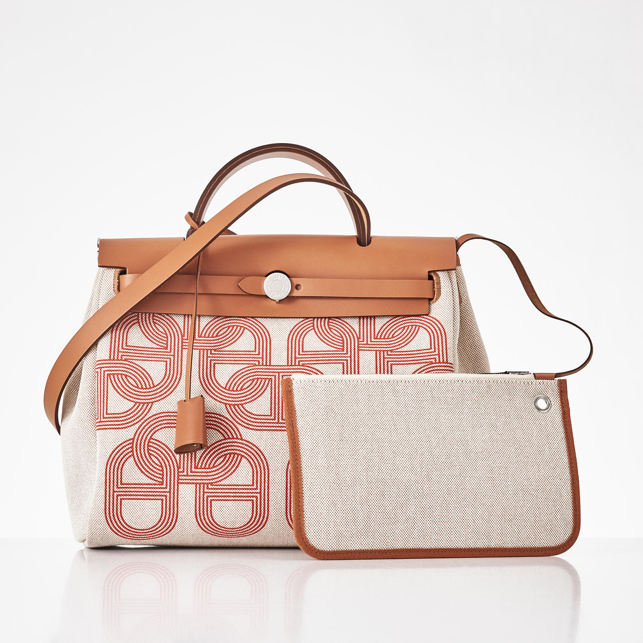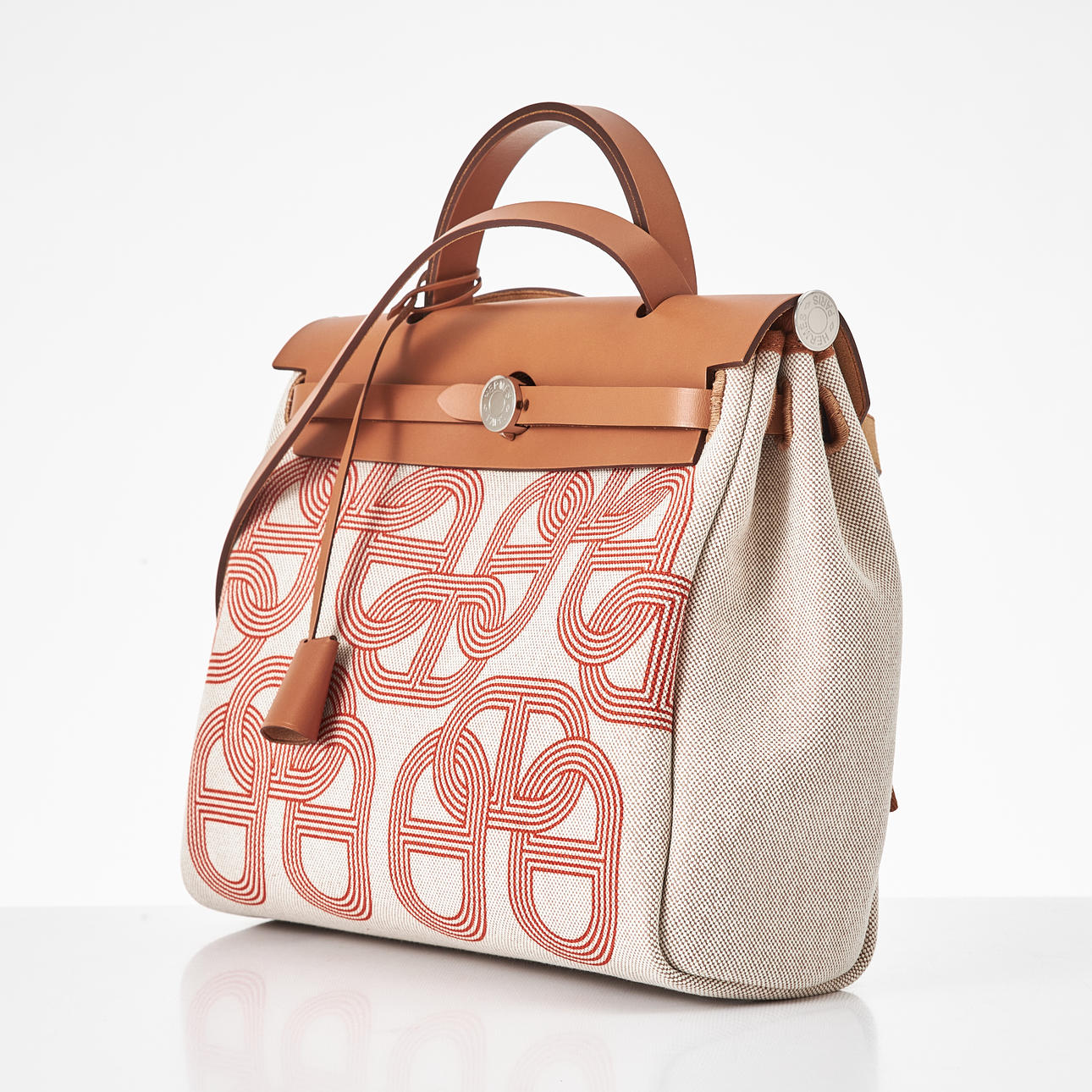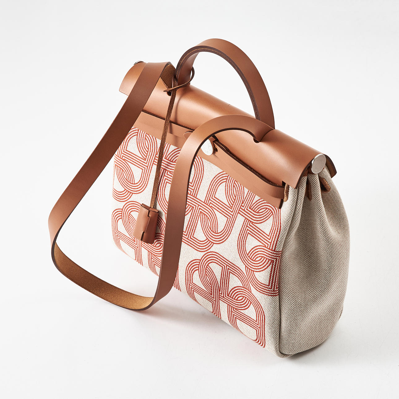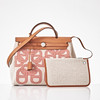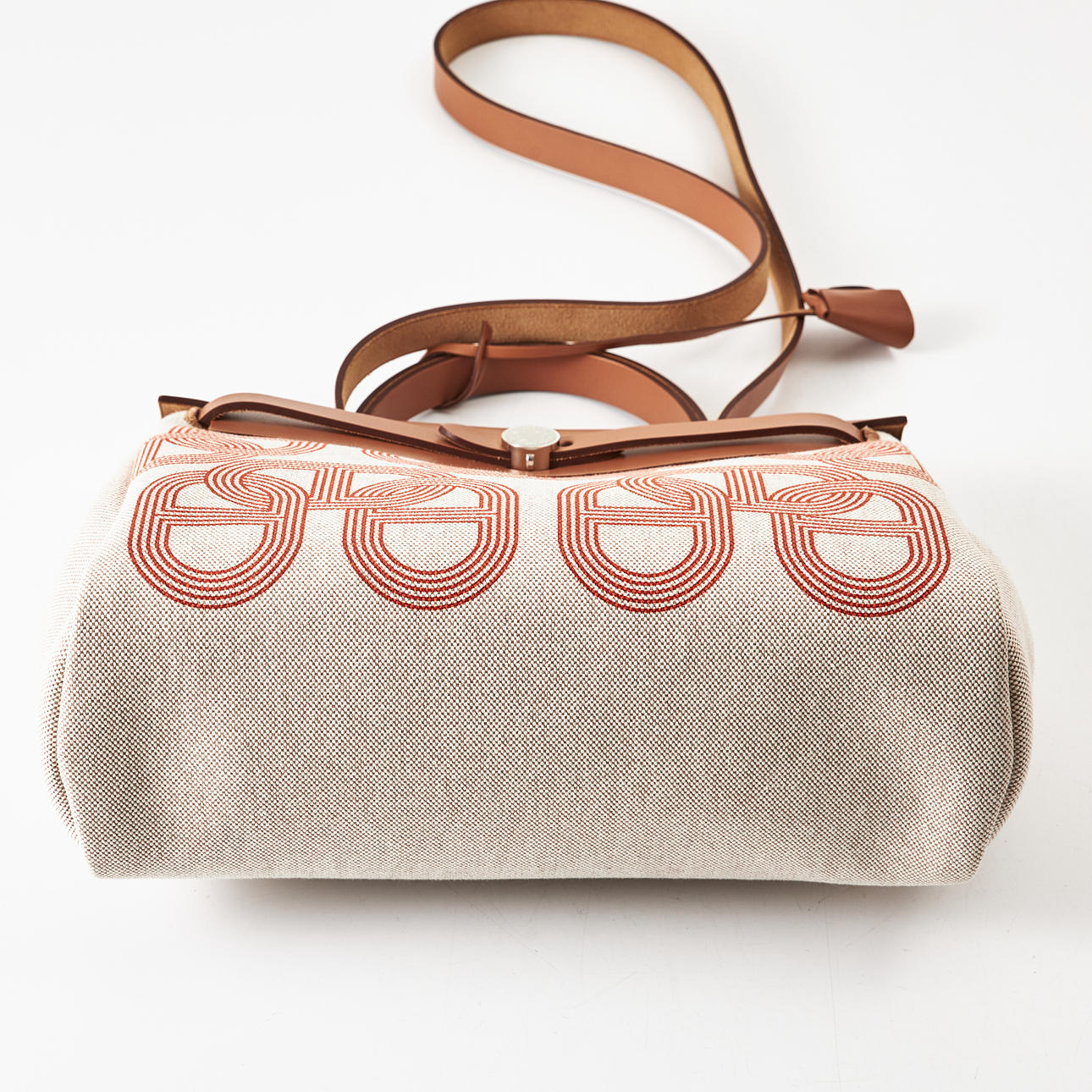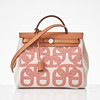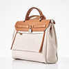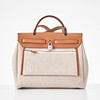 Canvas with "Circuit 24" motif, top handle and shoulder strap in light brown leather, "Clou de Selle" clasp in palladium, key in clochette, with padlock, exterior zip pocket on the back, interior with pochette, marked "Hermès Paris" and with date code U and artisan stamps, dimensions approx. 31 x 25 x 13 cm