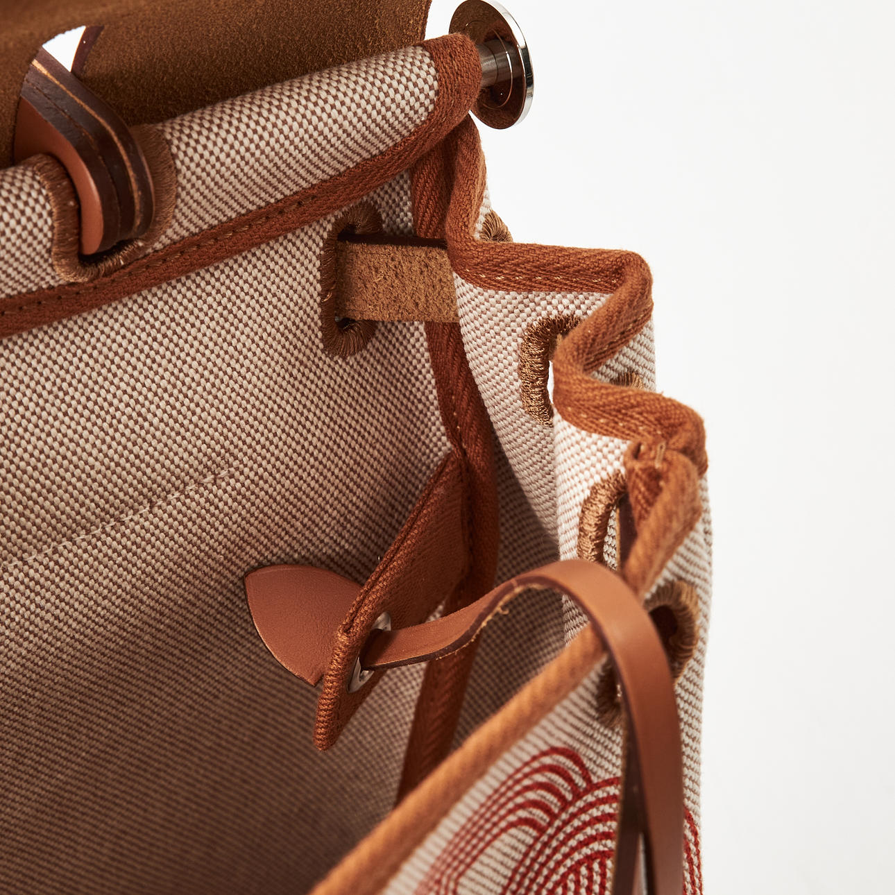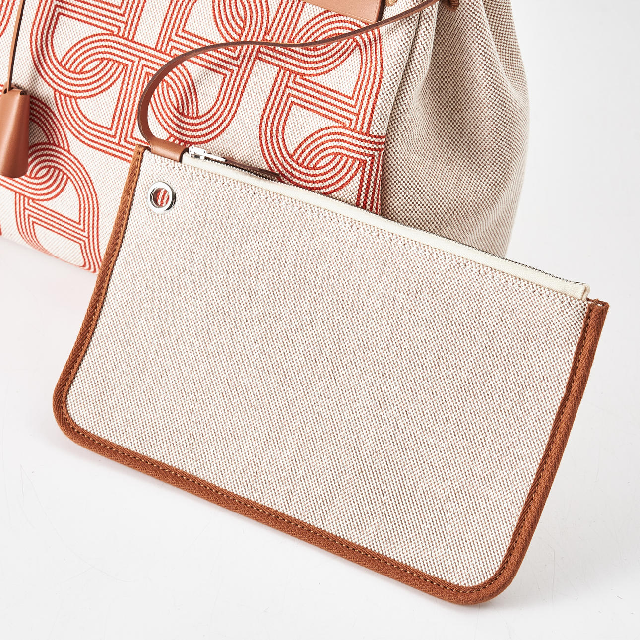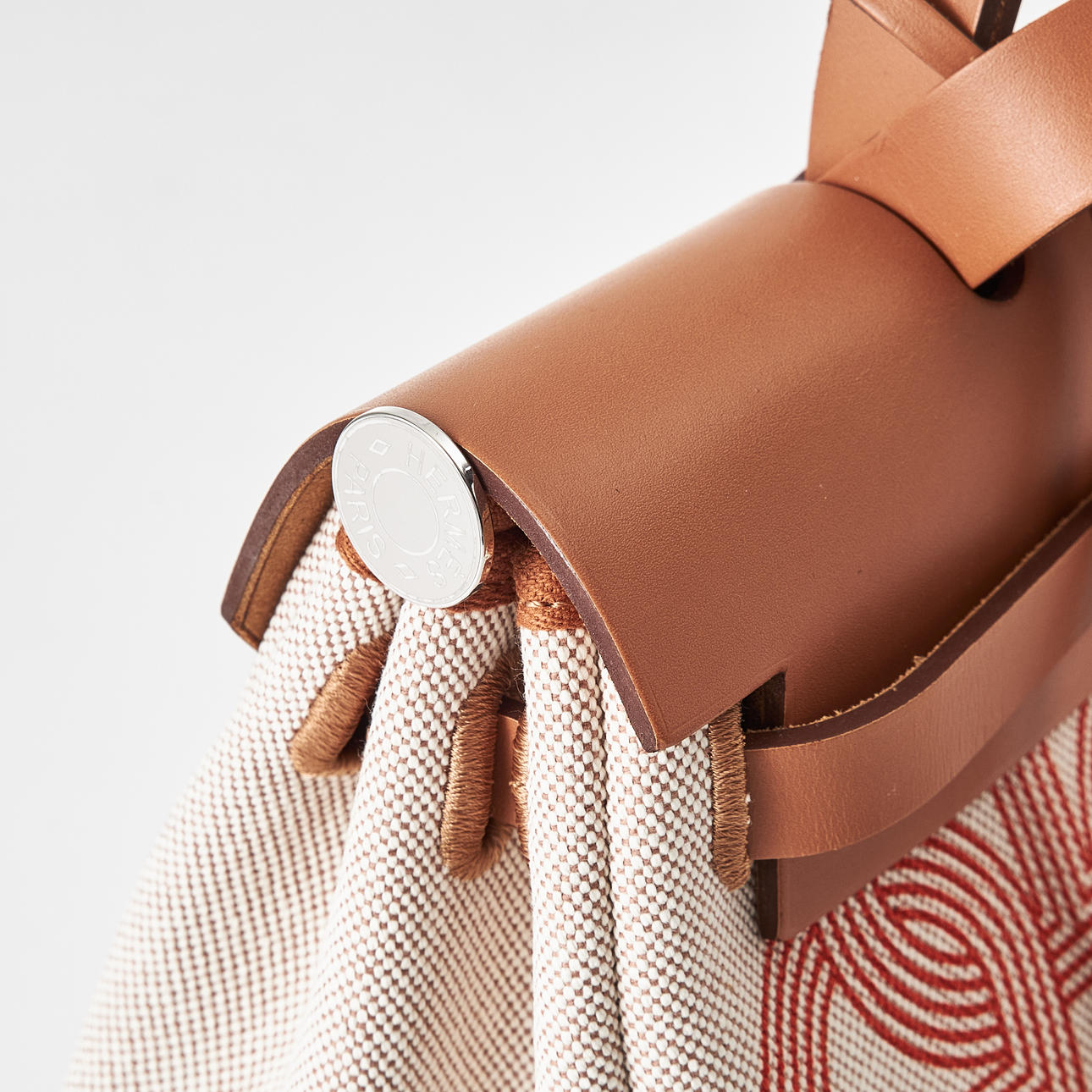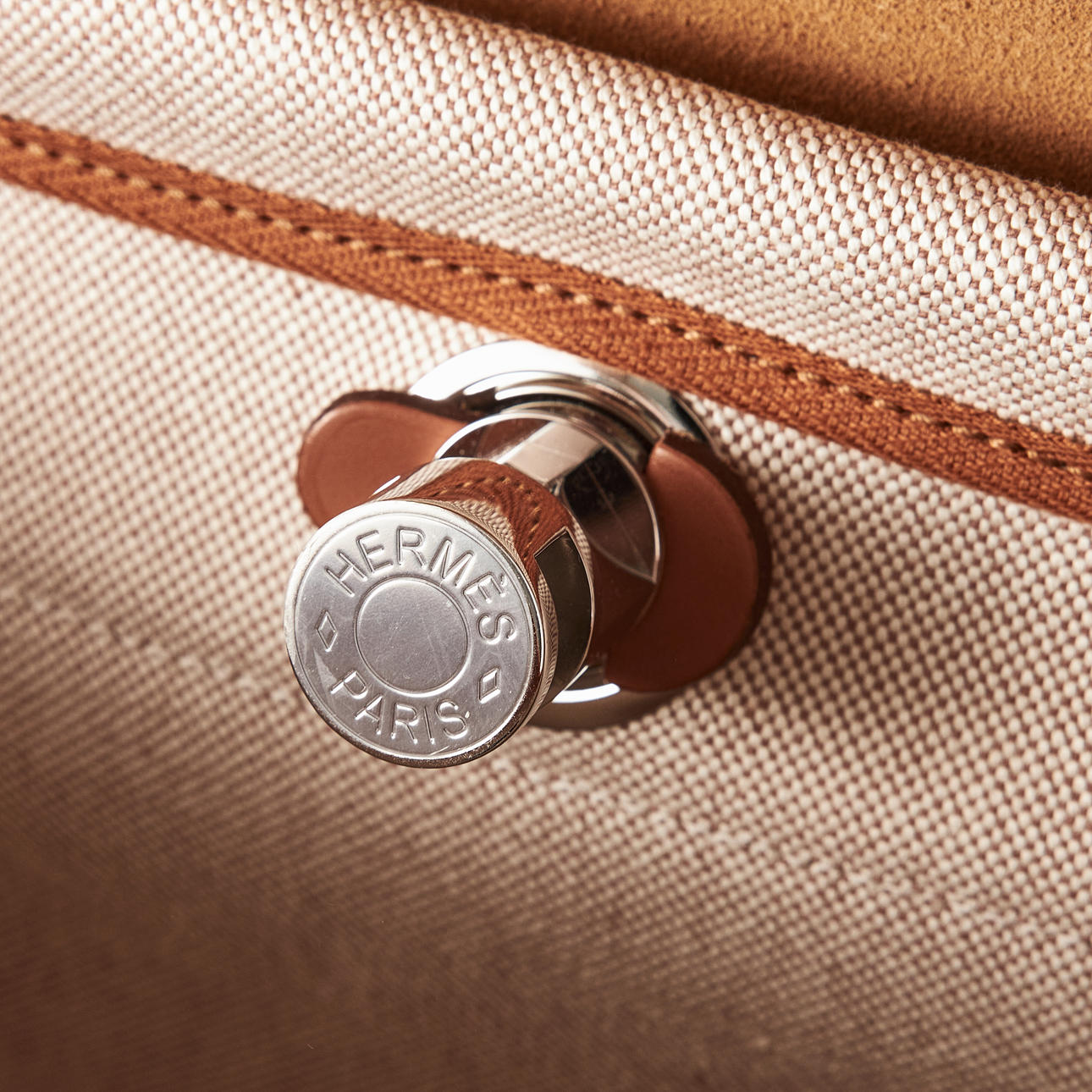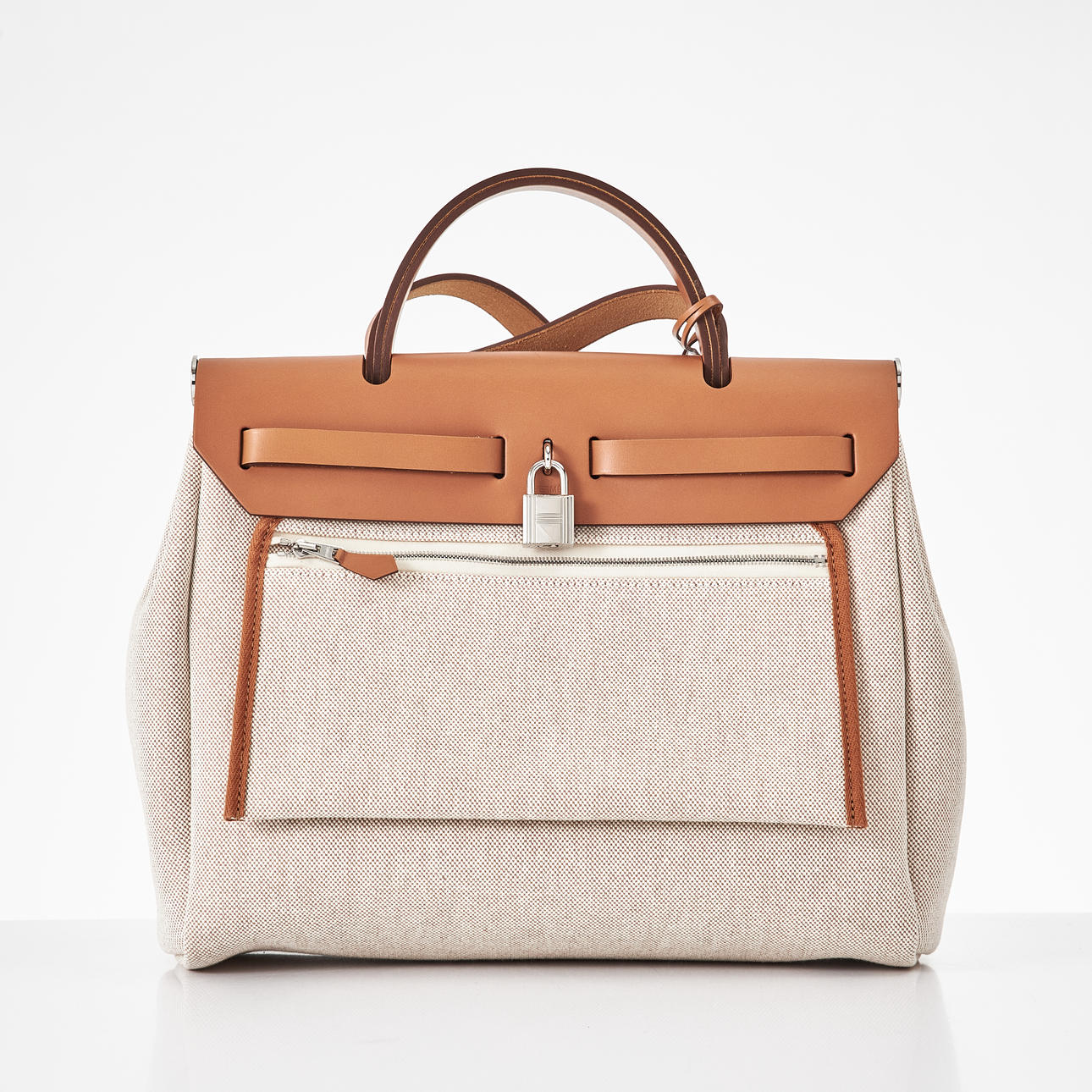 Canvas with "Circuit 24" motif, top handle and shoulder strap in light brown leather, "Clou de Selle" clasp in palladium, key in clochette, with padlock, exterior zip pocket on the back, interior with pochette, marked "Hermès Paris" and with date code U and artisan stamps, dimensions approx. 31 x 25 x 13 cm
