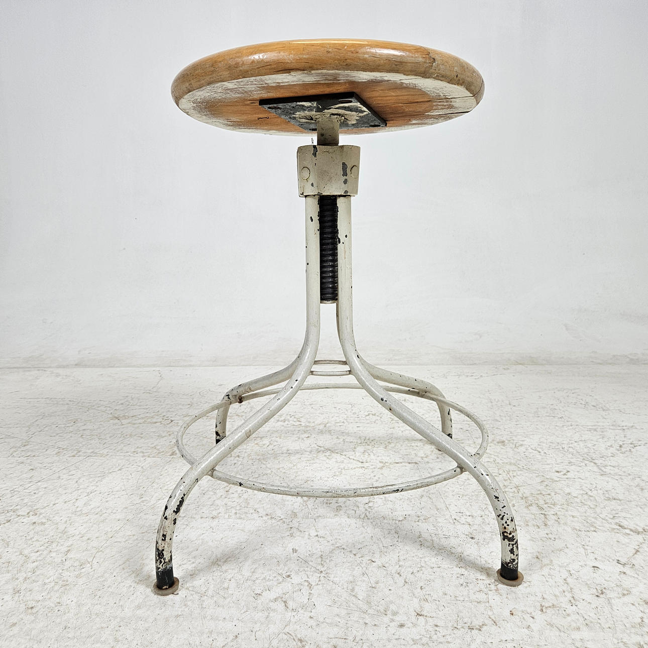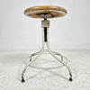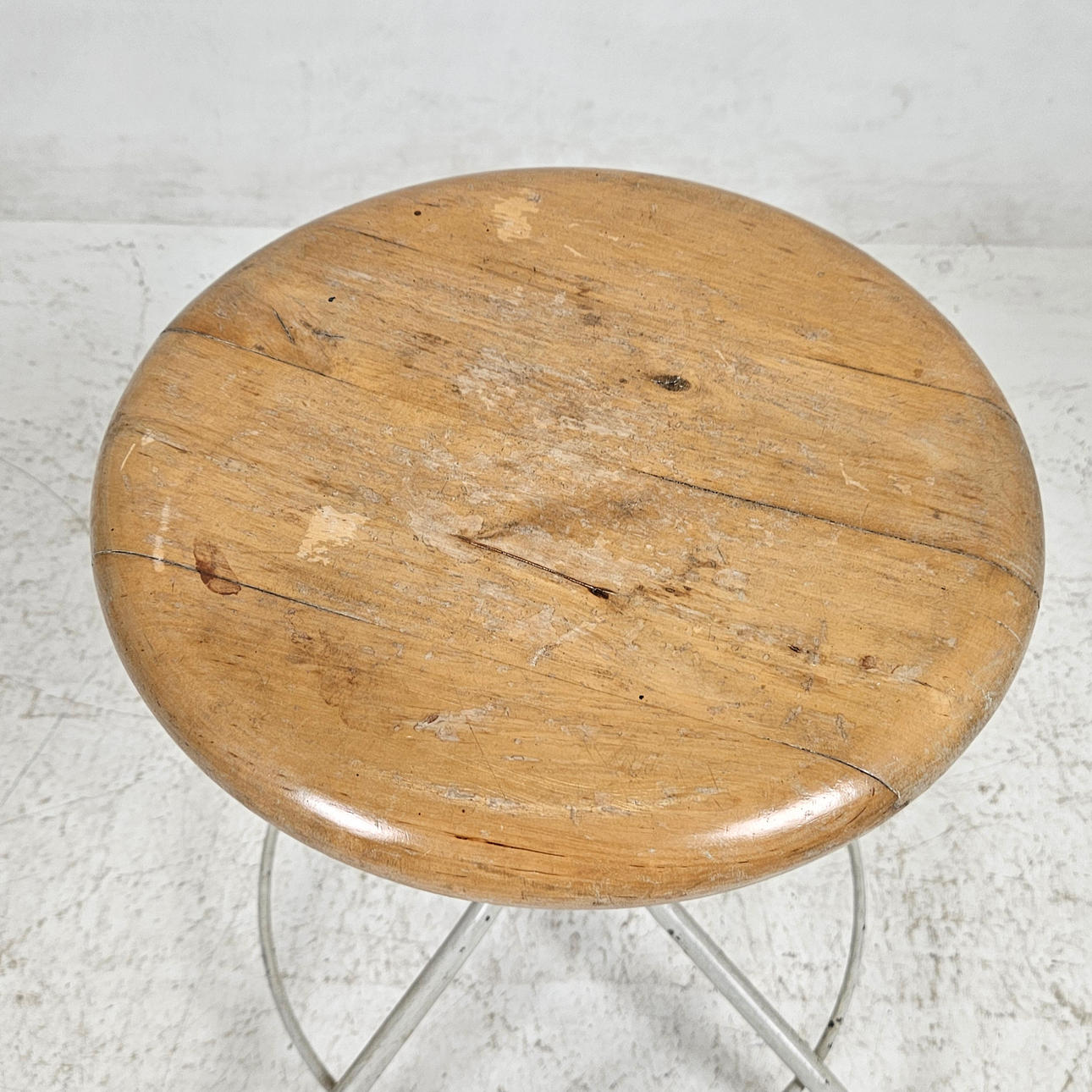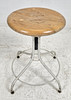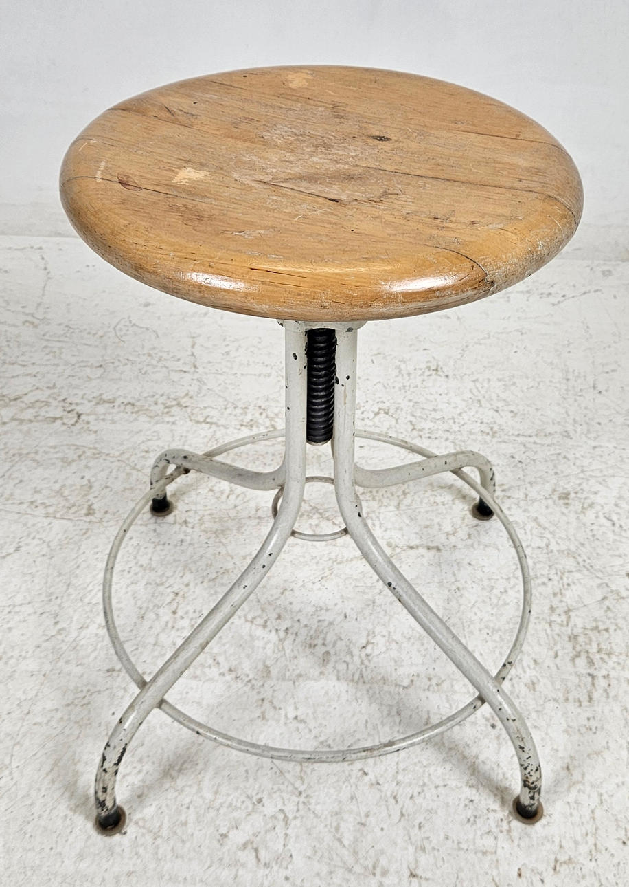 Painted metal legs, round wooden seat, diameter approx. 38 cm. Raisable and lowering, minimum height approx. 49 cm.