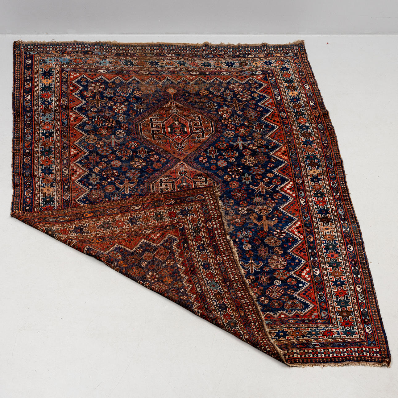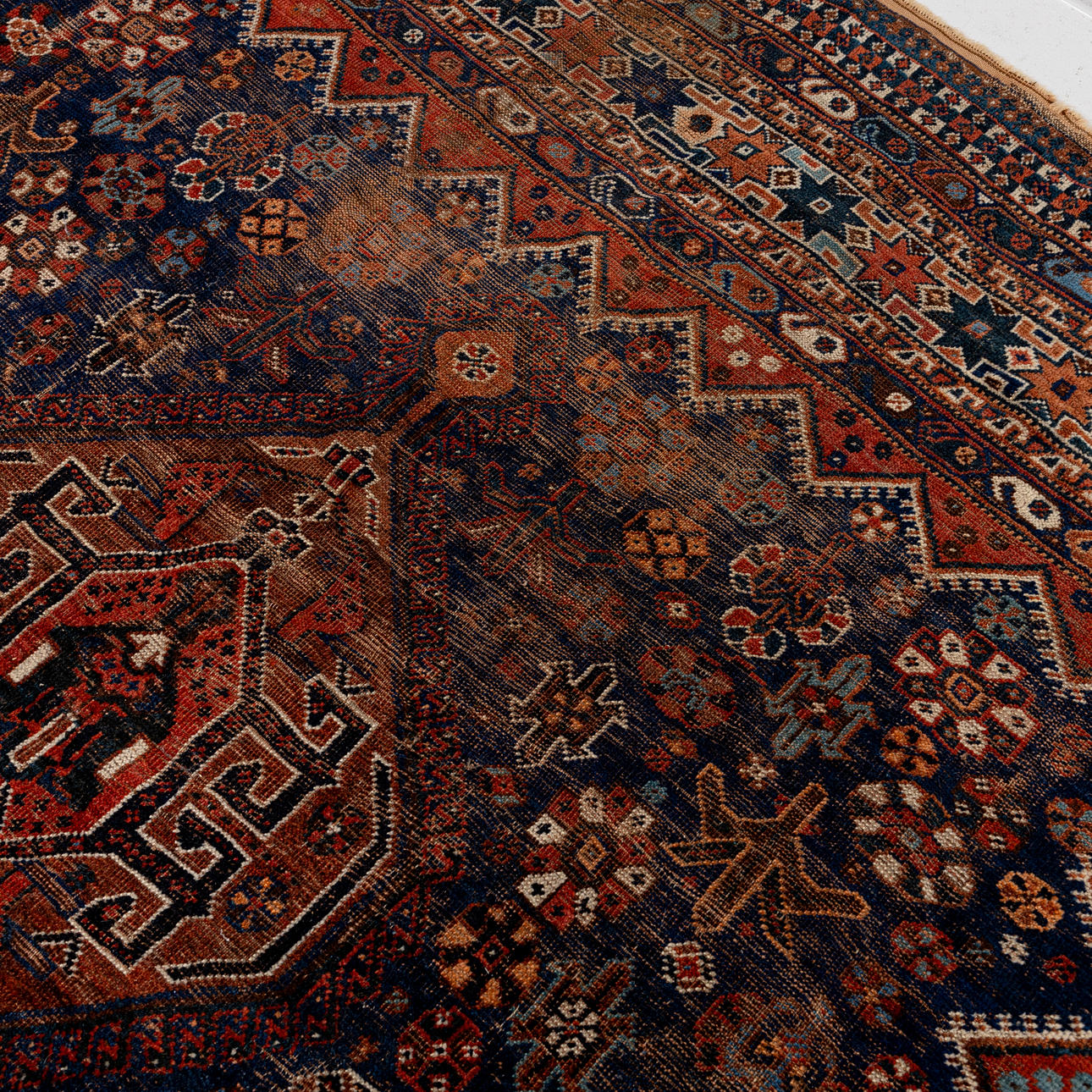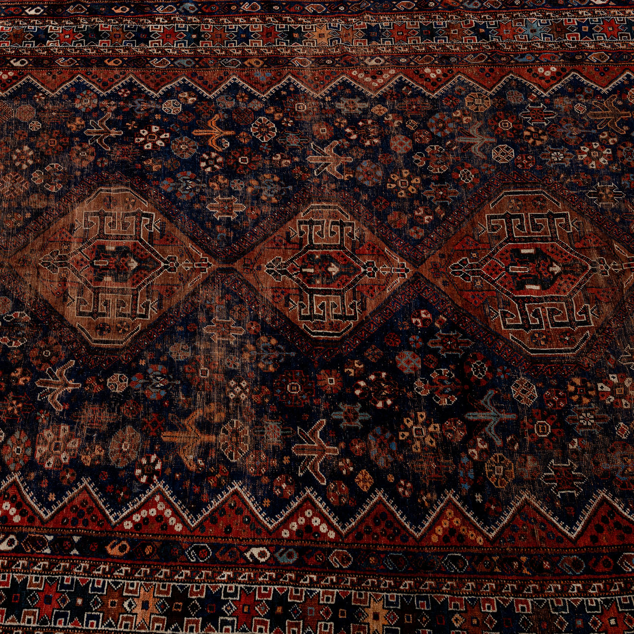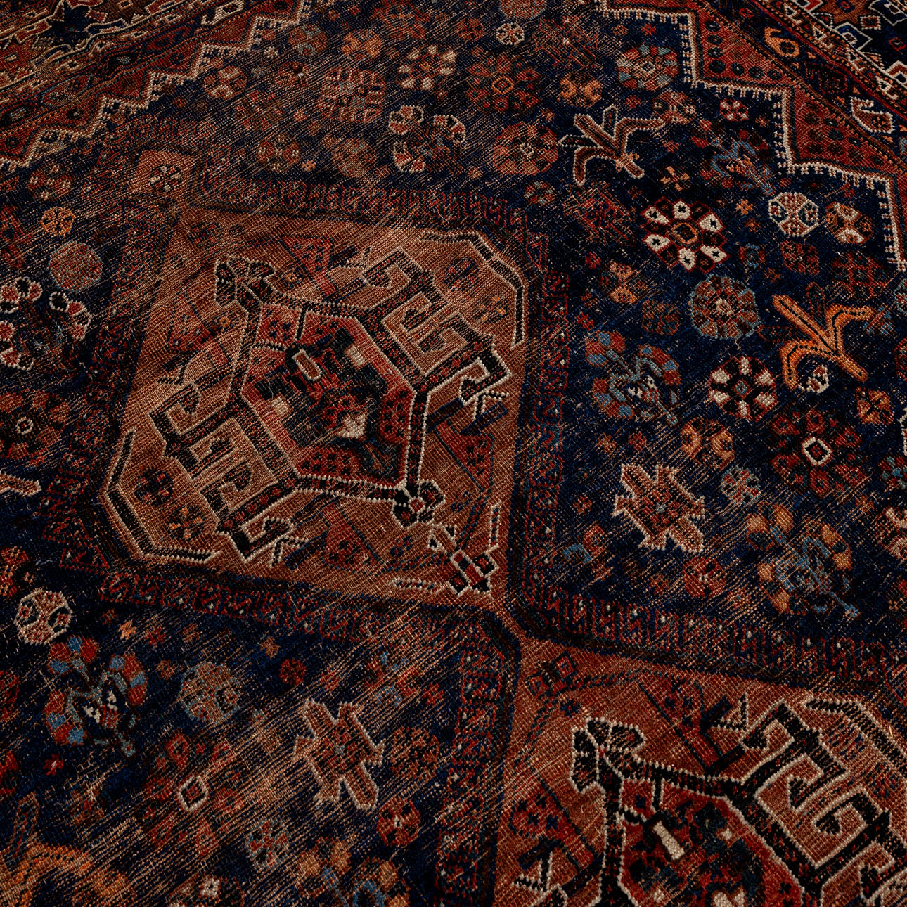 Dark blue base with polychrome stylized floral, star-shaped and boteh pattern, 3 medallions, approx. 311x228 cm.