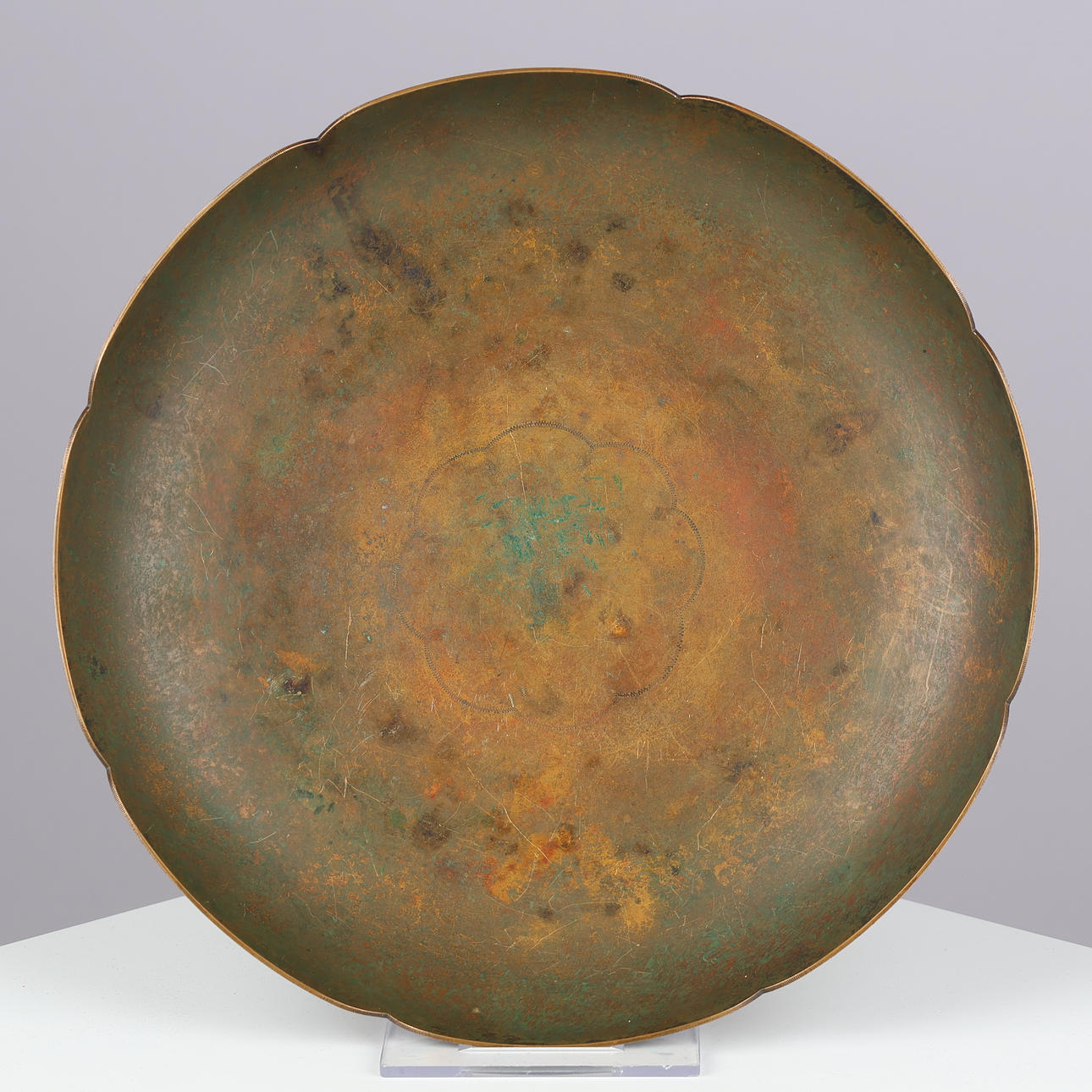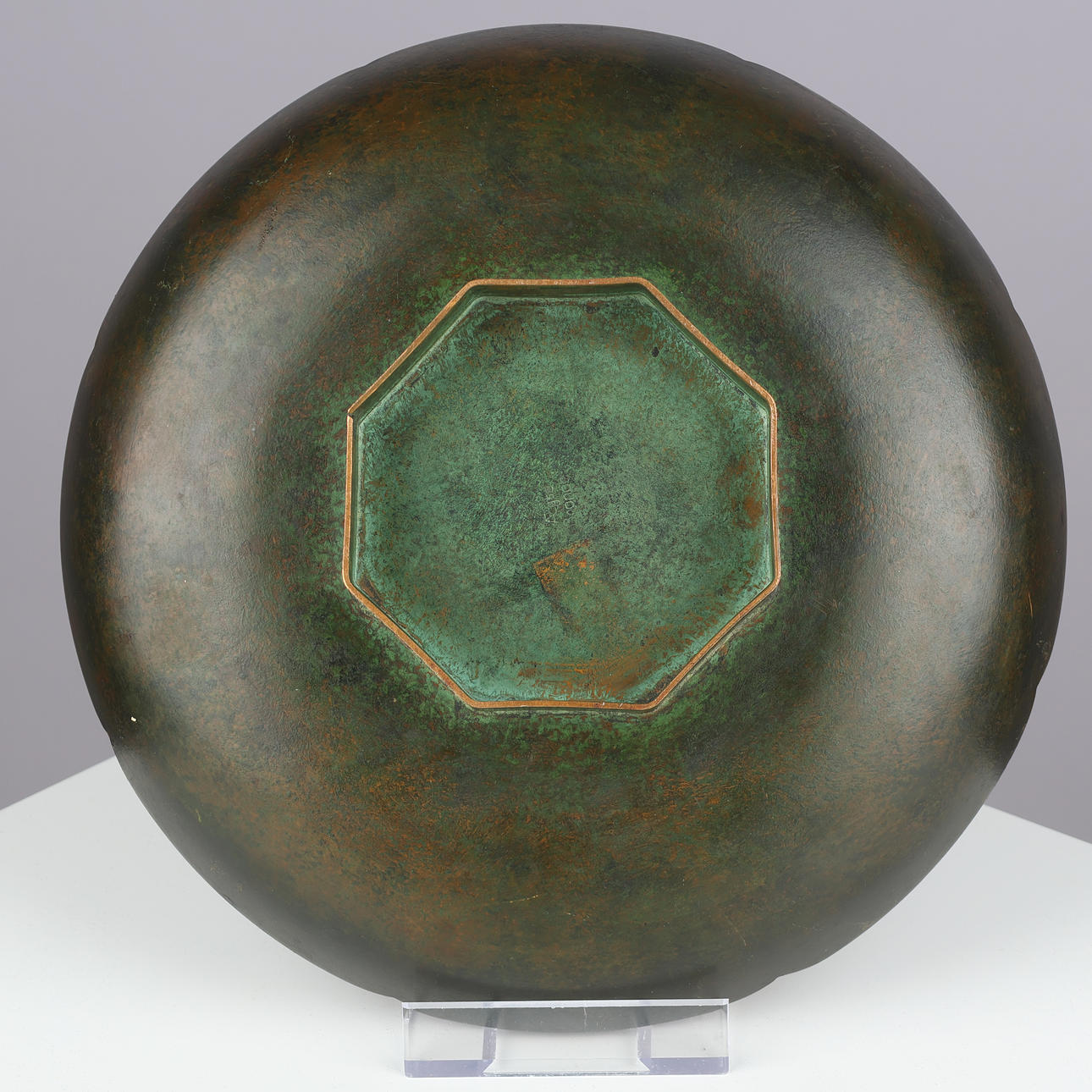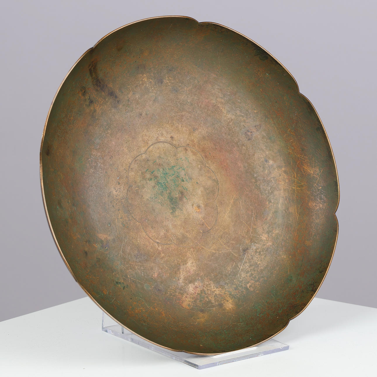 Plate of patinated bronze with undulating edge and octagonal base. Tagged “True bronze”.