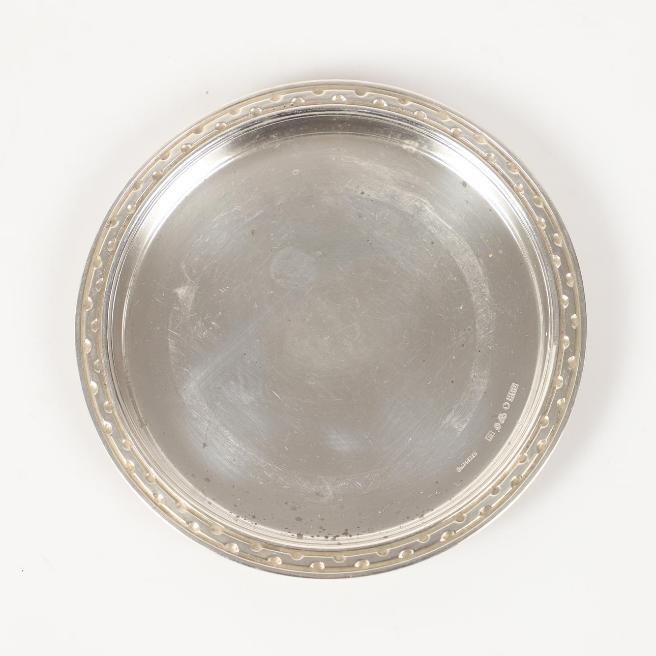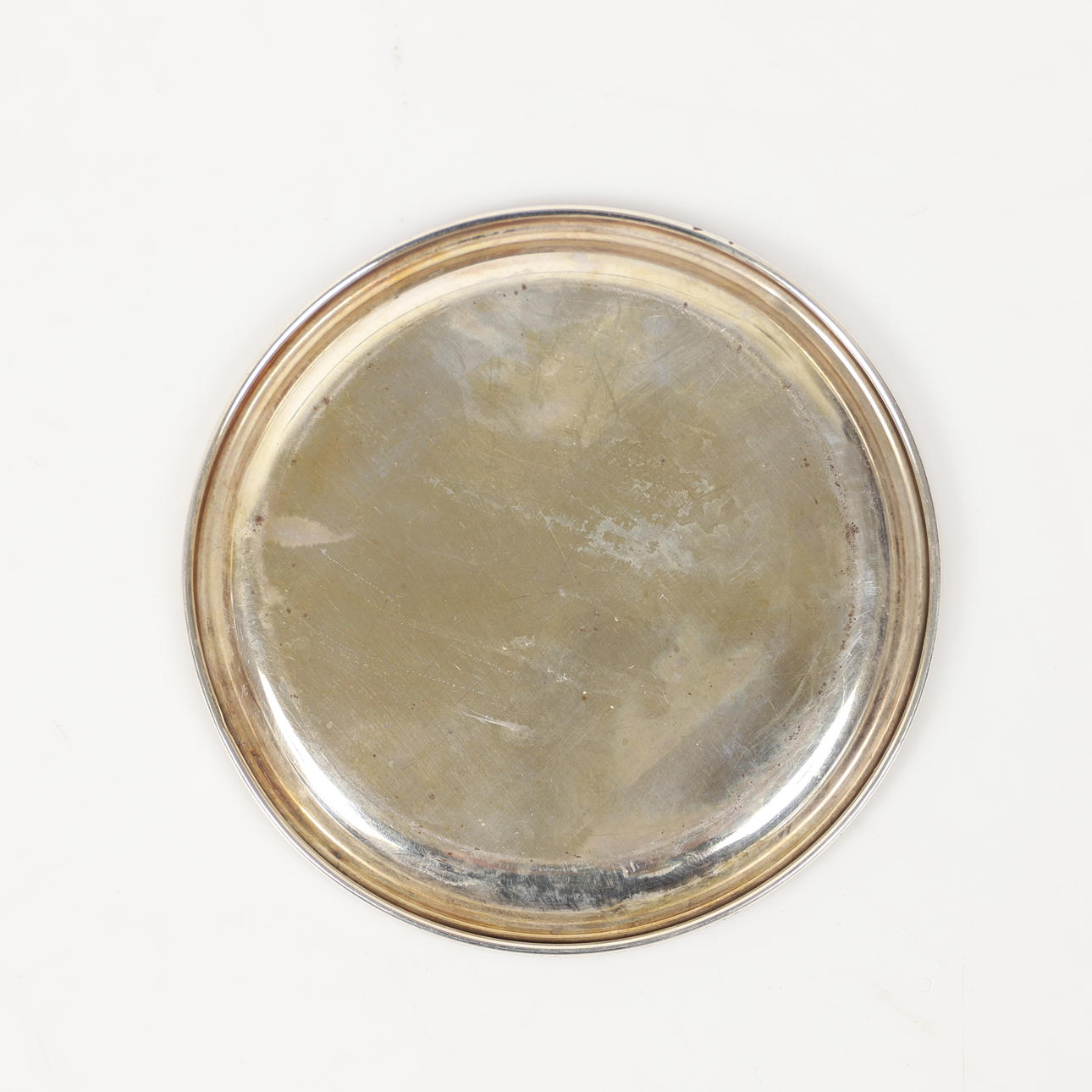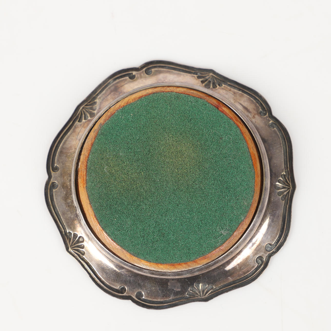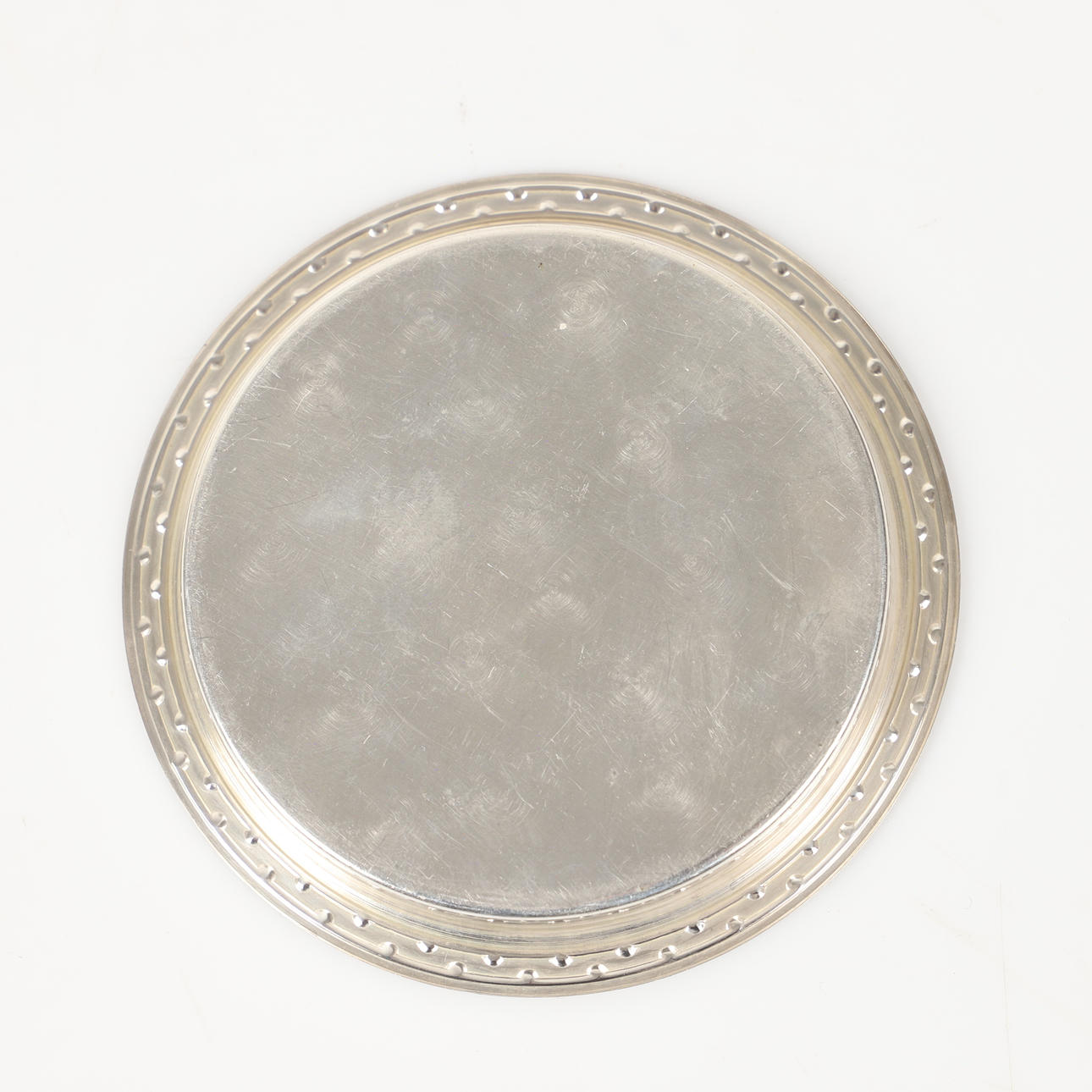 2 pieces, silver, diameter 8-10 cm, total weight 56 grams 1 piece, nickel silver with wooden base, diameter 9 cm.