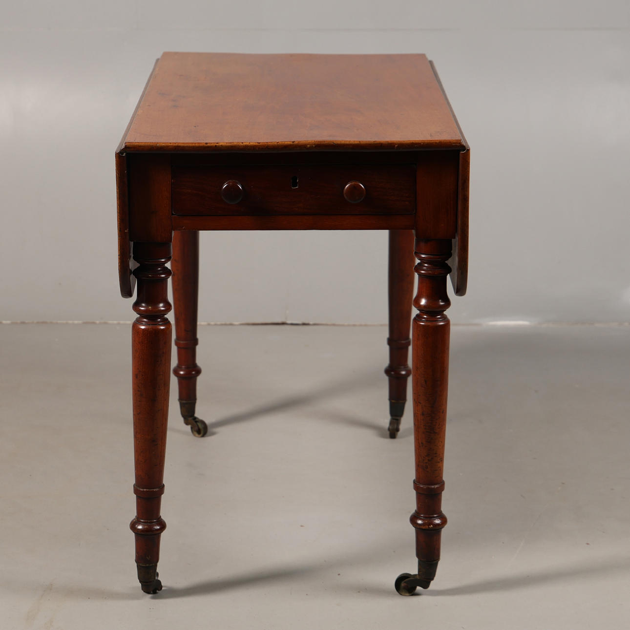 Having a pair of dropped leaves and a single drawer to one end, raised on turned legs with casters, 91cm wide 73c,m high 51cm deep.