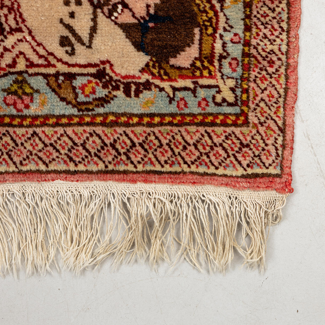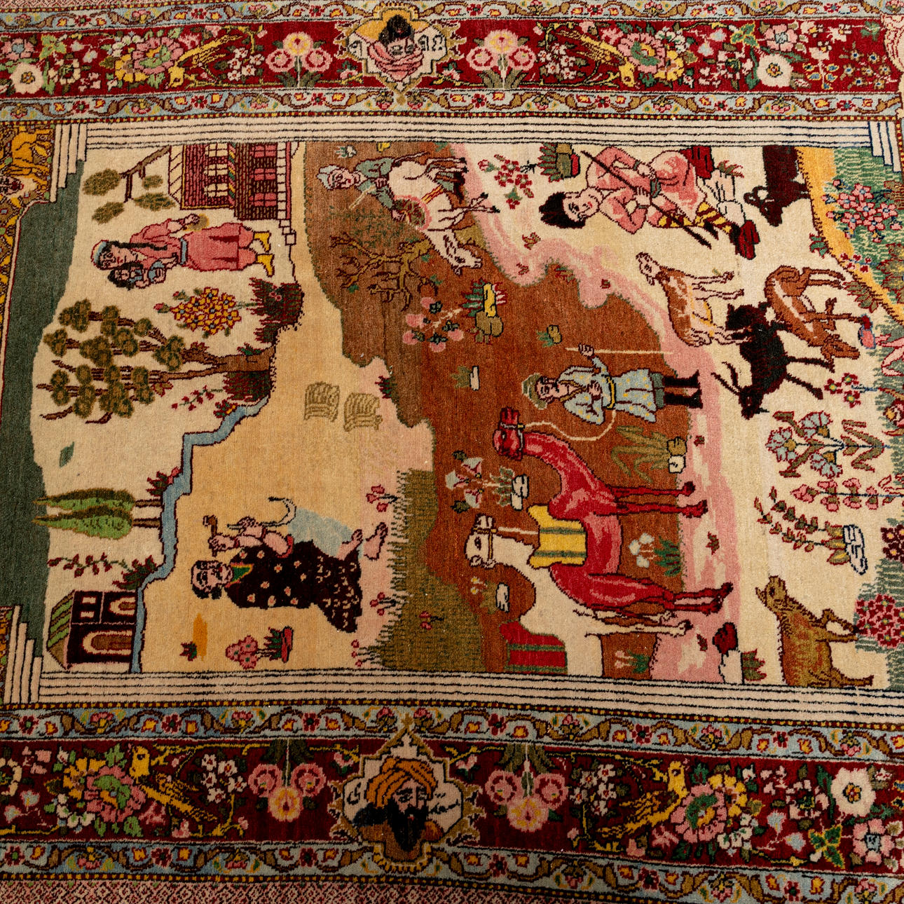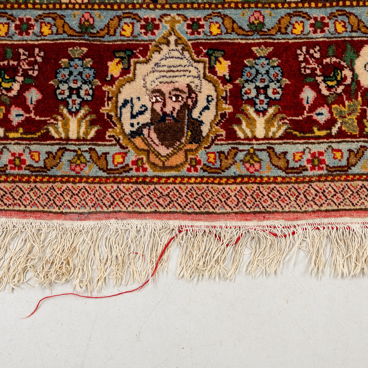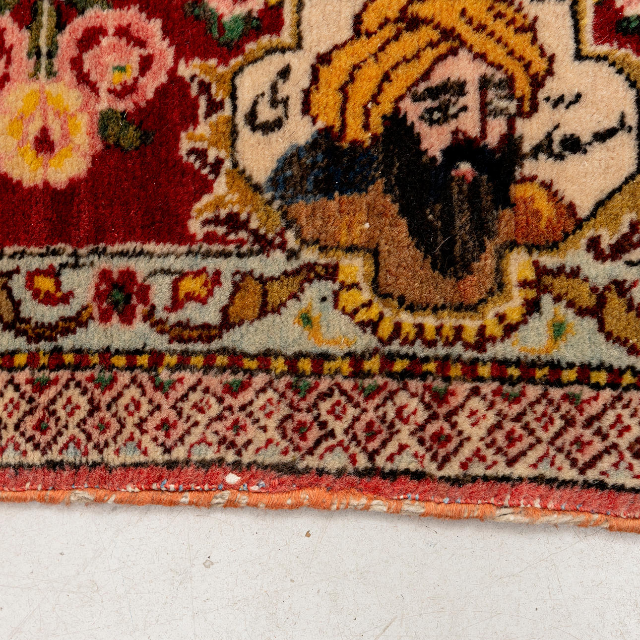 Beige base, polychrome figural pattern with animals and people, medallions with male face, approx. 192x136 cm.