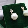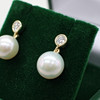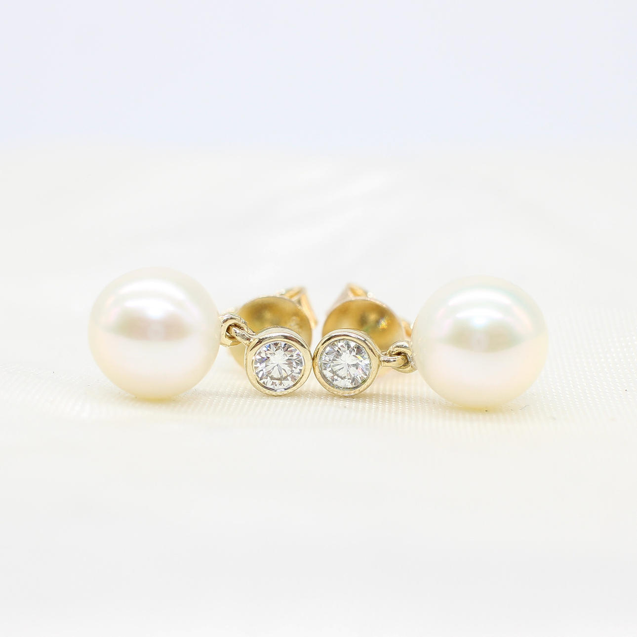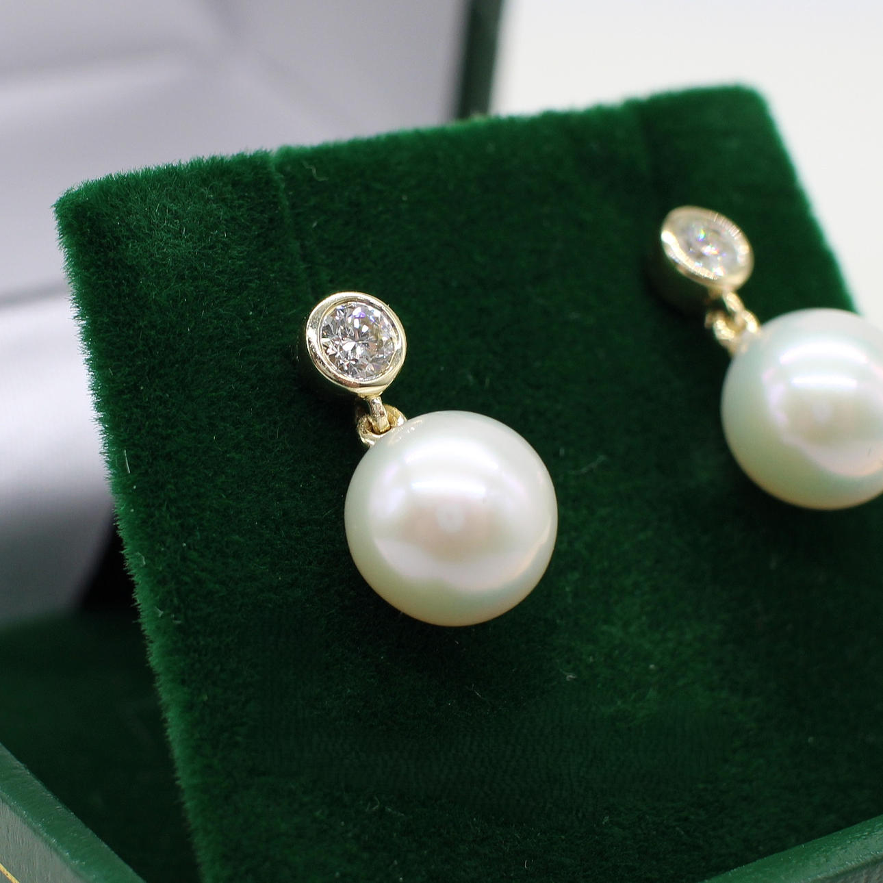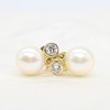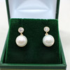 A pair of 9k yellow gold (stamped 9k) earrings set with round brilliant cut diamond bales and suspended white cultured pearls.