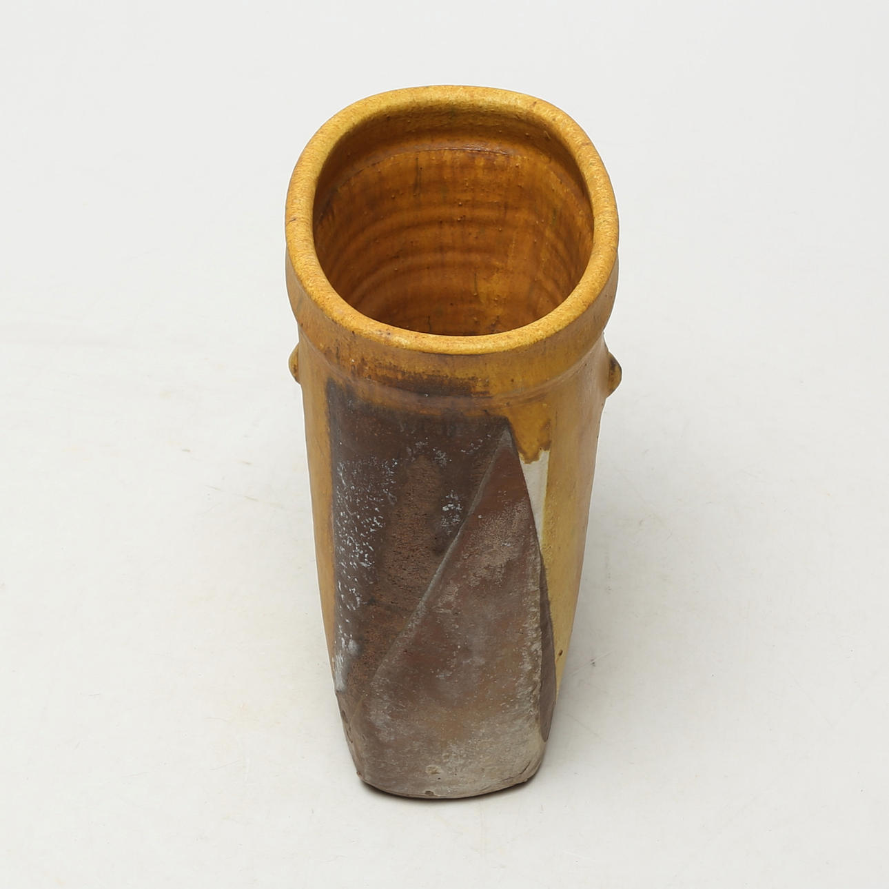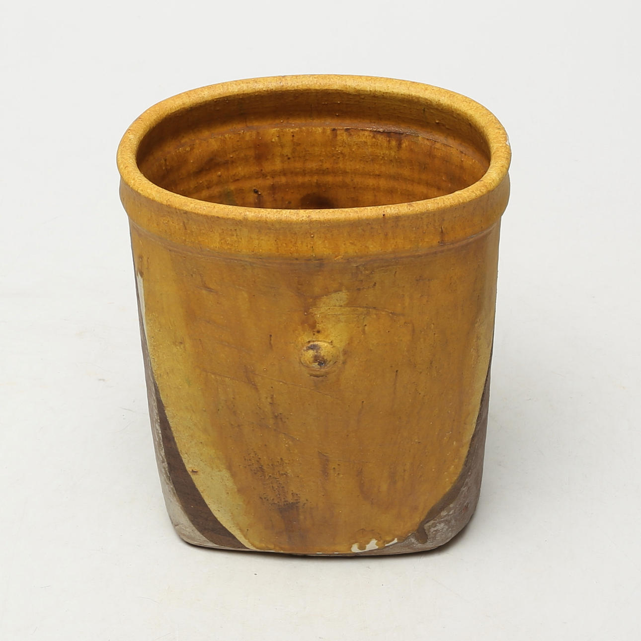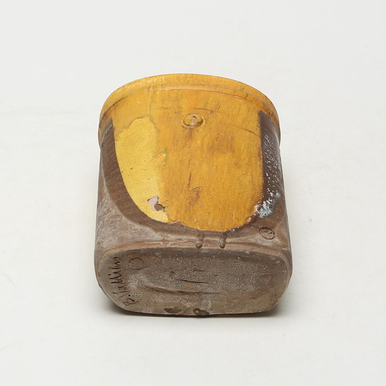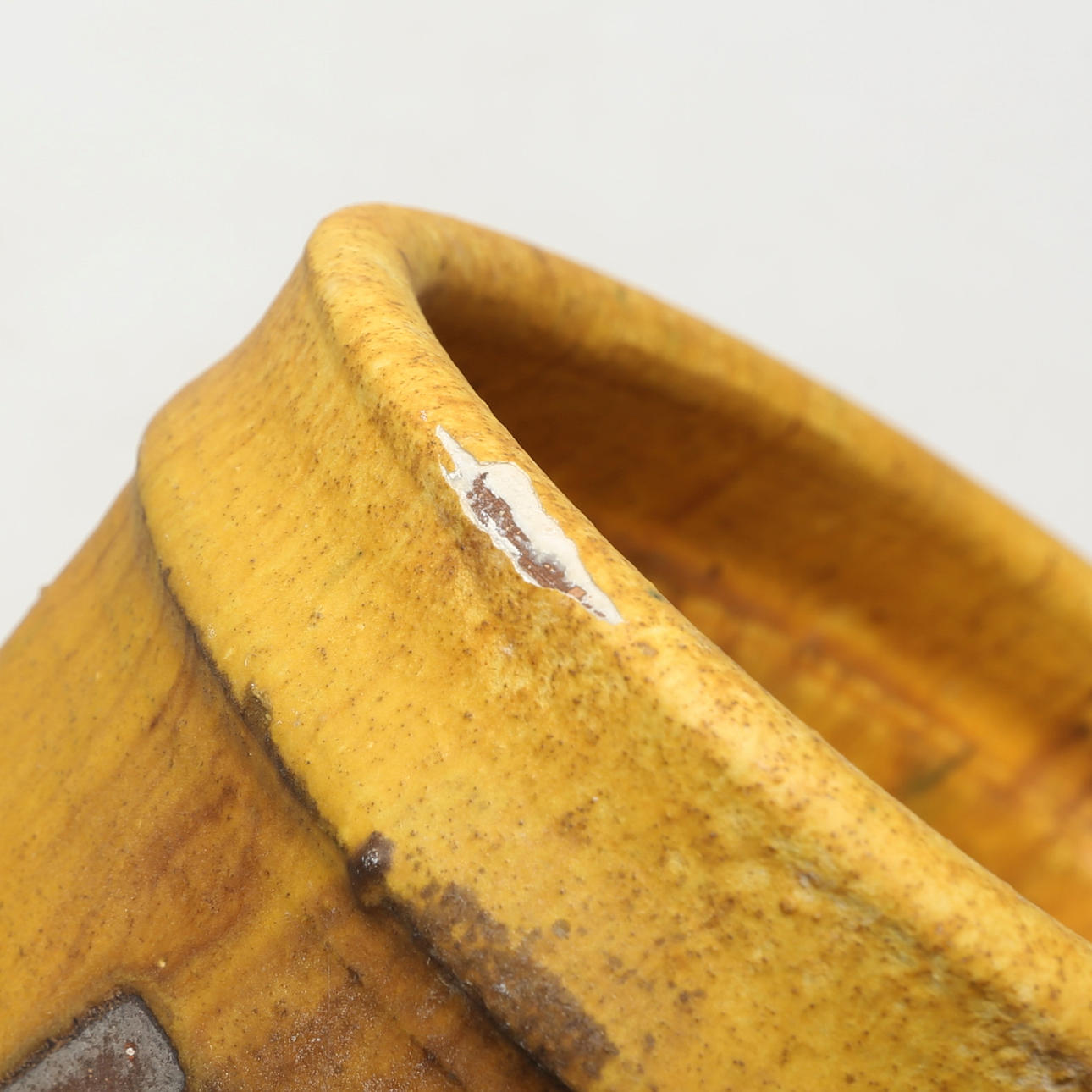 Glaze chip at mouth edge. Glaze flake of about 2 cm has come off on the side.
