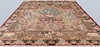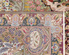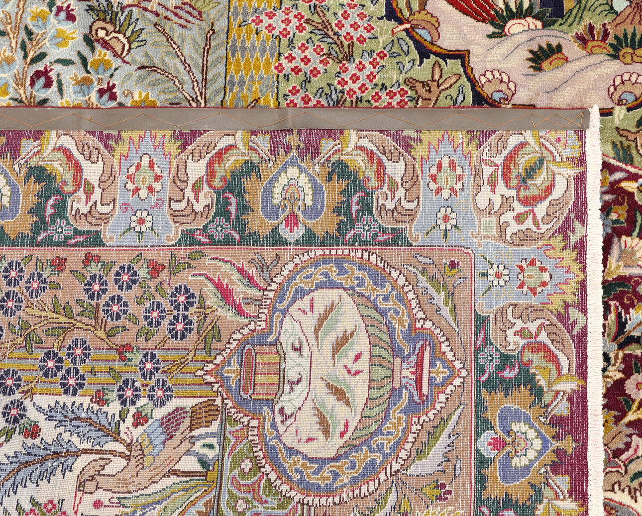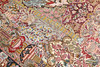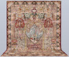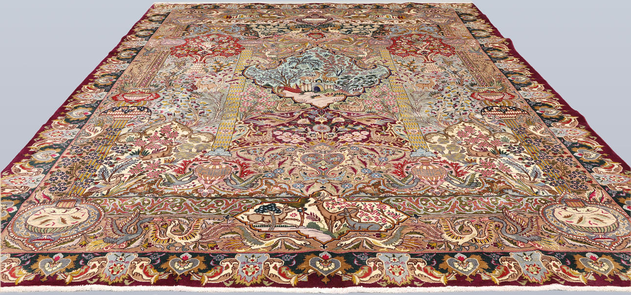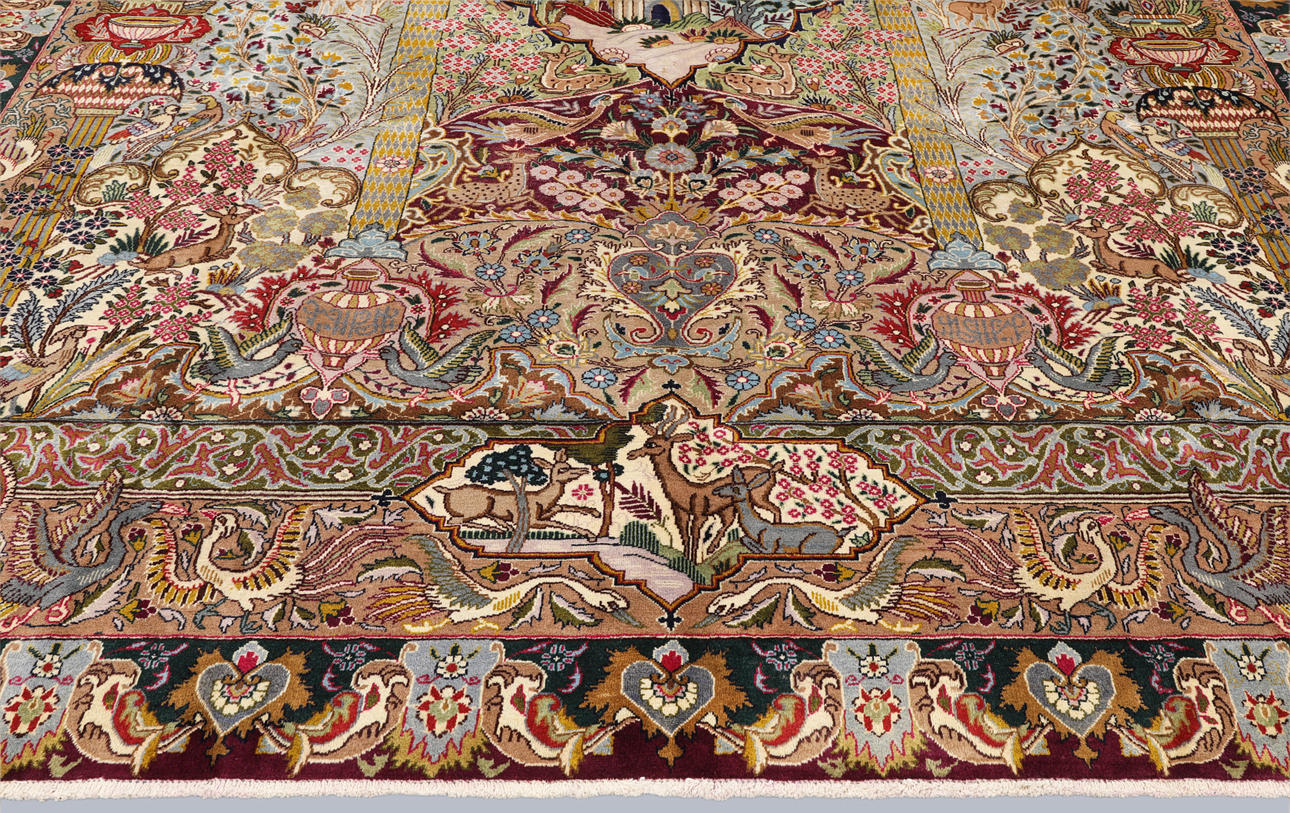 Figural Kashmar with a light ground and a field covered in figural scenes with animals, architectural motifs, vase and floral motifs in wine red, beige, green, dark blue and light blue. The border has a dark green ground with decoration of palmettes and floral motifs, as well as a wine red outer guard stripe. The pile is wool and the warp is cotton.