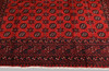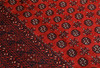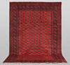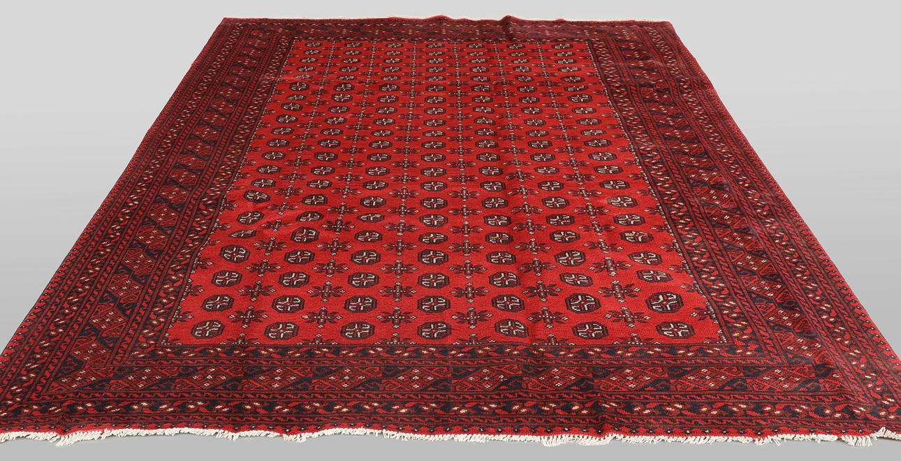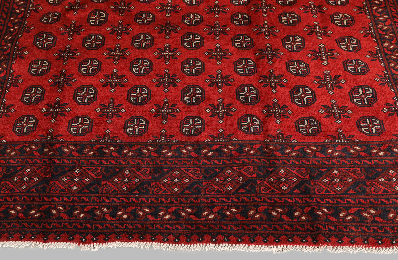 Afghan with red ground colour and a centre field covered in small repeating gull motifs in dark blue. The border consists of several rows of repeating geometric patterns in similar colors. The bangs are made of wool and the warp is made of cotton.