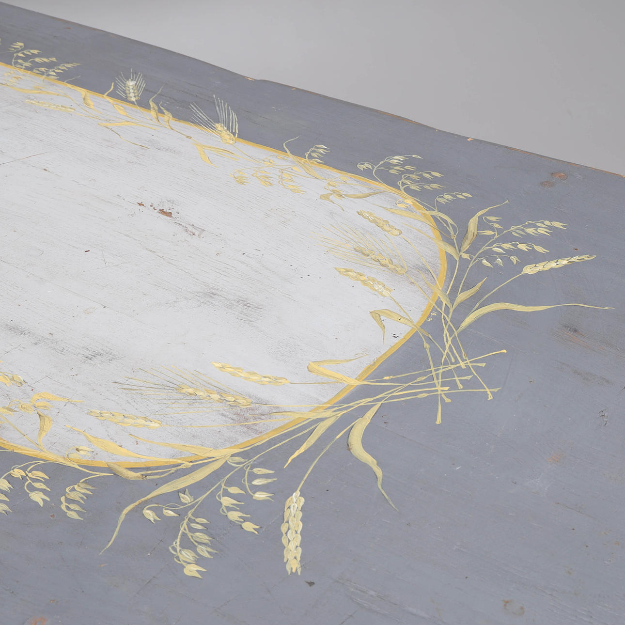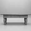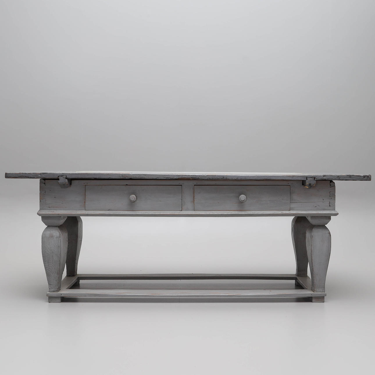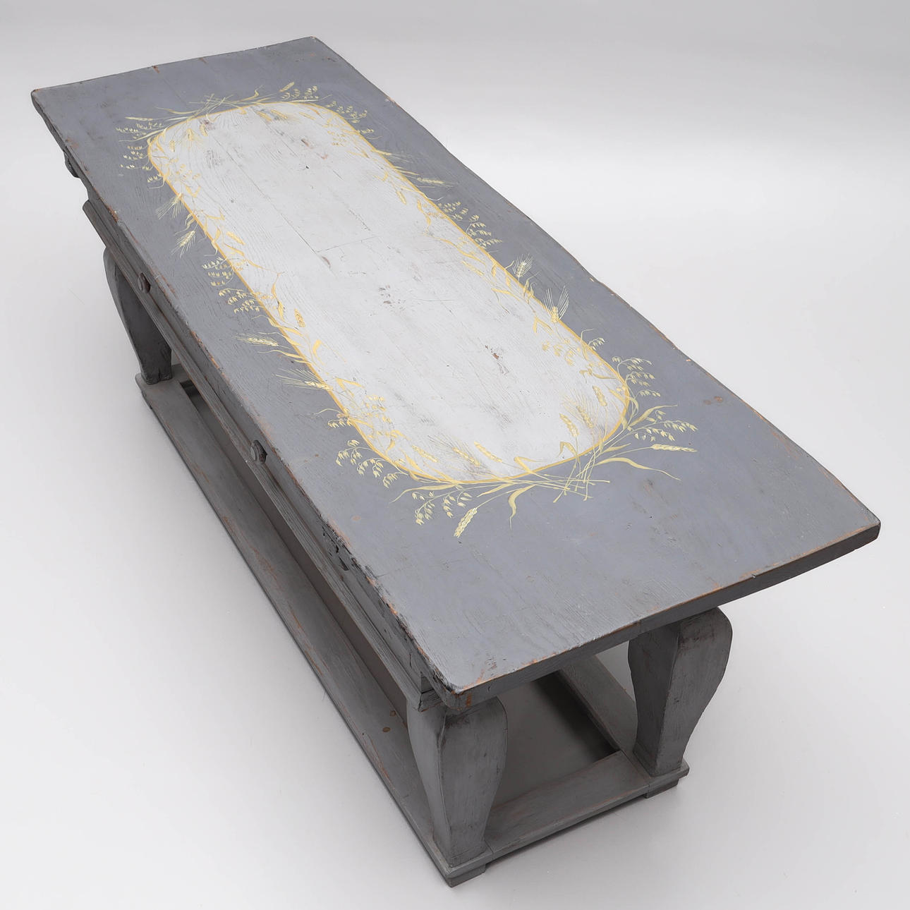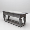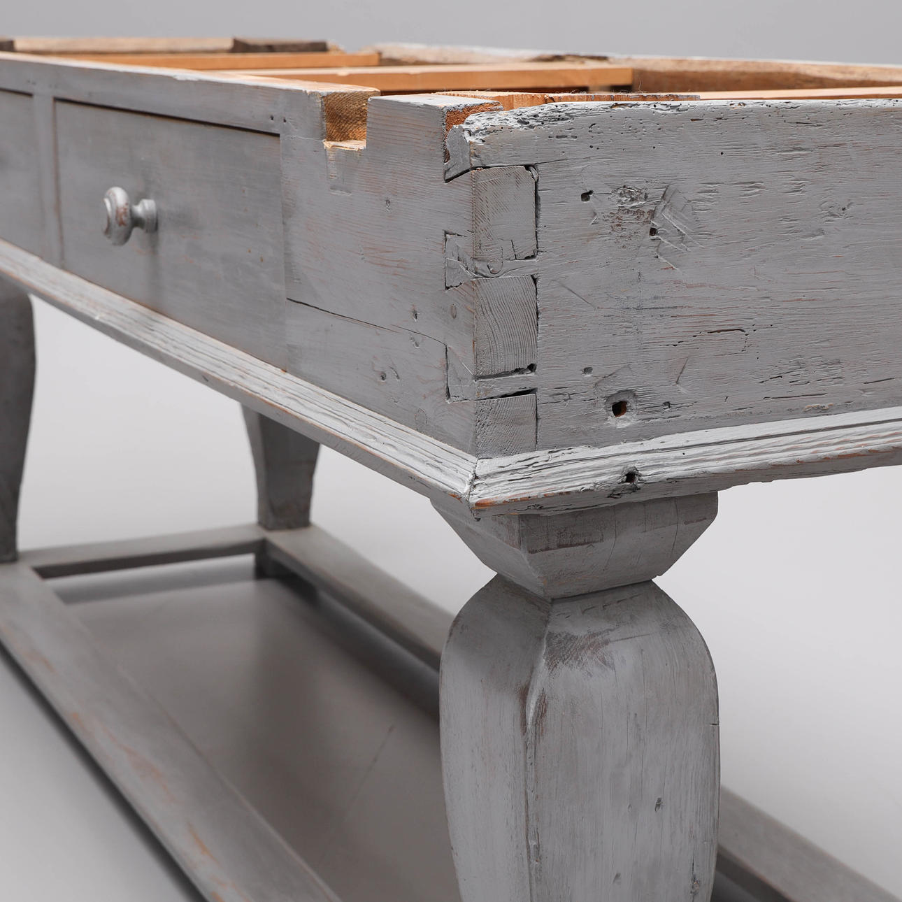 Later renovated and supplemented, among other things, the drawers internally redesigned. Later painted. Worm tongue. Usage and age-related wear.