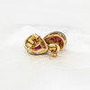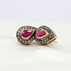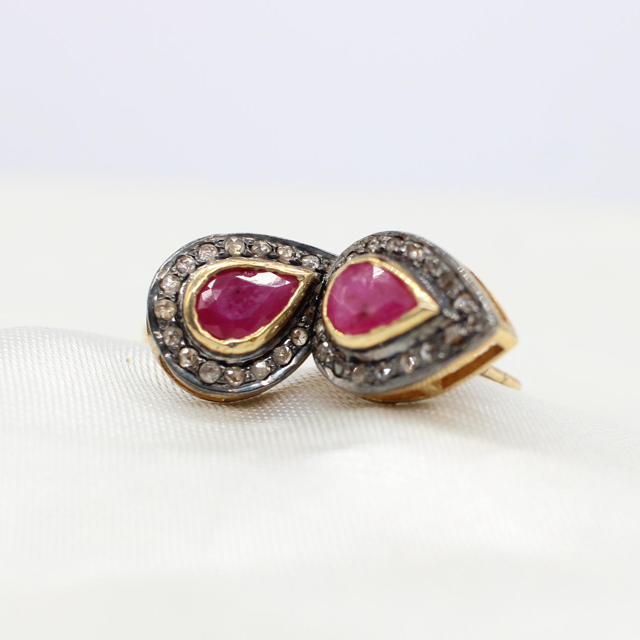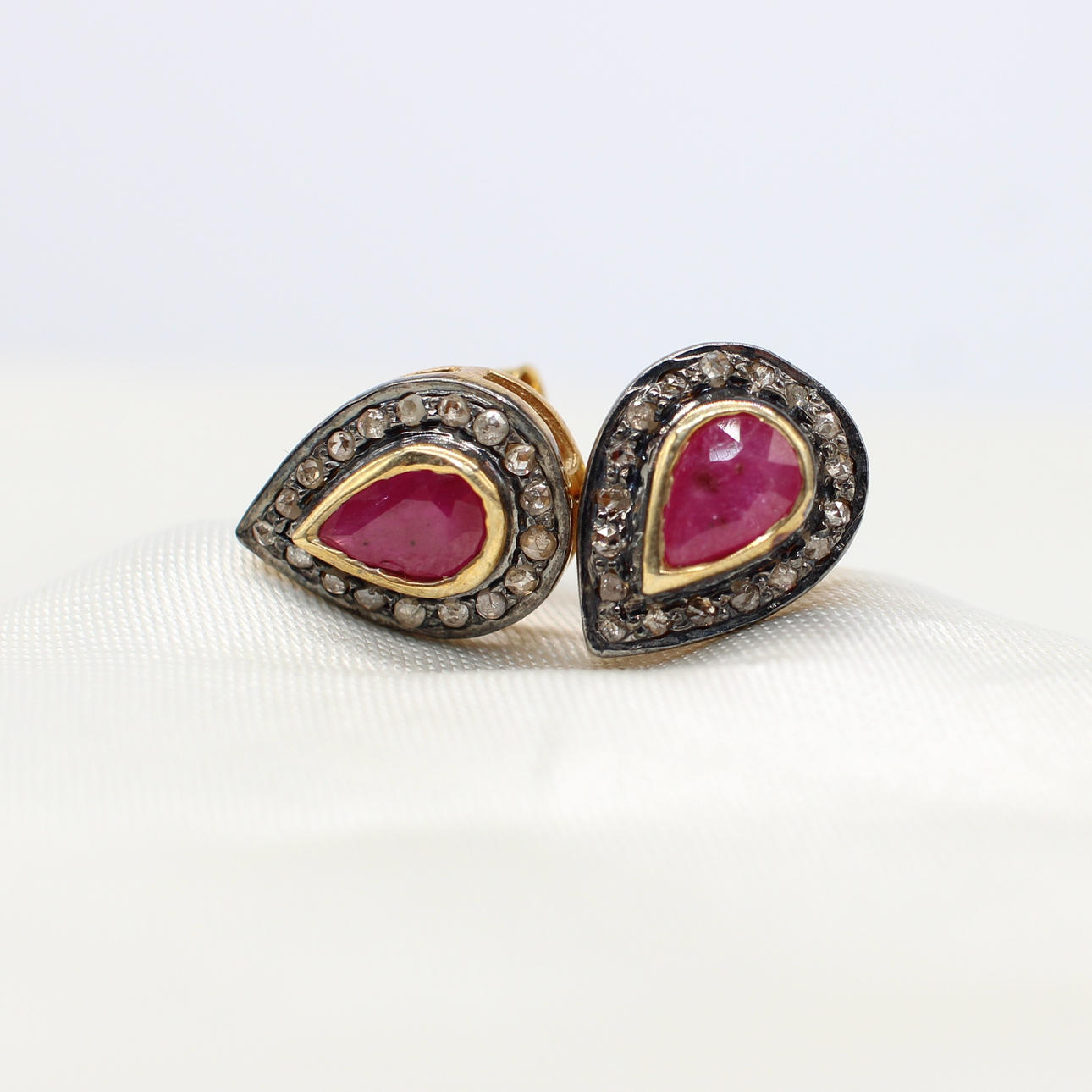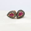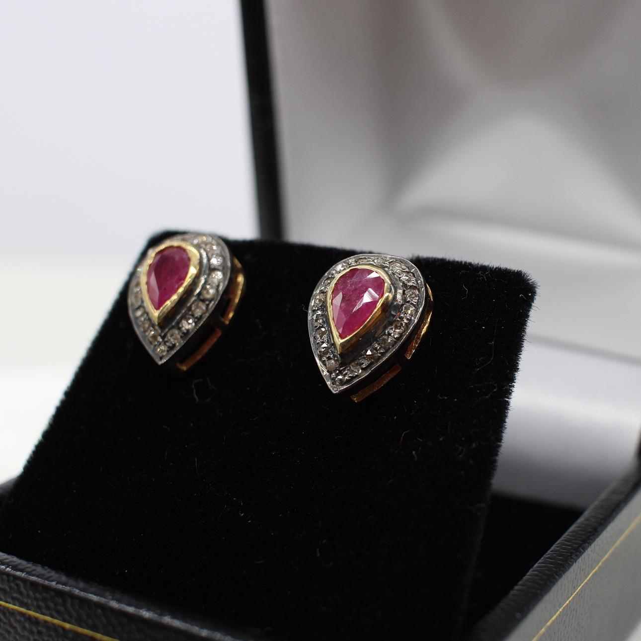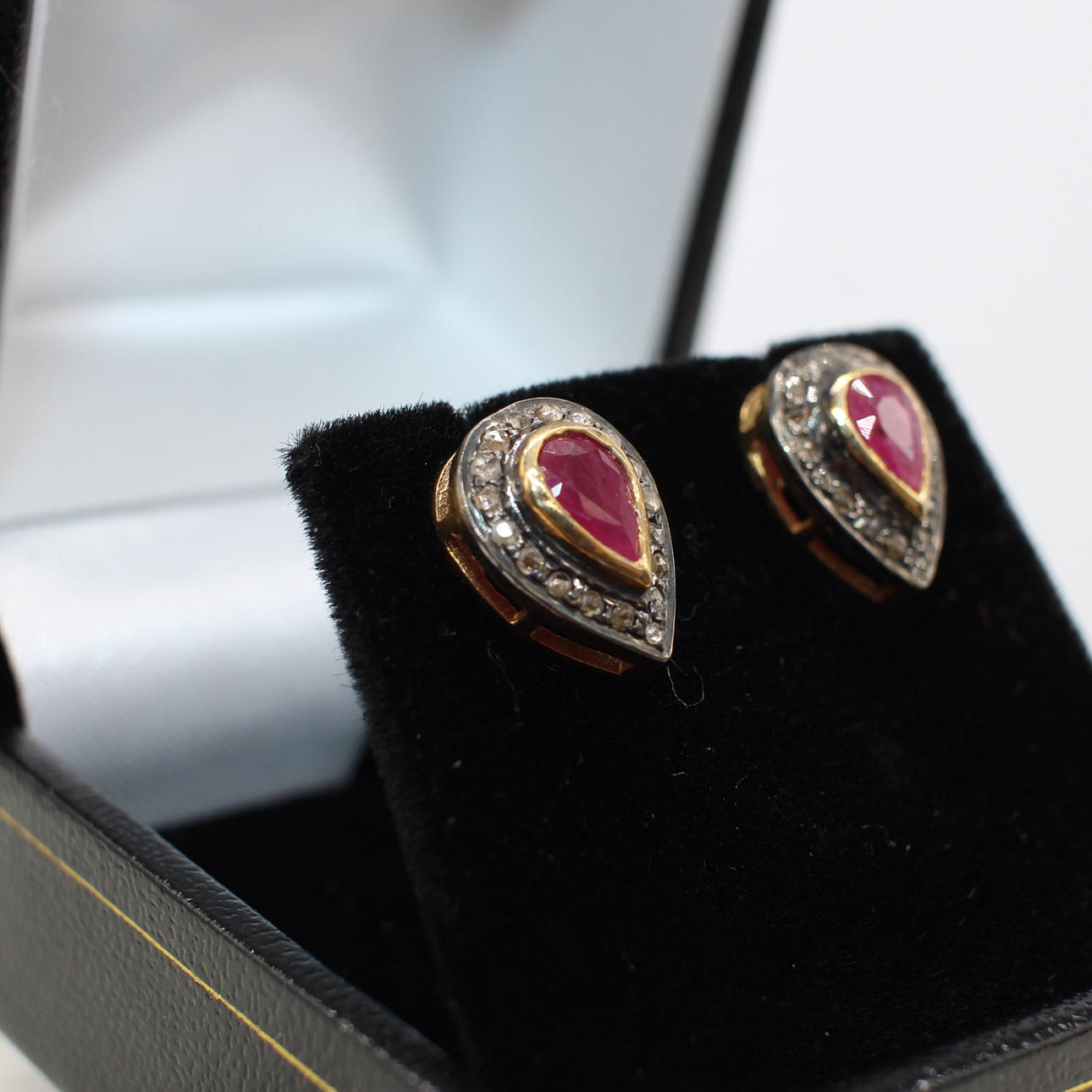 A pair of silver gold plated (stamped 925) pear shaped earrings set with pear shaped ruby and rose cut diamond halo.