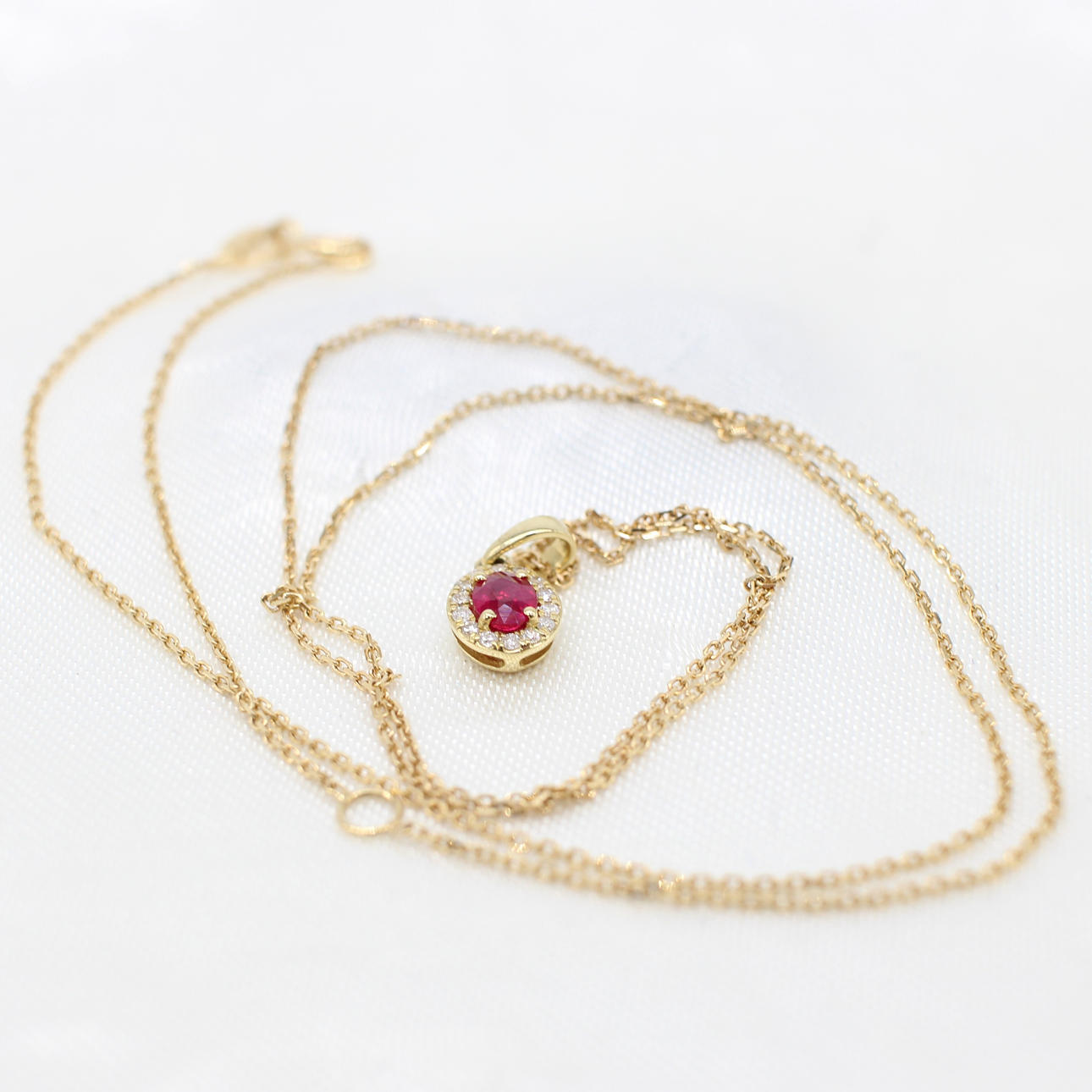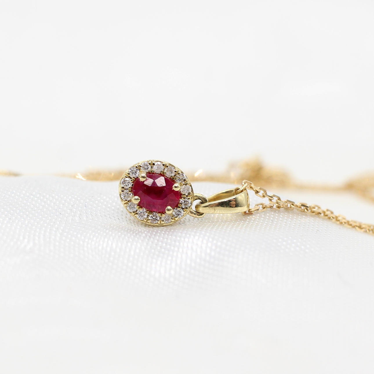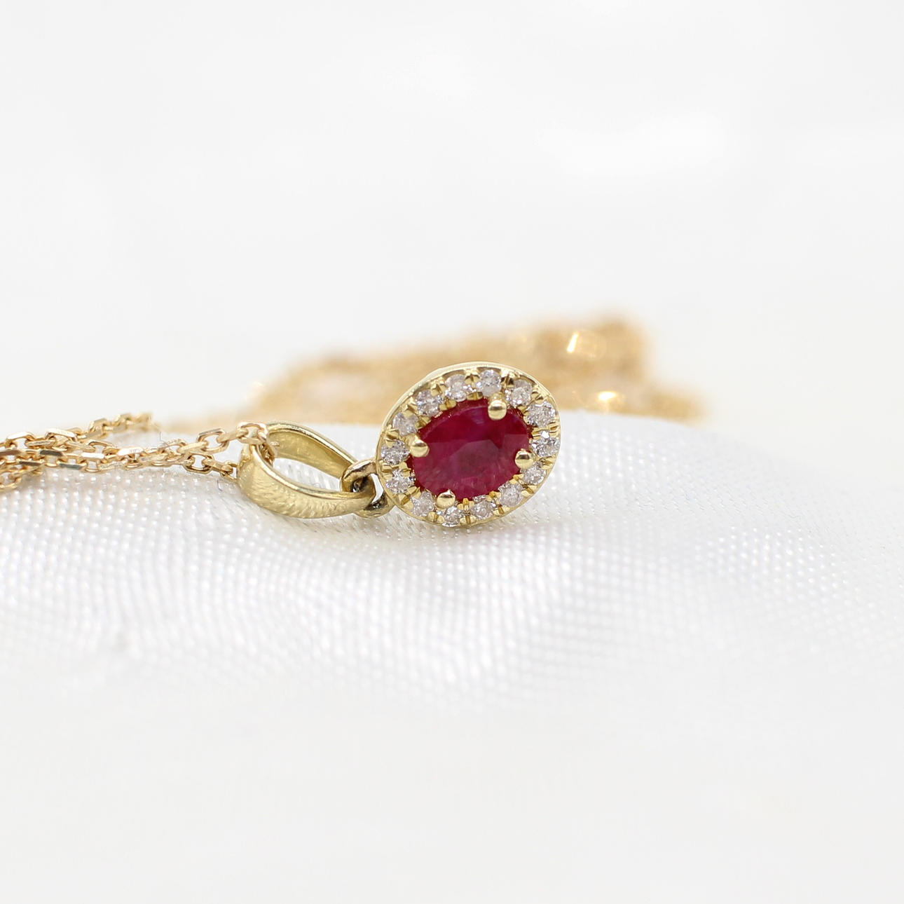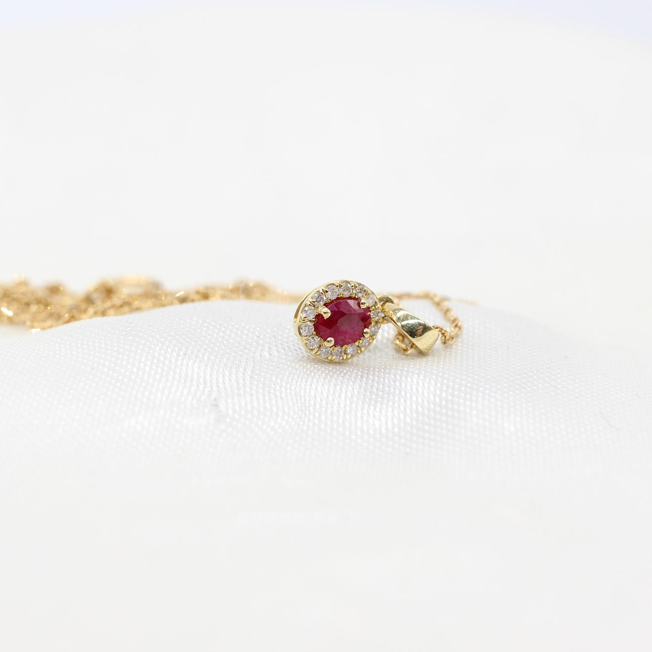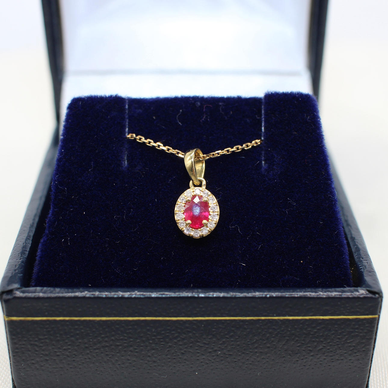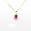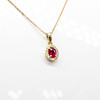 A 9k yellow gold oval ruby and round brilliant cut diamond cluster pendant on a 9k yellow gold chain.