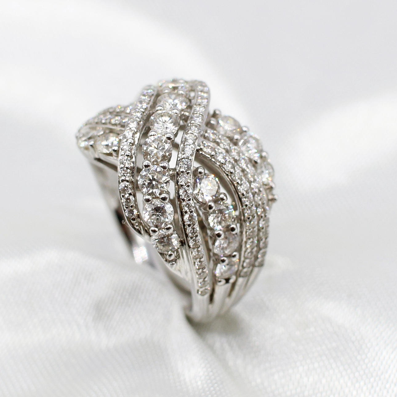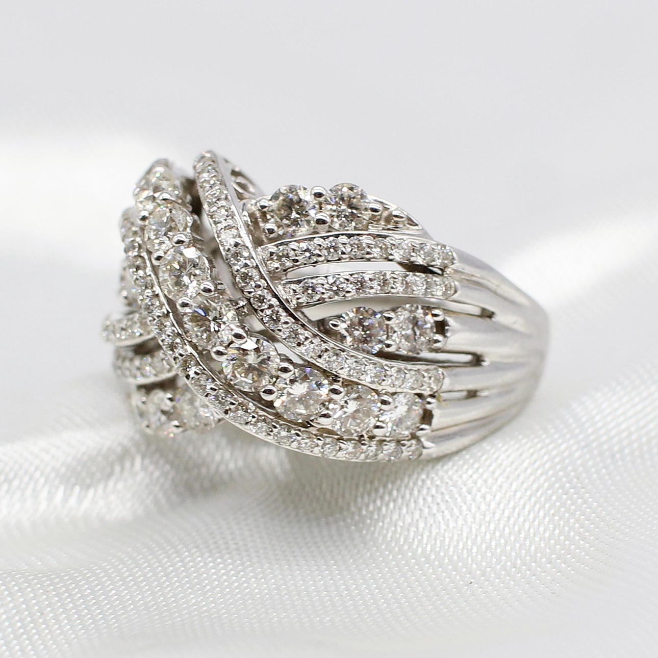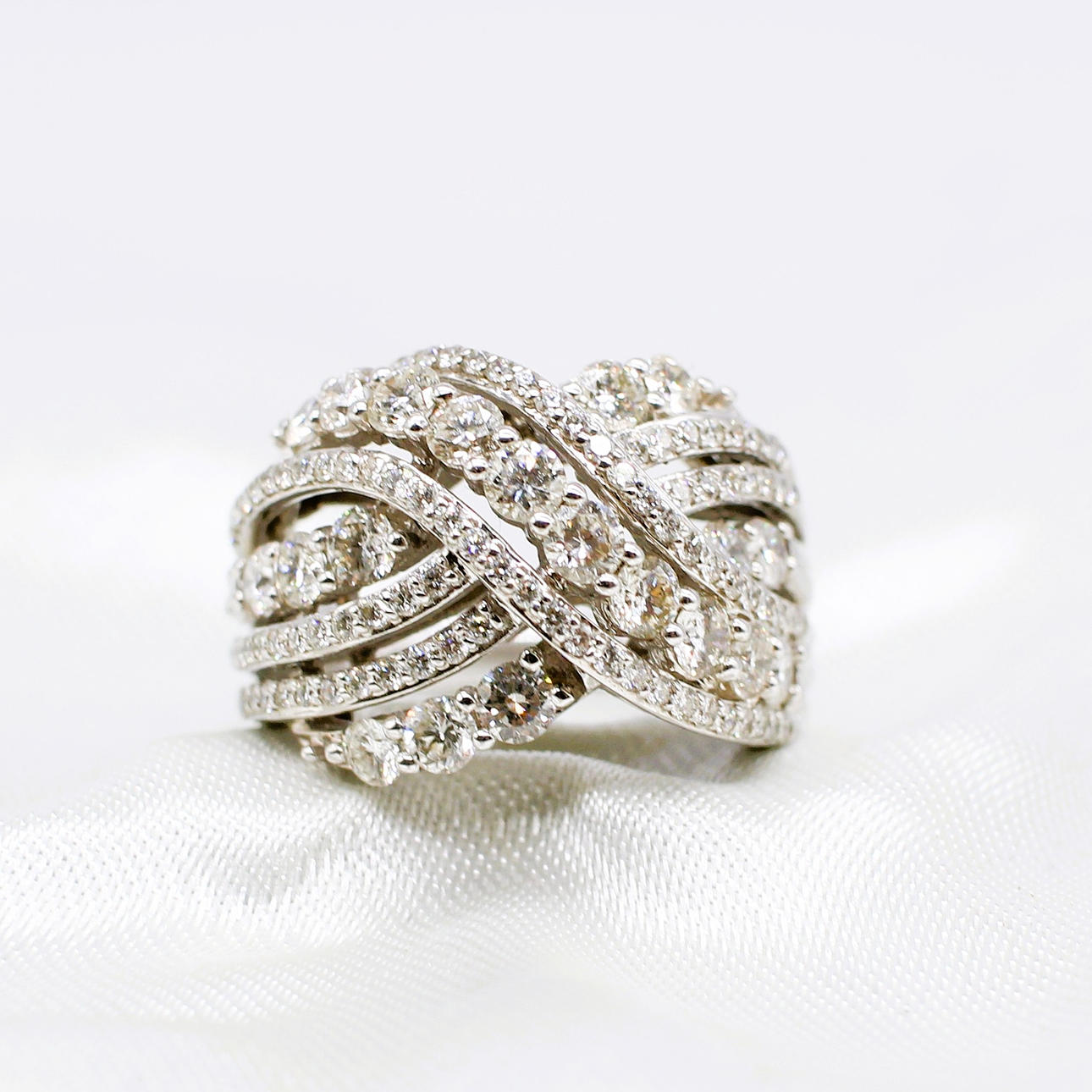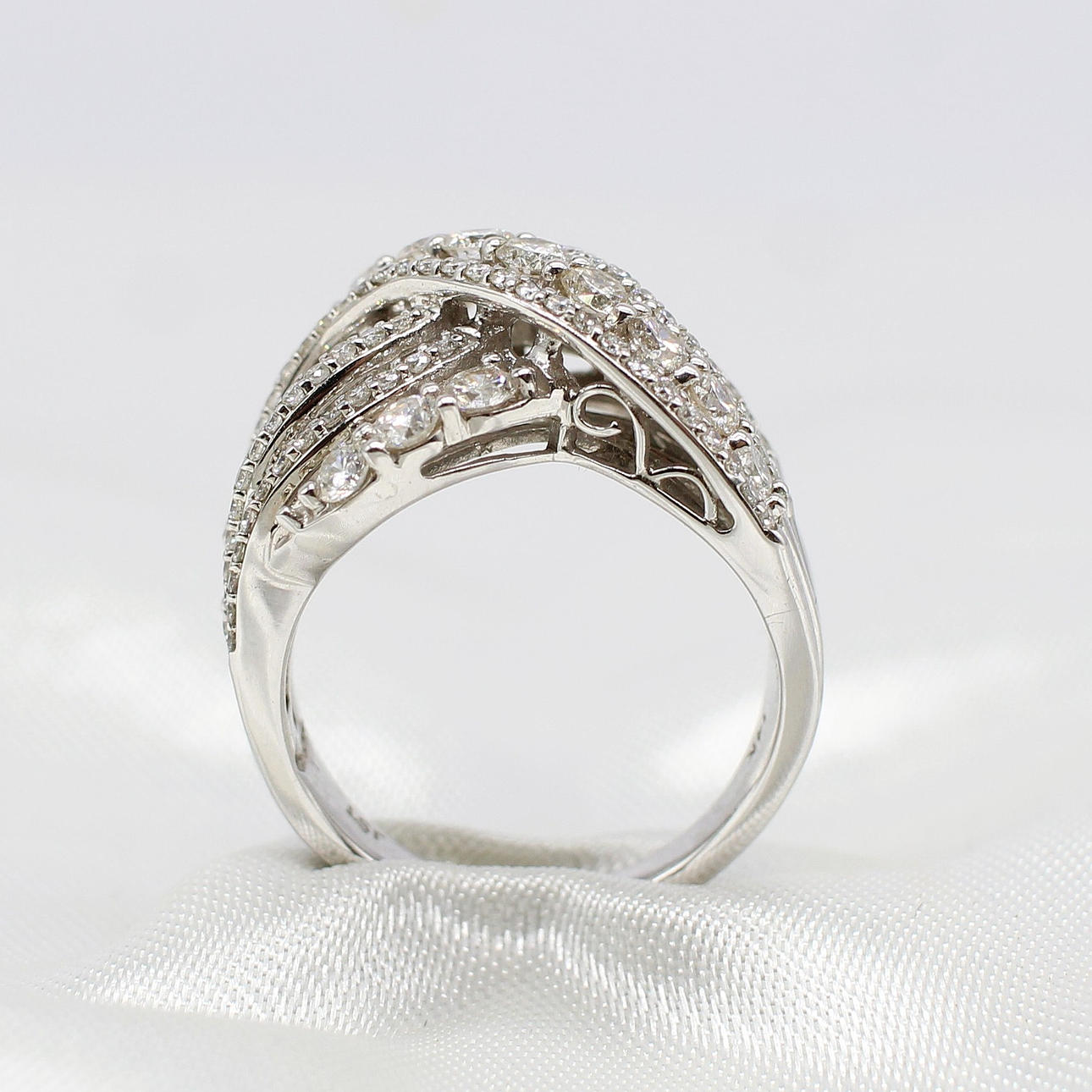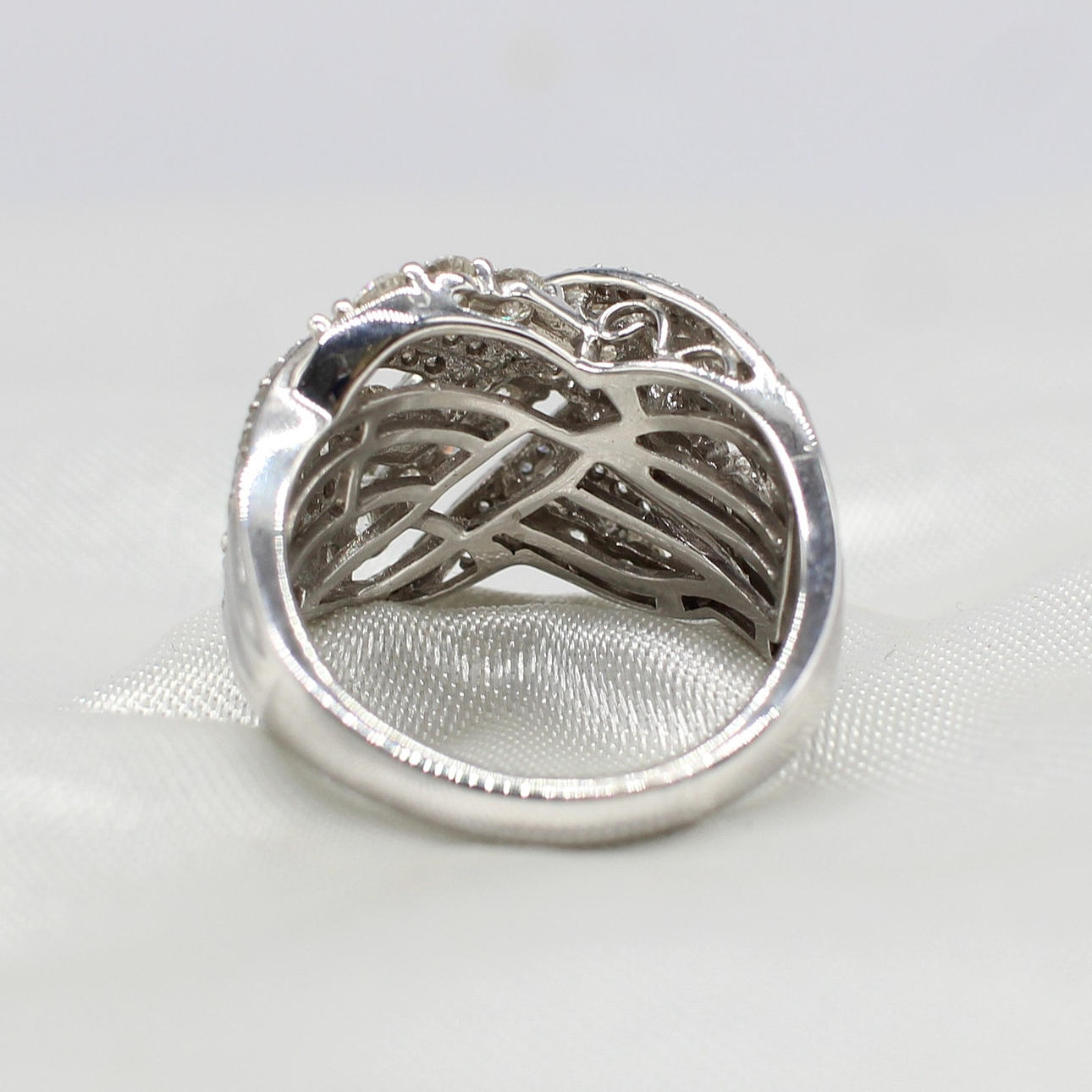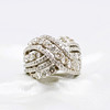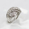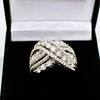 A Large And Impressive 14K (Stamped 14K) White Gold Round Brilliant Cut Diamond Cluster Cross Over Ring.